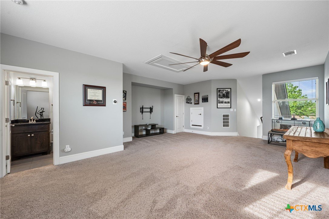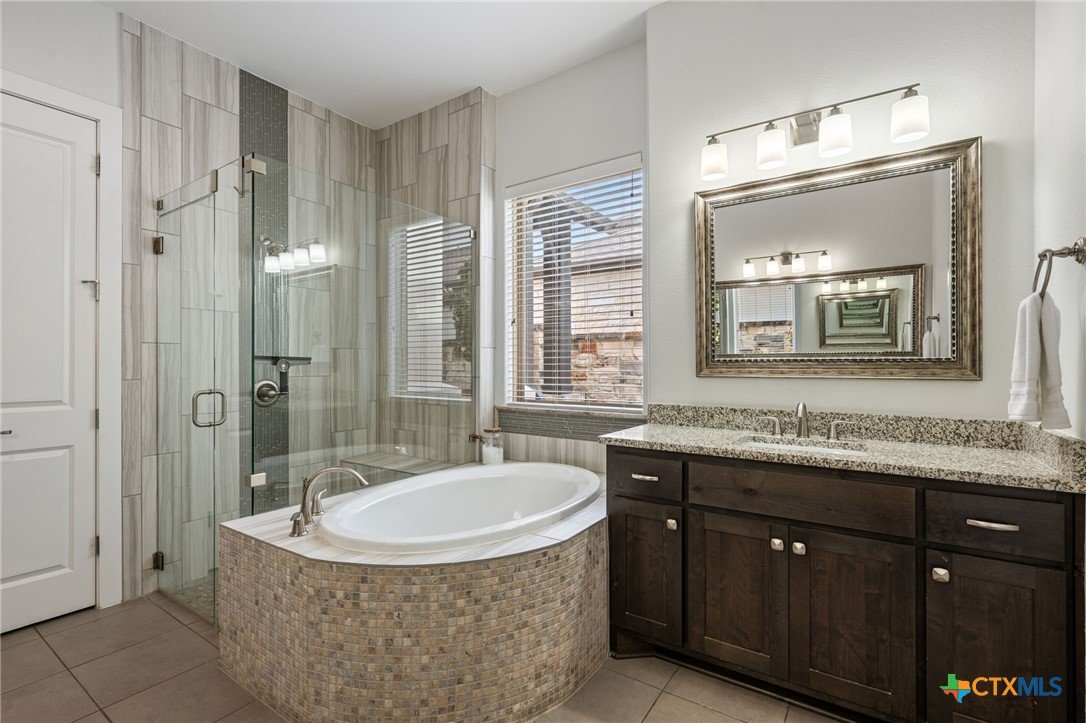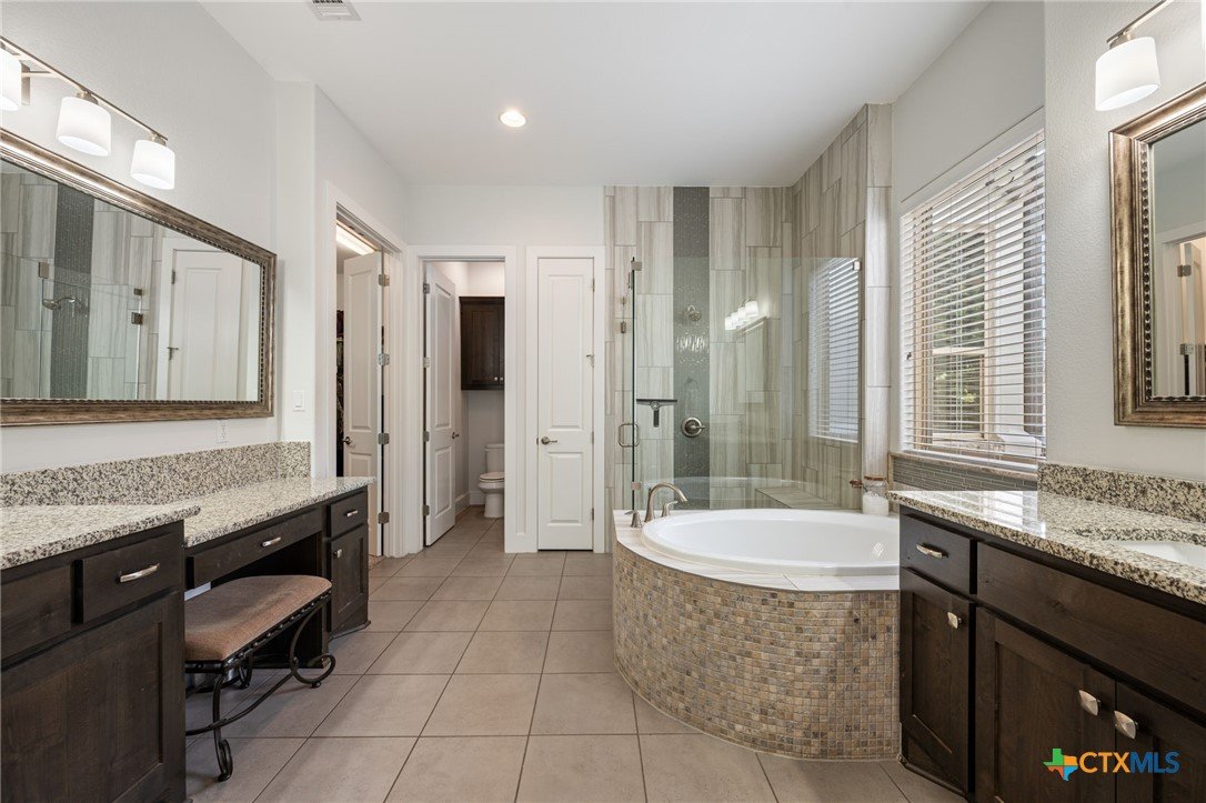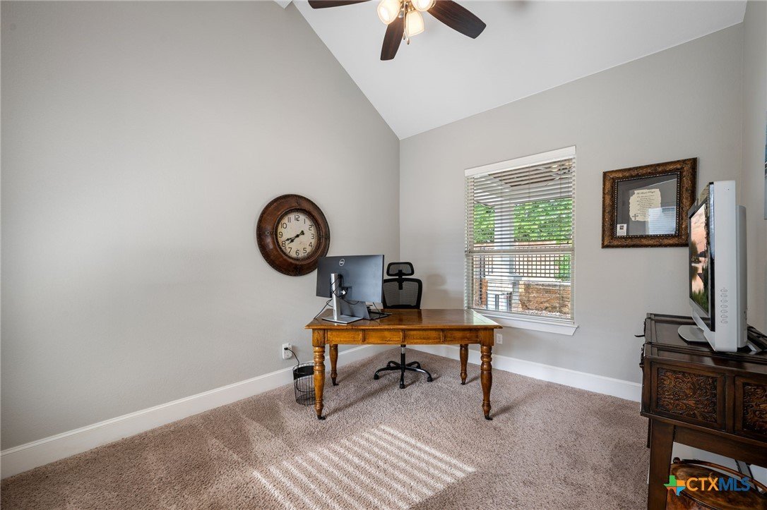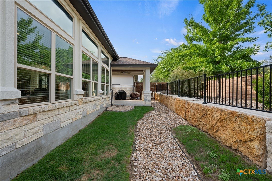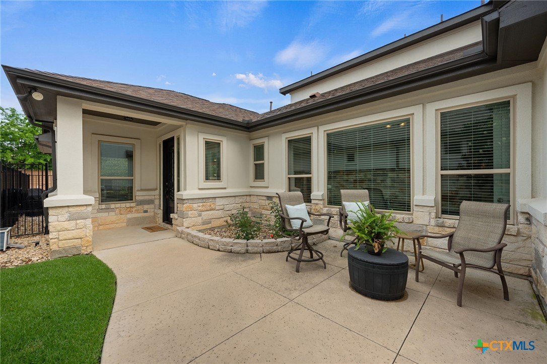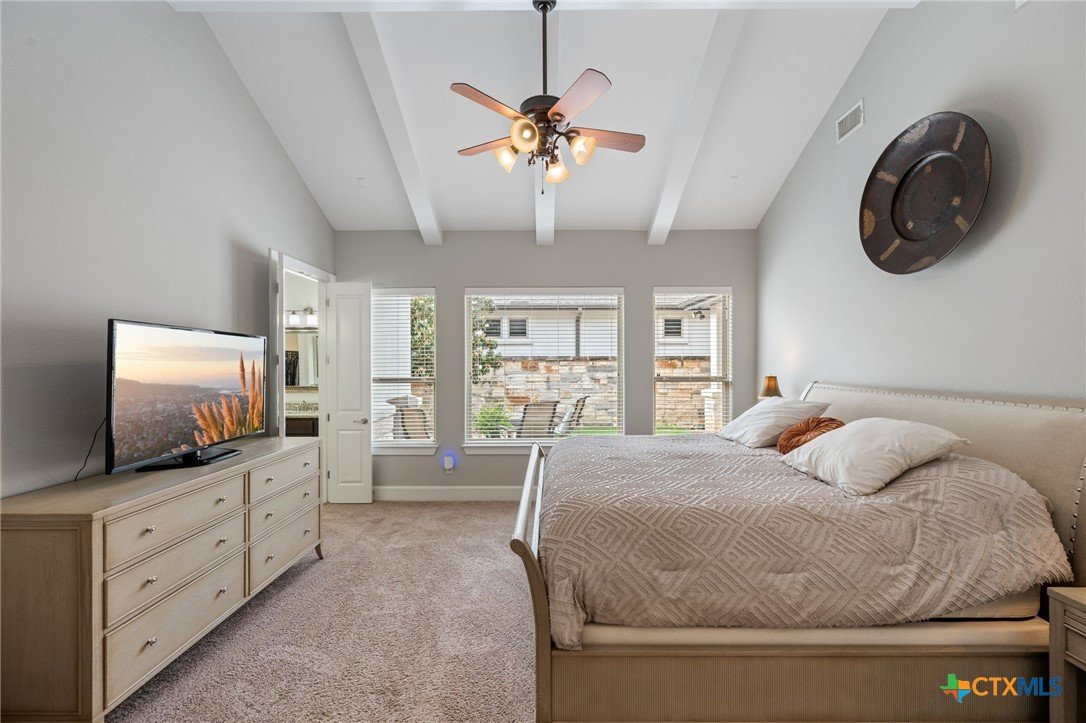 Refined living at it's best in this stunning former model home, featuring a rare detached casita—an exclusive floor plan you won’t find anywhere else in Georgetown’s coveted Gardens at Verde Vista. Tucked within a private, vibrant community, this beautifully maintained 4-bedroom, 4-bath, plus dedicated office and loft in the main residence, offers a seamless blend of style, comfort, and versatility designed for today’s lifestyle. From the moment you enter, you’re greeted by abundant natural light, soaring ceilings, and an open-concept layout that effortlessly connects the main living spaces. Designer wood-look tile flooring flows throughout the common areas, complementing the upgraded stainless steel appliances and thoughtfully designed kitchen that’s perfect for both everyday living and entertaining. The Primary Bedroom offers a tranquil retreat with high, beamed ceilings, an en-suite bathroom that has granite separate vanities, a relaxing soaking tub and walk in shower. A dedicated office provides the ideal work-from-home setup, while upstairs the bonus room offers flexible space for relaxation or play. The detached casita with its own private entrance and full bath, creates endless possibilities—ideal for guests, multigenerational living, or a private studio retreat. Outdoors, enjoy a beautifully landscaped courtyard complete with a cozy fireplace, along with a covered back patio for easy enjoyment. Built for efficiency and peace of mind, the home features a tankless water heater, zoned HVAC with filtration, and a low tax rate with no MUD or PID. Ideally located just moments from the community center with both fitness and event space, as well as a tranquil lake with water feature. Conveniently located near shopping, dining, parks, and Lake Georgetown, this truly is the perfect location. With quick access to top-rated schools and the charm of Georgetown Square, this home offers an exceptional lifestyle in a truly one-of-a-kind setting.