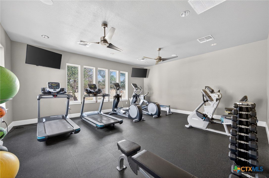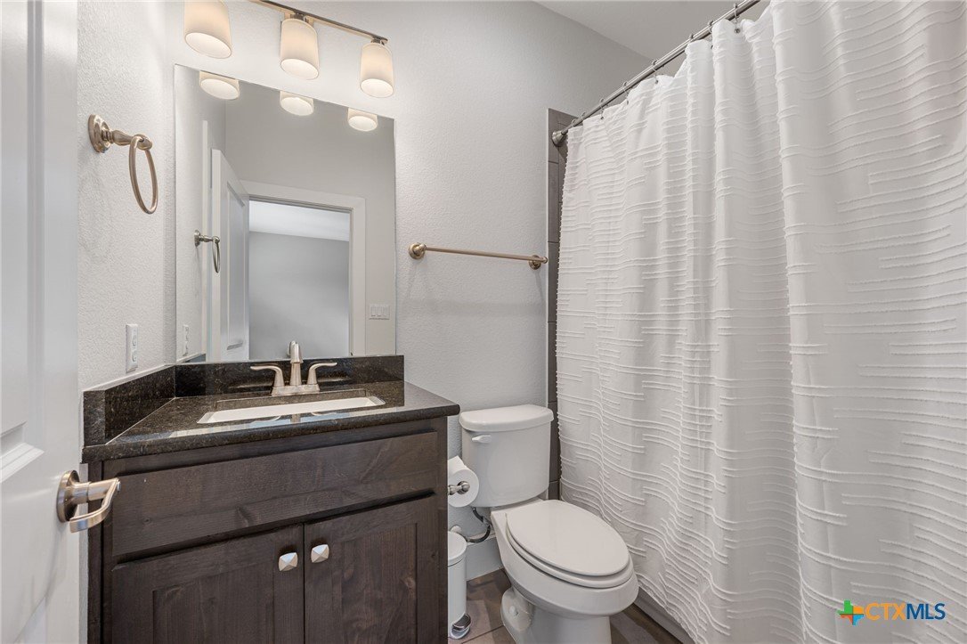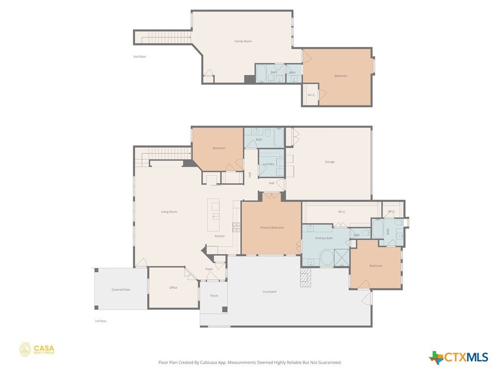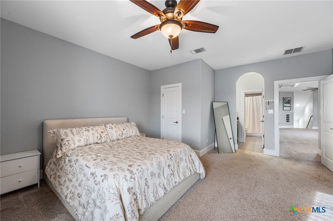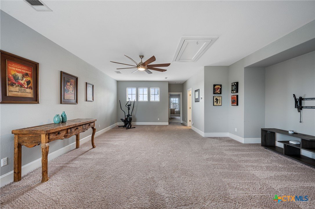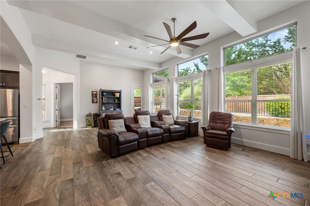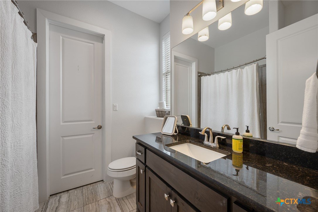 Refined living at it's best in this stunning former model home, featuring a rare detached casita—an exclusive floor plan you won’t find anywhere else in Georgetown’s coveted Gardens at Verde Vista. Tucked within a private, vibrant community, this beautifully maintained 4-bedroom, 4-bath, plus dedicated office and loft in the main residence, offers a seamless blend of style, comfort, and versatility designed for today’s lifestyle. From the moment you enter, you’re greeted by abundant natural light, soaring ceilings, and an open-concept layout that effortlessly connects the main living spaces. Designer wood-look tile flooring flows throughout the common areas, complementing the upgraded stainless steel appliances and thoughtfully designed kitchen that’s perfect for both everyday living and entertaining. The Primary Bedroom offers a tranquil retreat with high, beamed ceilings, an en-suite bathroom that has granite separate vanities, a relaxing soaking tub and walk in shower. A dedicated office provides the ideal work-from-home setup, while upstairs the bonus room offers flexible space for relaxation or play. The detached casita with its own private entrance and full bath, creates endless possibilities—ideal for guests, multigenerational living, or a private studio retreat. Outdoors, enjoy a beautifully landscaped courtyard complete with a cozy fireplace, along with a covered back patio for easy enjoyment. Built for efficiency and peace of mind, the home features a tankless water heater, zoned HVAC with filtration, and a low tax rate with no MUD or PID. Ideally located just moments from the community center with both fitness and event space, as well as a tranquil lake with water feature. Conveniently located near shopping, dining, parks, and Lake Georgetown, this truly is the perfect location. With quick access to top-rated schools and the charm of Georgetown Square, this home offers an exceptional lifestyle in a truly one-of-a-kind setting.