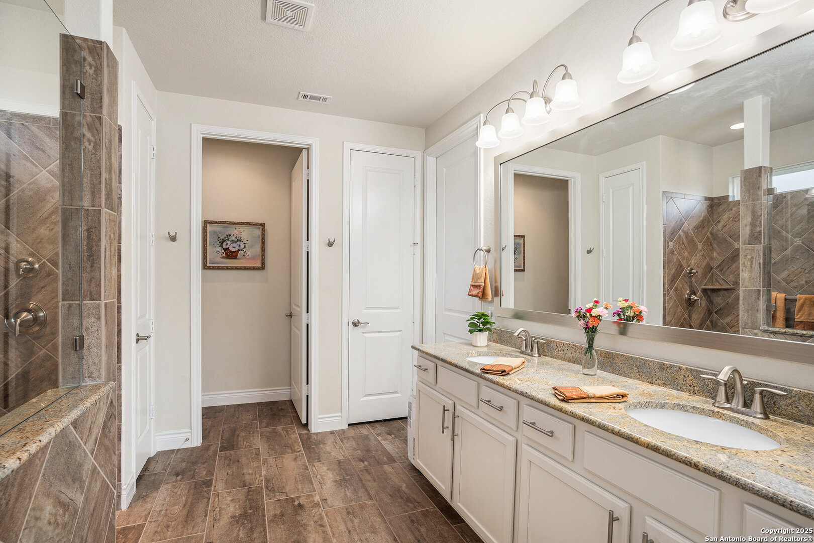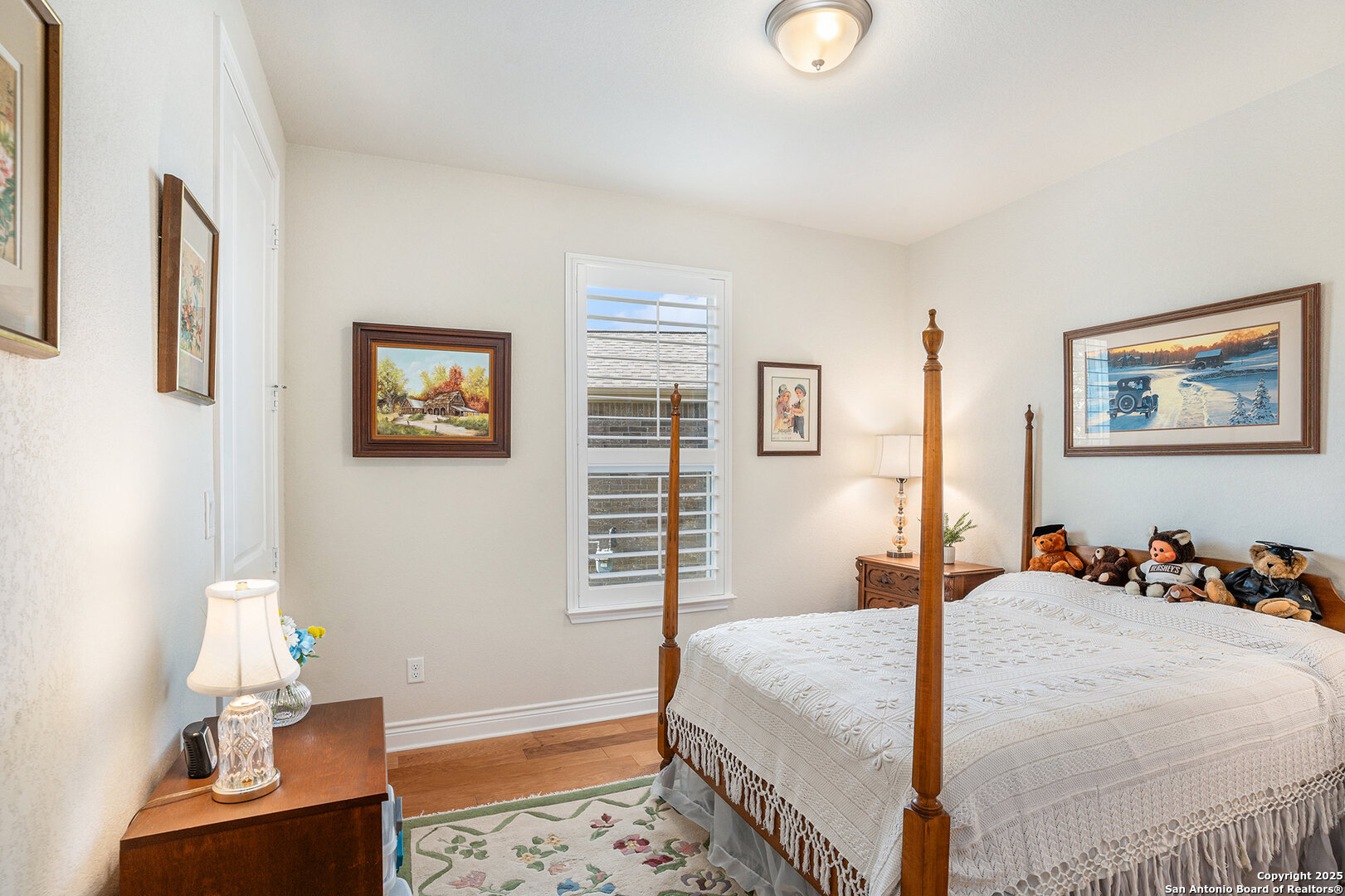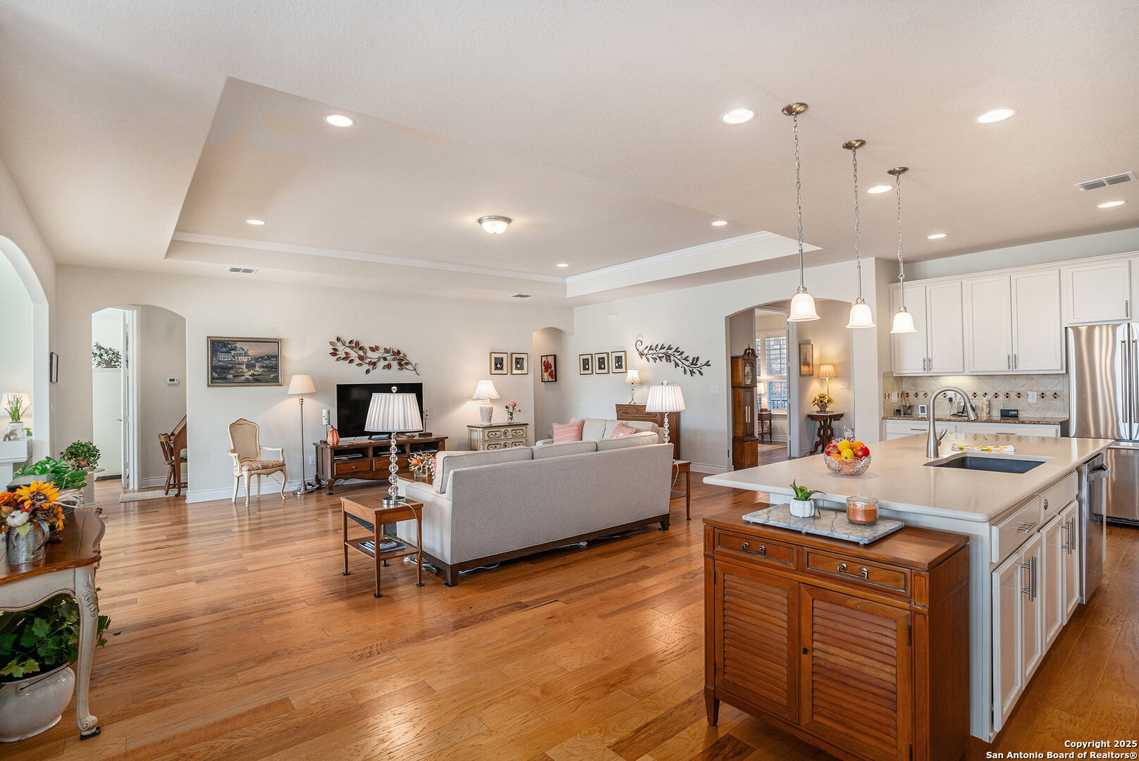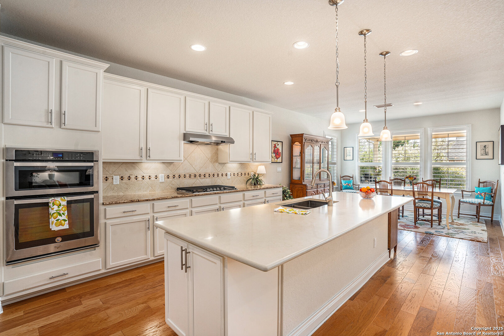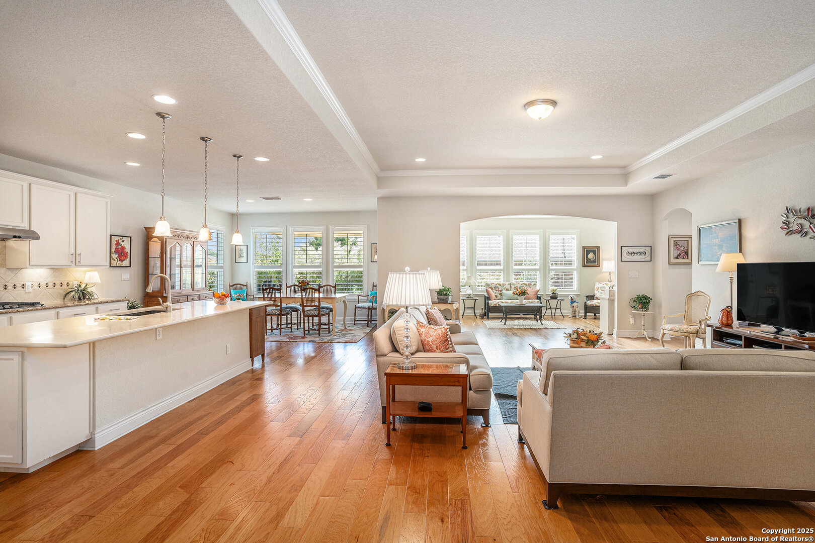 Welcome to this spacious 3-bedroom, 3-bath, 2-car garage home on a corner lot in Hill Country Retreat, a vibrant 55+ community with indoor/outdoor pools, hot tub, bocce, pickleball, tennis, fitness center, library, and many social activities. The open-concept layout features a chef's kitchen with custom cabinets, Silestone quartz, gas appliances, built-in oven/microwave, walk-in pantry, and hardwood floors throughout main living areas. The primary suite offers hardwood floors, tray ceiling, plantation shutters, walk-in closet, and luxurious bath with tile floors, double vanity, and roll-in shower. Secondary bedrooms and baths feature hardwood, tile, granite, and custom cabinetry. Flex spaces, sunroom, and office with built-ins provide versatility. Outside, enjoy a professionally landscaped yard, covered/extended patios, gas line for grill, mature trees, sprinklers, gutters, solar screens, and wrought iron fence. Epoxy garage floors and water softener complete this move-in ready home.