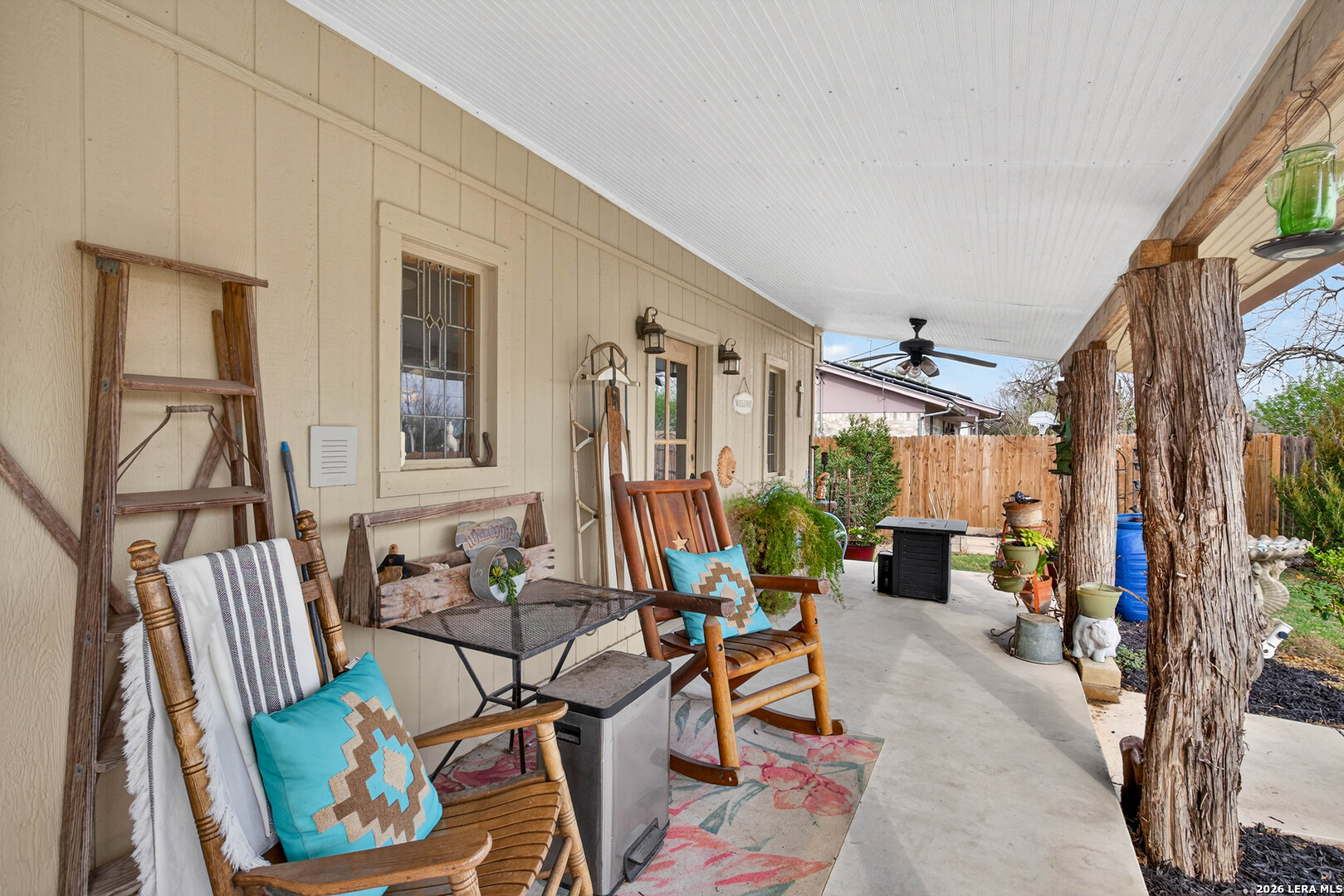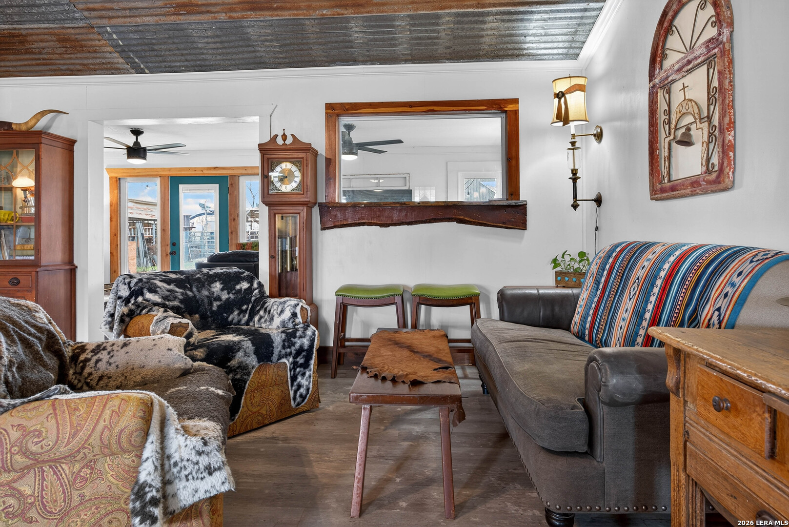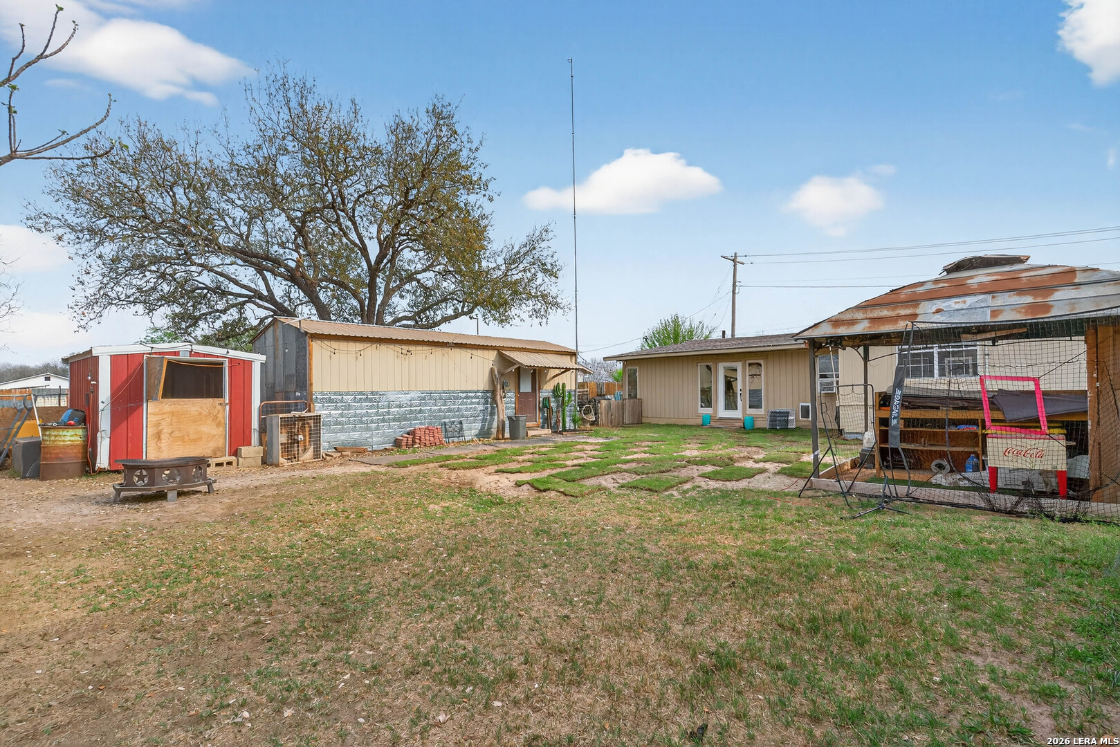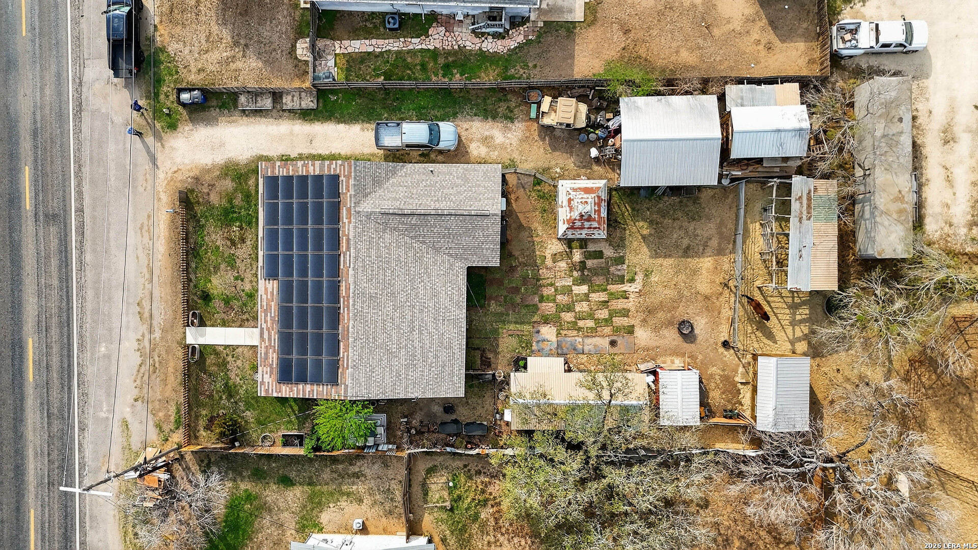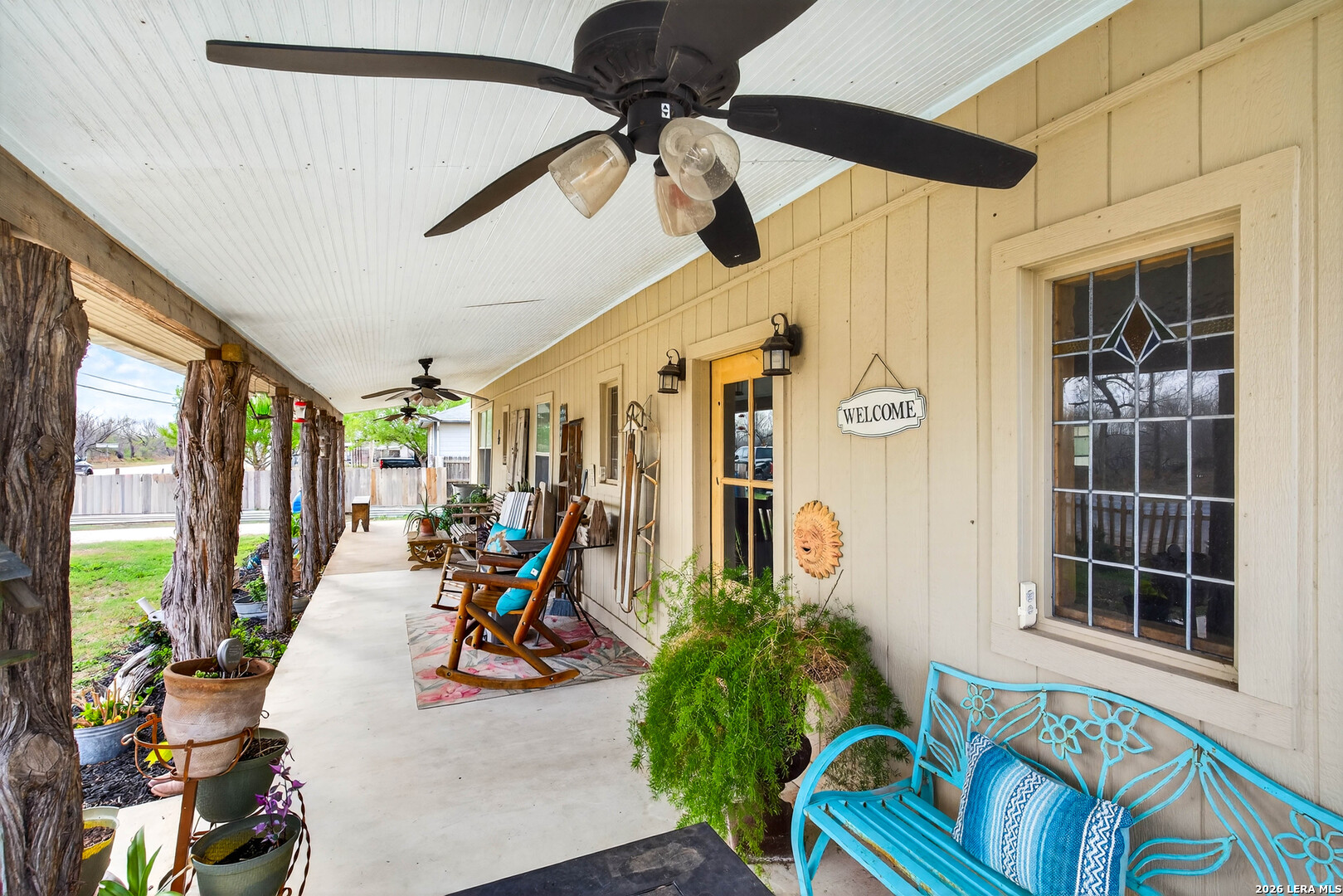 SINGLE STORY COUNTRY CHARM!!! Enjoy the freedom of country living on an oversized lot with no HOA and endless possibilities. This charming single-story home welcomes you with a full-length cedar post front porch and an inviting outdoor gazebo, perfect for relaxing and enjoying wide open space. The property is ideal for hobbyists, homesteaders, or anyone needing room to spread out, featuring a large workshop, additional tack building, chicken coop building, and a versatile 10x20 outbuilding with electricity, water, and washer/dryer hookups-perfect for a future casita or guest retreat. Inside, the open floor plan offers a warm country feel with a unique interior tin sheet metal ceiling, leaded glass accent windows, and an island kitchen showcasing stainless steel appliances, solid wood countertops, and farmhouse hardware. Multiple mini-split HVAC systems and energy-efficient solar panels help keep utility costs down. The spacious primary suite features high ceilings, a large walk-in closet, and a separate shower and tub. Additional highlights include a dedicated media room and RV parking with cleanout-bringing together comfort, functionality, and true country charm. See this one TODAY!!