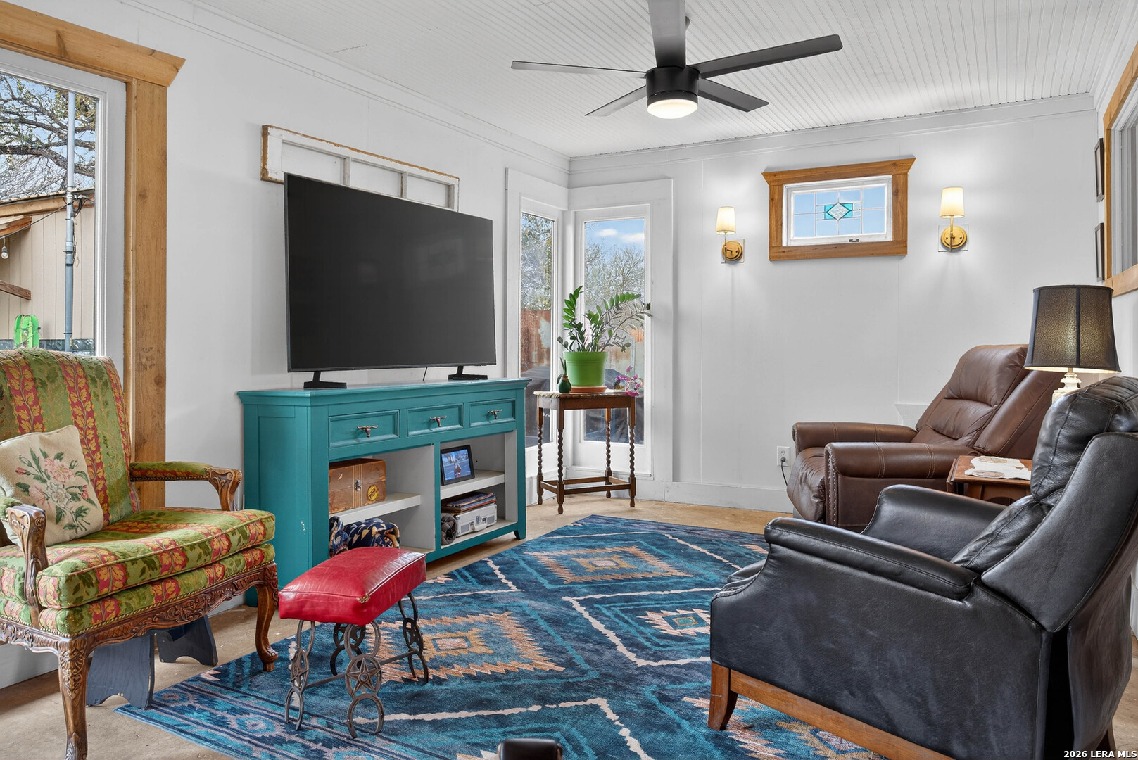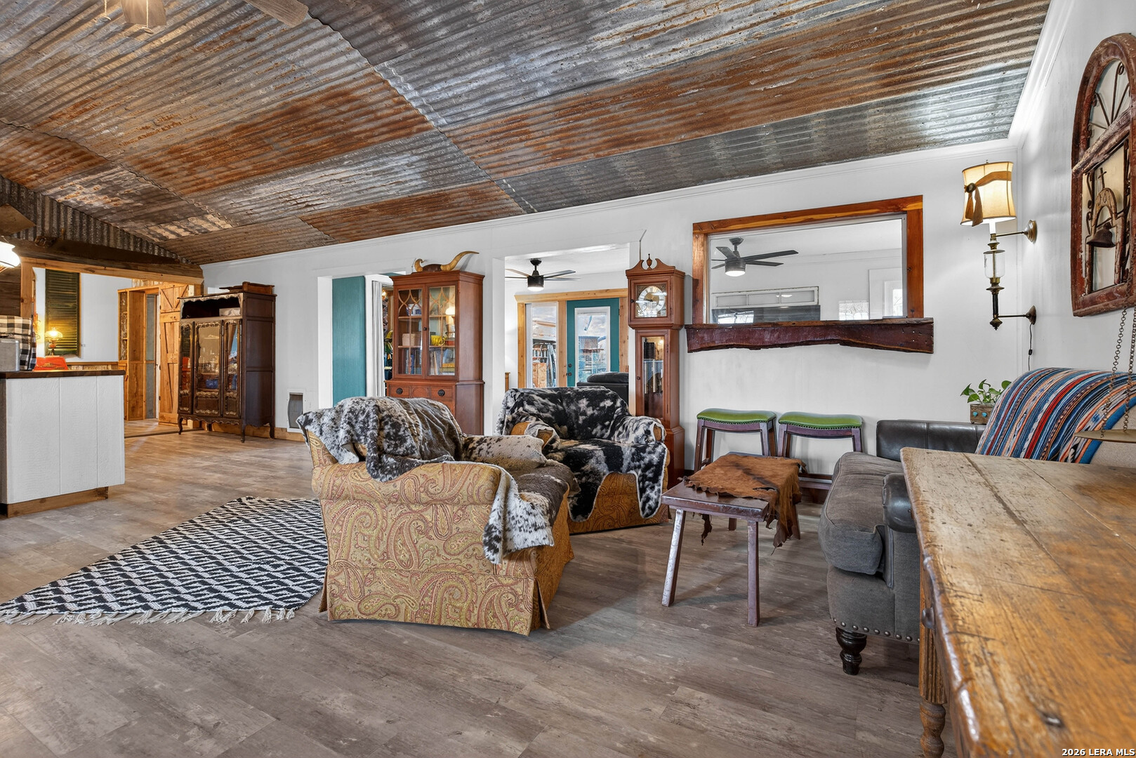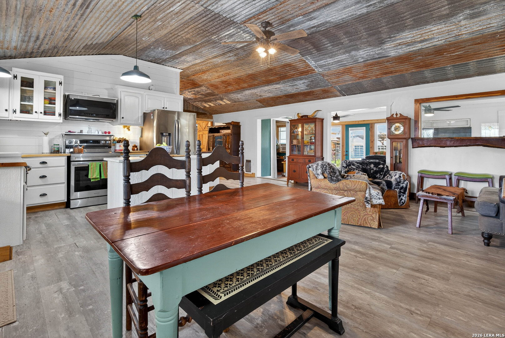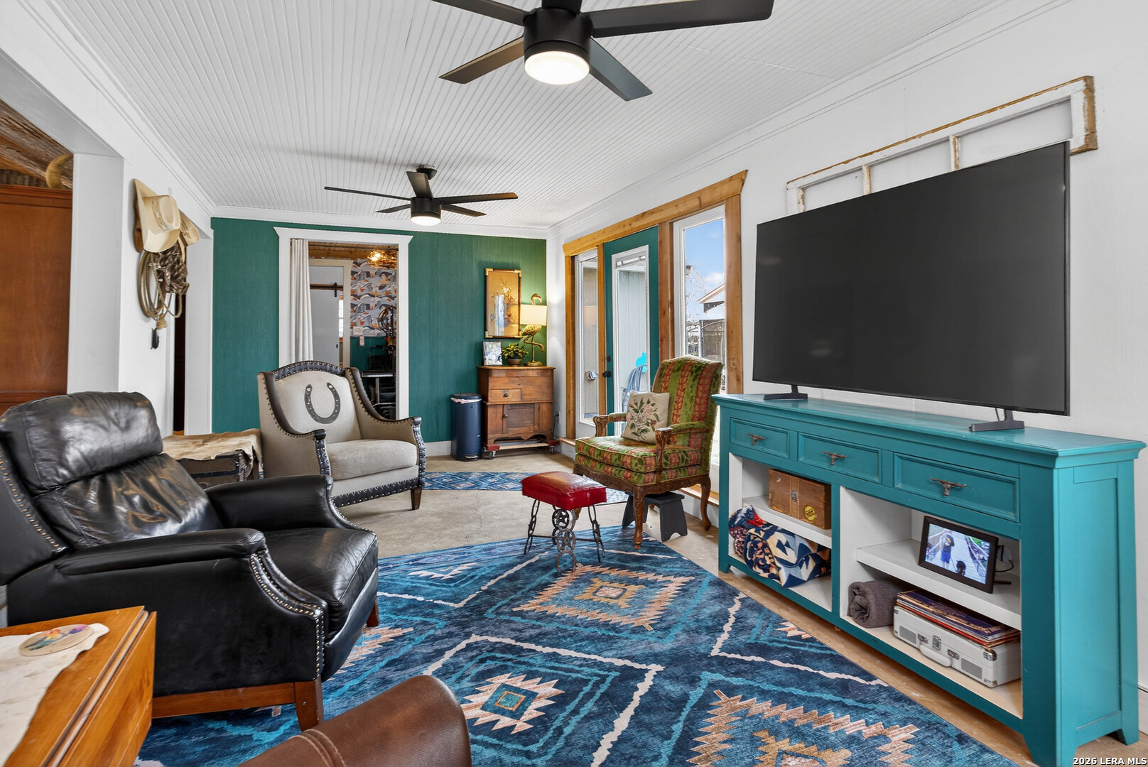 SINGLE STORY COUNTRY CHARM!!! Enjoy the freedom of country living on an oversized lot with no HOA and endless possibilities. This charming single-story home welcomes you with a full-length cedar post front porch and an inviting outdoor gazebo, perfect for relaxing and enjoying wide open space. The property is ideal for hobbyists, homesteaders, or anyone needing room to spread out, featuring a large workshop, additional tack building, chicken coop building, and a versatile 10x20 outbuilding with electricity, water, and washer/dryer hookups-perfect for a future casita or guest retreat. Inside, the open floor plan offers a warm country feel with a unique interior tin sheet metal ceiling, leaded glass accent windows, and an island kitchen showcasing stainless steel appliances, solid wood countertops, and farmhouse hardware. Multiple mini-split HVAC systems and energy-efficient solar panels help keep utility costs down. The spacious primary suite features high ceilings, a large walk-in closet, and a separate shower and tub. Additional highlights include a dedicated media room and RV parking with cleanout-bringing together comfort, functionality, and true country charm. See this one TODAY!!