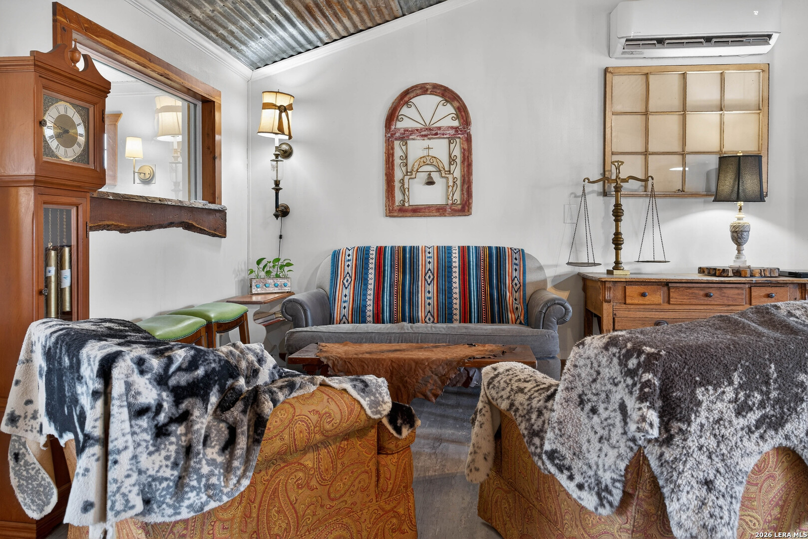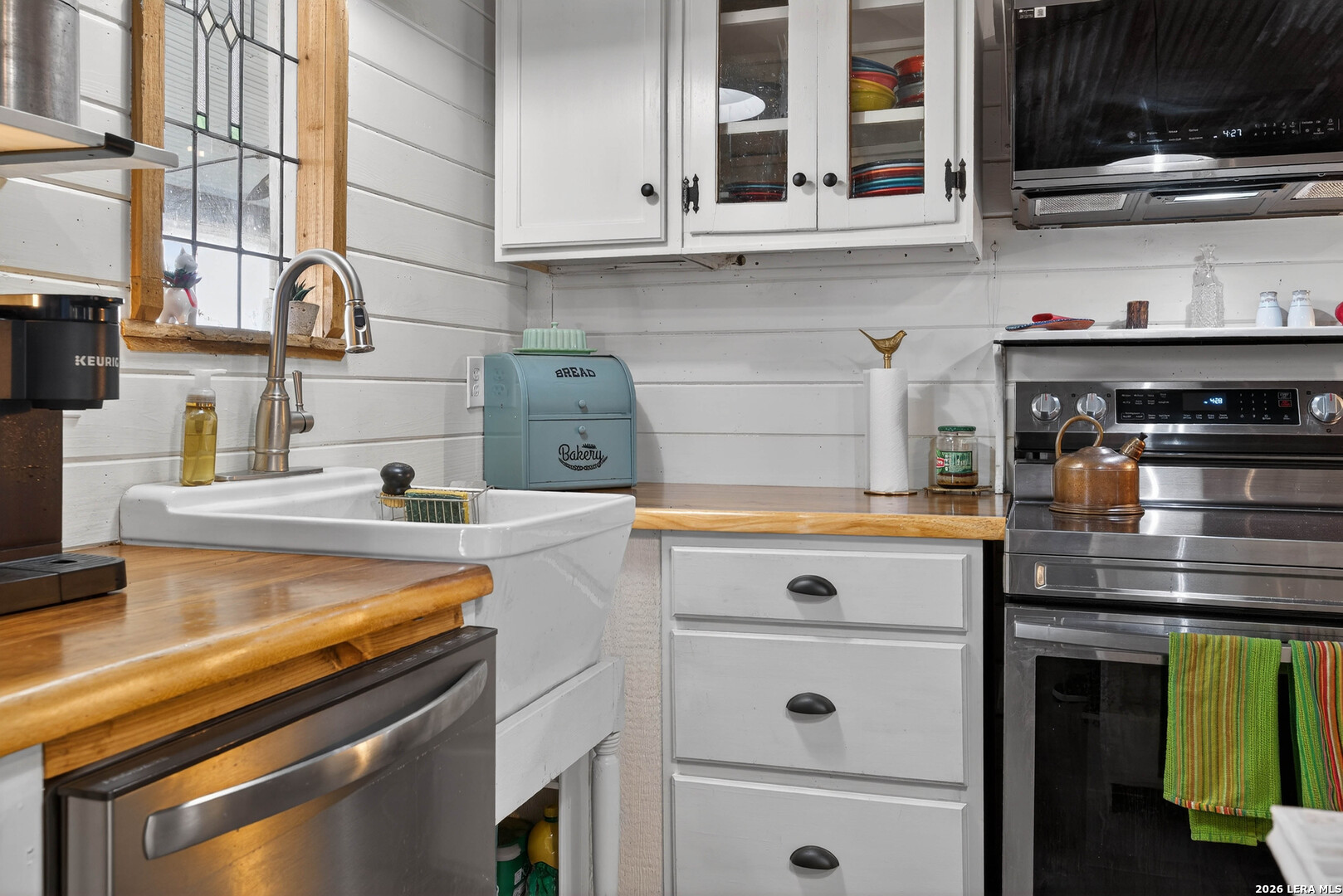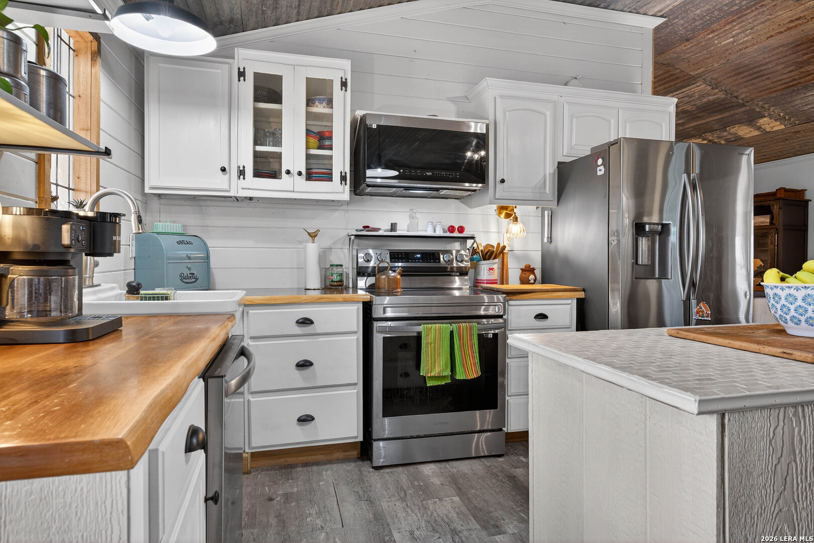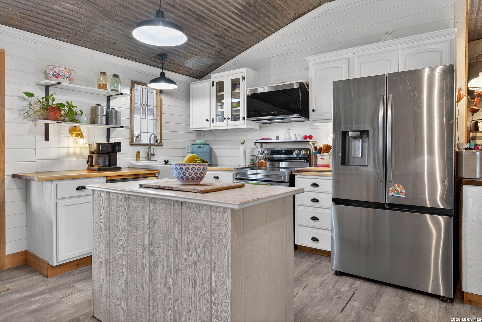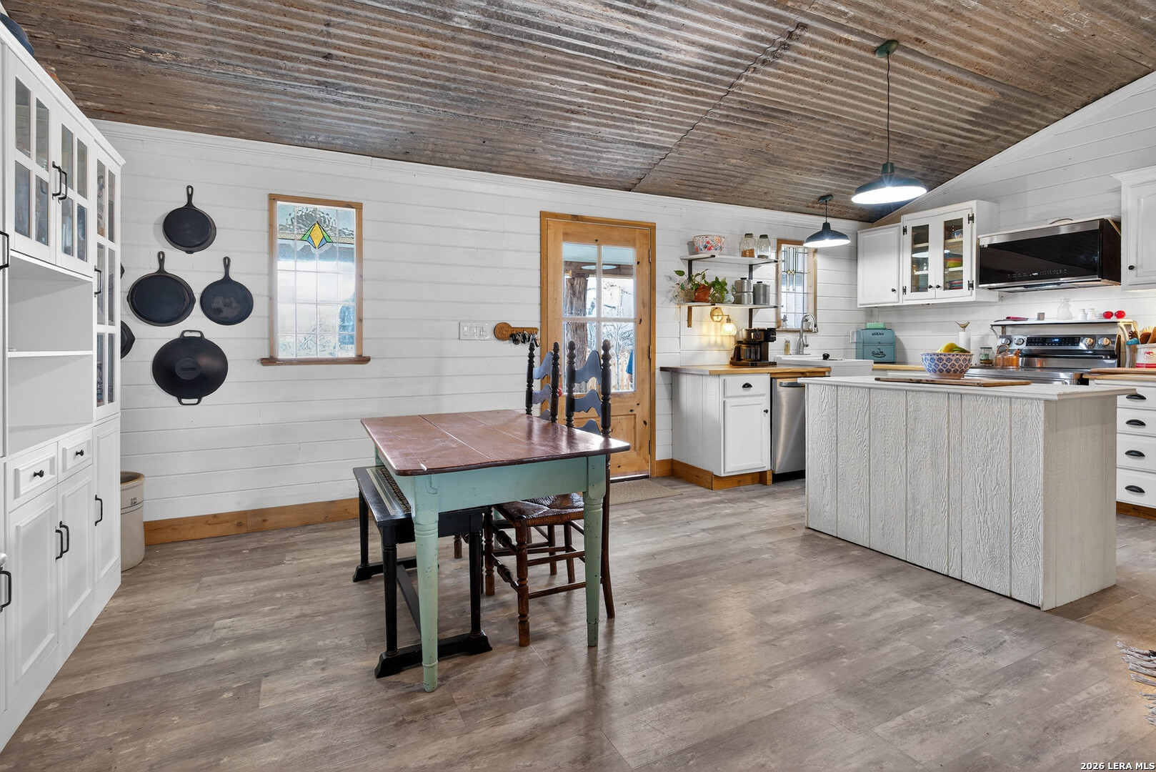 SINGLE STORY COUNTRY CHARM!!! Enjoy the freedom of country living on an oversized lot with no HOA and endless possibilities. This charming single-story home welcomes you with a full-length cedar post front porch and an inviting outdoor gazebo, perfect for relaxing and enjoying wide open space. The property is ideal for hobbyists, homesteaders, or anyone needing room to spread out, featuring a large workshop, additional tack building, chicken coop building, and a versatile 10x20 outbuilding with electricity, water, and washer/dryer hookups-perfect for a future casita or guest retreat. Inside, the open floor plan offers a warm country feel with a unique interior tin sheet metal ceiling, leaded glass accent windows, and an island kitchen showcasing stainless steel appliances, solid wood countertops, and farmhouse hardware. Multiple mini-split HVAC systems and energy-efficient solar panels help keep utility costs down. The spacious primary suite features high ceilings, a large walk-in closet, and a separate shower and tub. Additional highlights include a dedicated media room and RV parking with cleanout-bringing together comfort, functionality, and true country charm. See this one TODAY!!