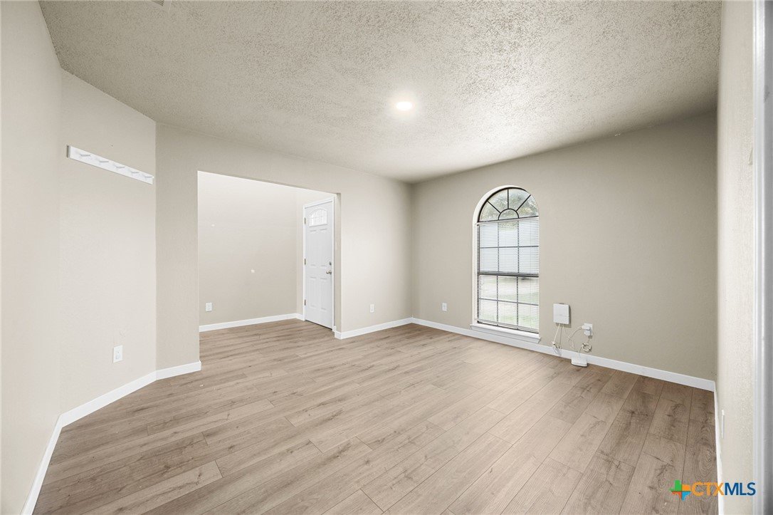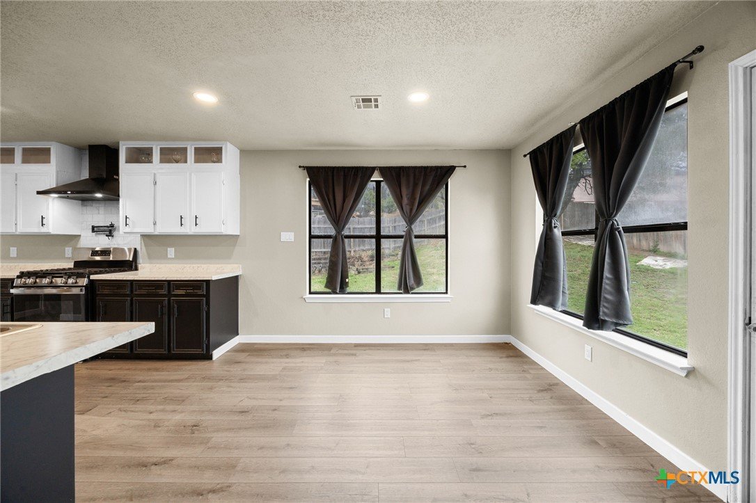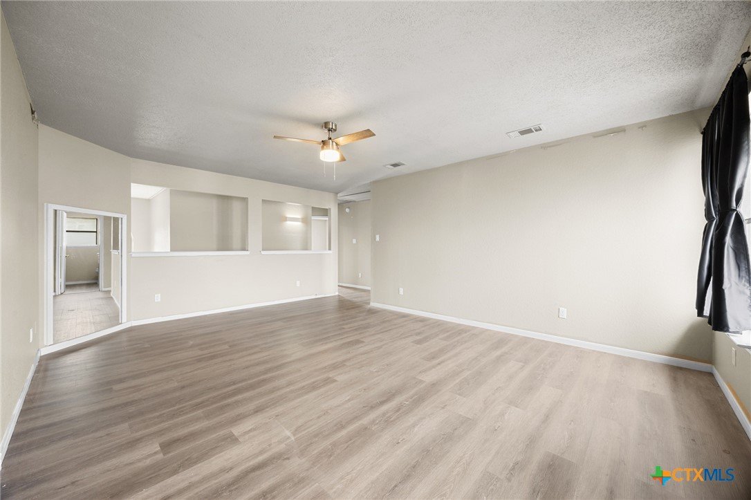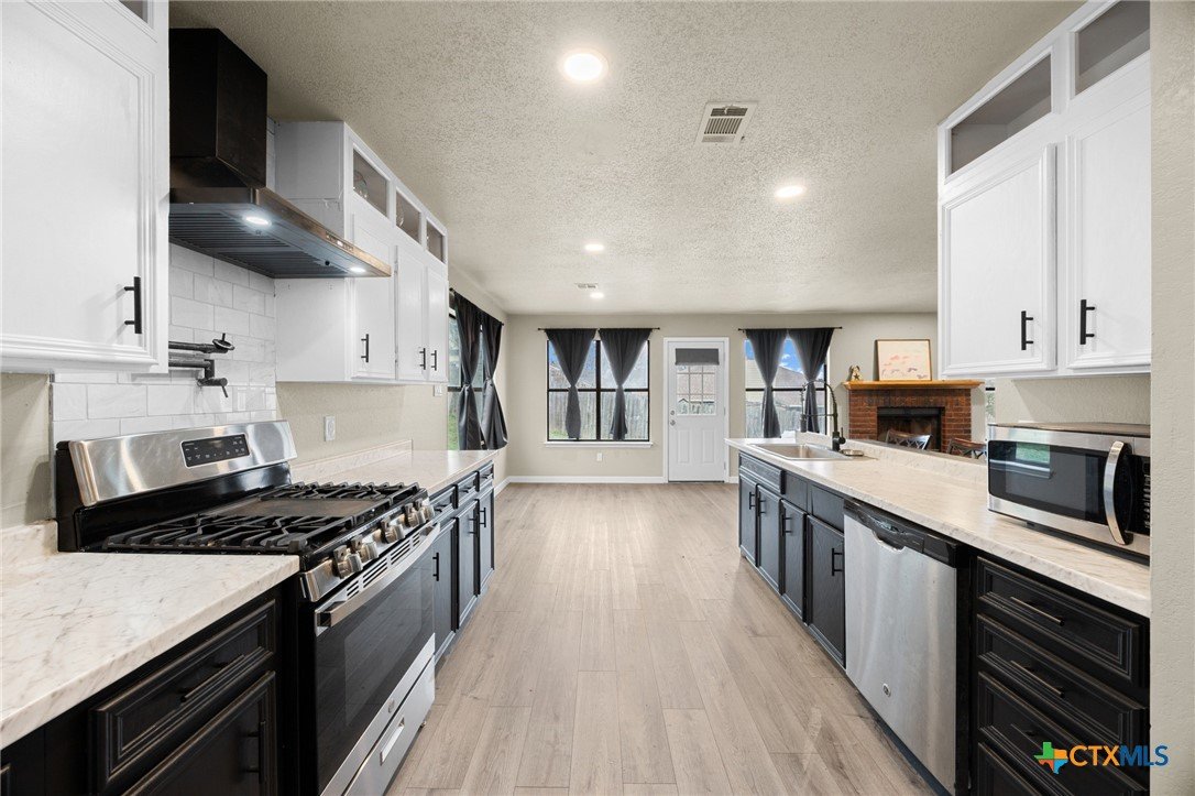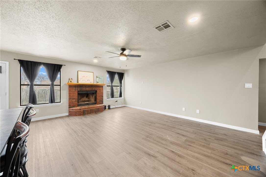 This home features a bright, open-concept layout designed for comfortable living and easy entertaining. The spacious living area showcases wood flooring, recessed lighting, and a charming brick fireplace that adds warmth and character. Large windows bring in natural light and create a welcoming atmosphere throughout the main living space. The open floor plan flows seamlessly into the kitchen, where a breakfast island with bar seating provides the perfect spot for casual dining or gathering. The kitchen also offers abundant cabinetry, modern finishes, and a convenient pantry for extra storage. The primary suite includes a bathroom with dual showerheads and a generous closet. Three additional bedrooms and a versatile living space provide flexible options for family, guests, or a home office. A private laundry area and two spacious attics give plenty of storage. Outside, the backyard layout is perfect for entertaining. Nestled in a desirable Copperas Cove neighborhood, the home is set in a friendly, family-oriented community, offering a comfortable and convenient lifestyle.