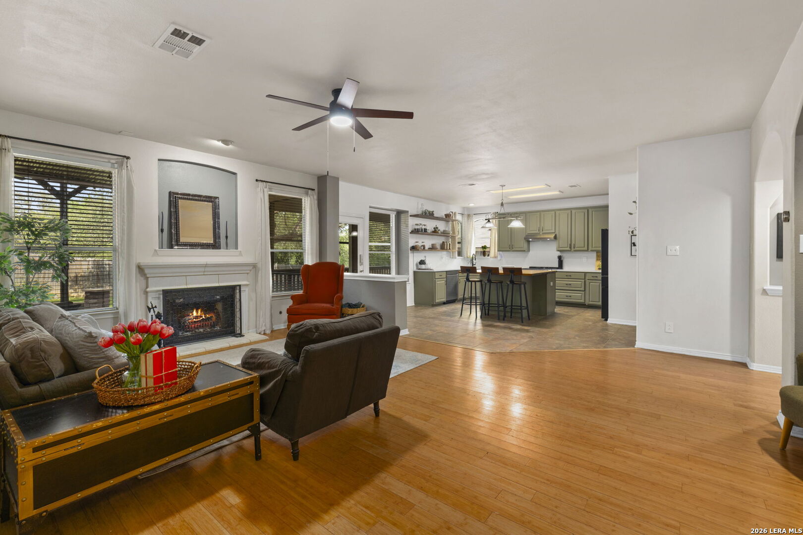 Beautifully updated and ideally located on a quiet cul-de-sac in the highly sought-after Stone Oak area, this home offers the perfect blend of comfort, style, and functionality. The heart of the home features a thoughtfully renovated kitchen with freshly painted cabinetry, striking quartz countertops that extend seamlessly up the backsplash, updated appliances, modern fixtures, and an enlarged island with butcher block-ideal for both everyday living and entertaining. Recent improvements provide added value and peace of mind, including a new roof (2024), water softener (2025), and HVAC system (2018), along with fresh interior paint throughout. The home also features updated fixtures and well-maintained major systems, including the water heater, furnace, and fireplace. Designed with space and flexibility in mind, the home offers nicely sized secondary bedrooms along with a large upstairs loft-providing room for everyone. The study has been enhanced with stylish built-in shelving and the addition of a door leading directly to the outdoor living area. Enjoy exceptional privacy with no rear neighbors and a peaceful greenbelt backdrop. The backyard is built for relaxing and entertaining, featuring an expansive patio with a fire pit and a screened-in porch for year-round enjoyment. Upstairs, the primary suite includes a private balcony overlooking the greenbelt, creating a quiet and serene retreat. Situated in a sought-after neighborhood with highly rated schools and convenient access to shopping, dining, and everyday amenities. Refrigerator, washer, and dryer are negotiable. Move-in ready with thoughtful updates, versatile living spaces, and a prime location-this one is a must-see.