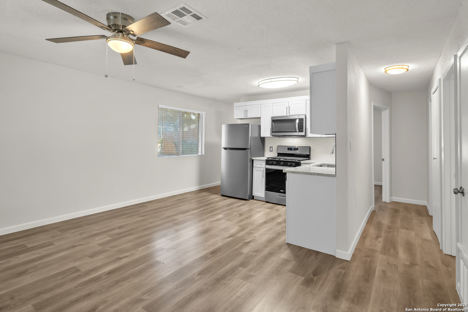 Brand new HVAC installed!!! Welcome to Unit 3 at 408 Regina St - a charming 3-bedroom, 1-bath unit in a quiet, centrally located triplex. This cozy rental offers a freshly updated interior with vinyl plank flooring, neutral paint, and a bright open layout. The kitchen features modern cabinetry and comes equipped with a refridgerator and stove! The bedroom includes a ceiling fan and closet space, while the full bath is clean and updated. Perfect for a single tenant or someone seeking affordable, low-maintenance living. All utilities included in rent - electric, water, and trash - making budgeting simple. Private entrance, off-street parking, and shared outdoor space included. Located just minutes from I-37, H-E-B, restaurants, and Brooks City Base.