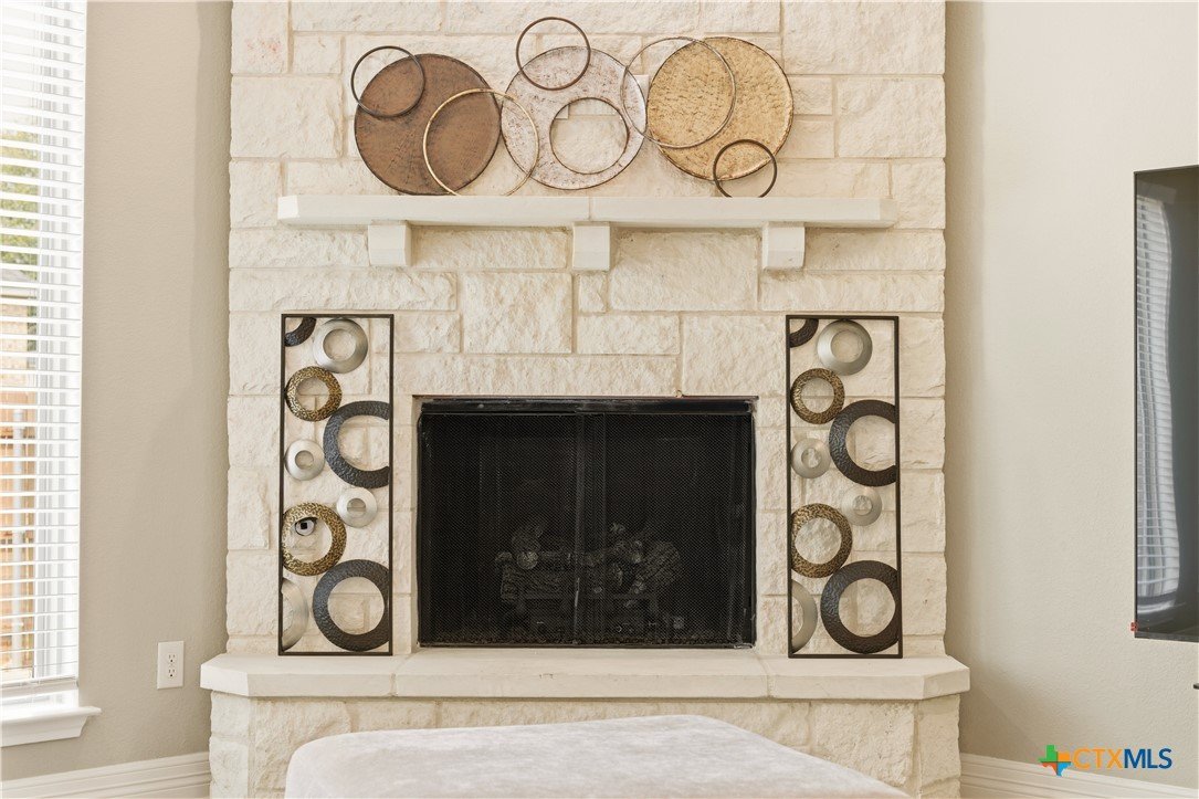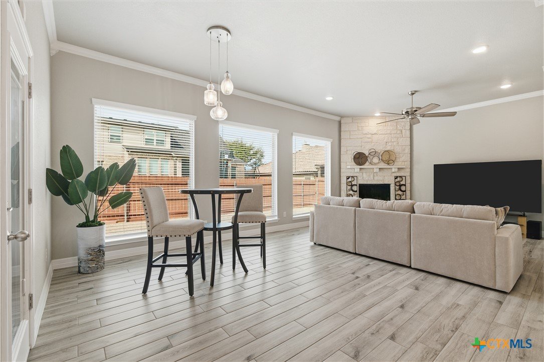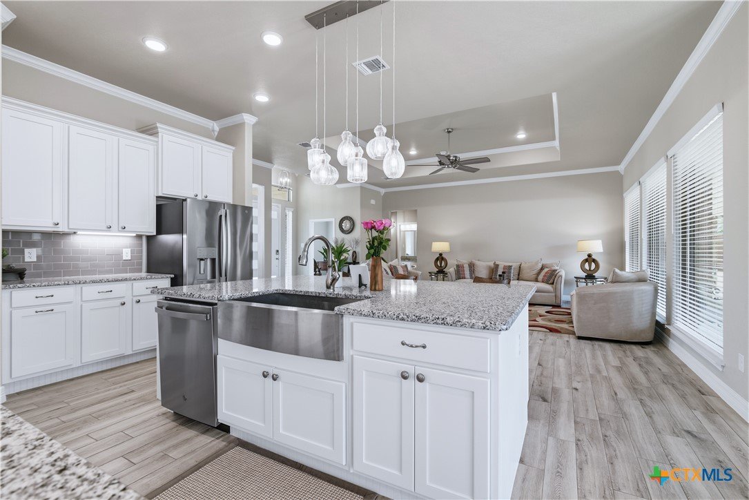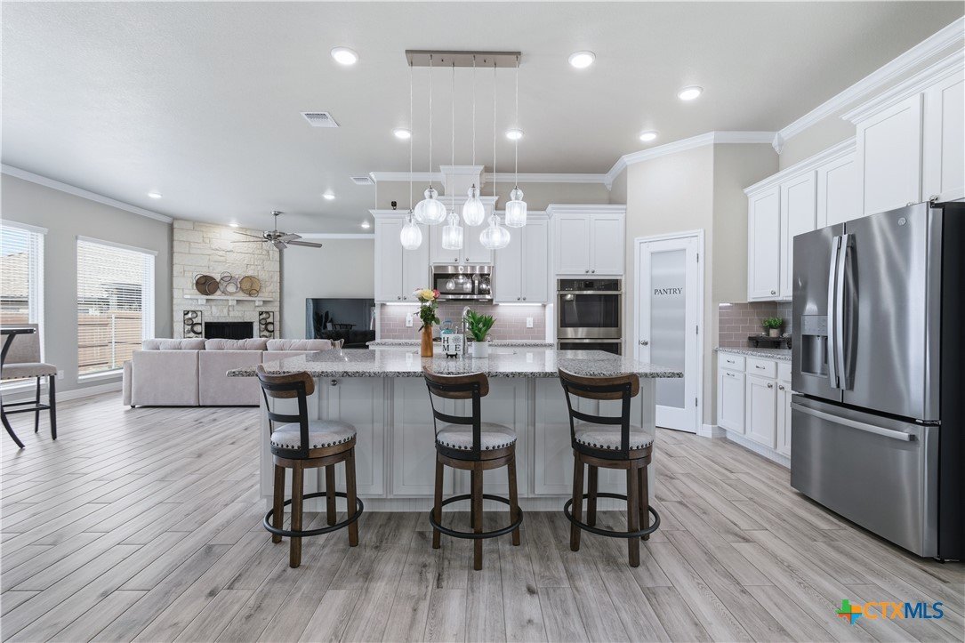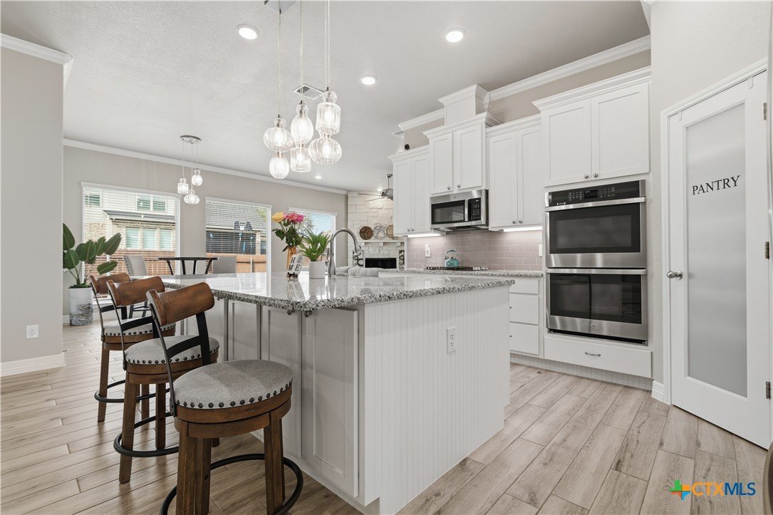 Located within the gated Bella Charca community, 4090 Turning Leaf Drive in Nolanville, TX offers a refined blend of upscale design, functionality, and Hill Country–inspired living. This exceptionally maintained home spans 2,990 square feet and features four bedrooms and three full bathrooms, providing generous space for both everyday living and entertaining. Upon entry, wood-look tile flooring creates a cohesive and elegant flow through the dining room, living areas, gourmet island kitchen, and family room. Crown molding, upgraded lighting, and custom blinds throughout reflect thoughtful attention to detail and elevate the overall aesthetic. The gourmet kitchen is designed to impress, featuring a large working island with large sink and breakfast bar seating, stainless steel appliances, under-cabinet lighting, and abundant cabinetry—ideal for hosting or daily living. The adjacent family room is warm and inviting, anchored by a gas log fireplace and enhanced by an open-concept layout that balances connectivity with defined spaces. The primary suite serves as a private retreat, highlighted by a tray ceiling and a spa-like en-suite bathroom with a sleek soaking tub and spacious walk-in shower. Additional bedrooms are well-sized and thoughtfully arranged, offering flexibility for guests, home office use, or multi-generational living. Outdoors, the home continues to impress with gutters, a full sprinkler system, a covered patio, and a well-appointed outdoor kitchen, perfect for enjoying the Texas lifestyle year-round. Residents of Bella Charca enjoy gated access, scenic surroundings, and convenient proximity to Fort Cavazos, shopping, dining, and major commuter routes. This move-in-ready home delivers upscale finishes, quality craftsmanship, and timeless design in one of Nolanville’s most desirable communities.