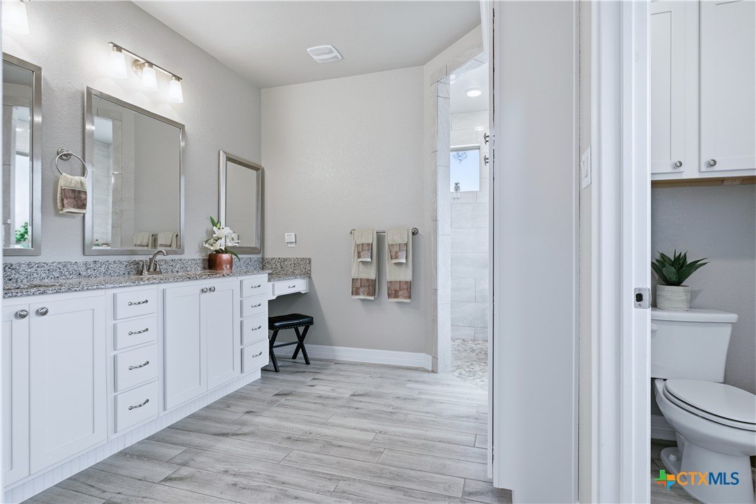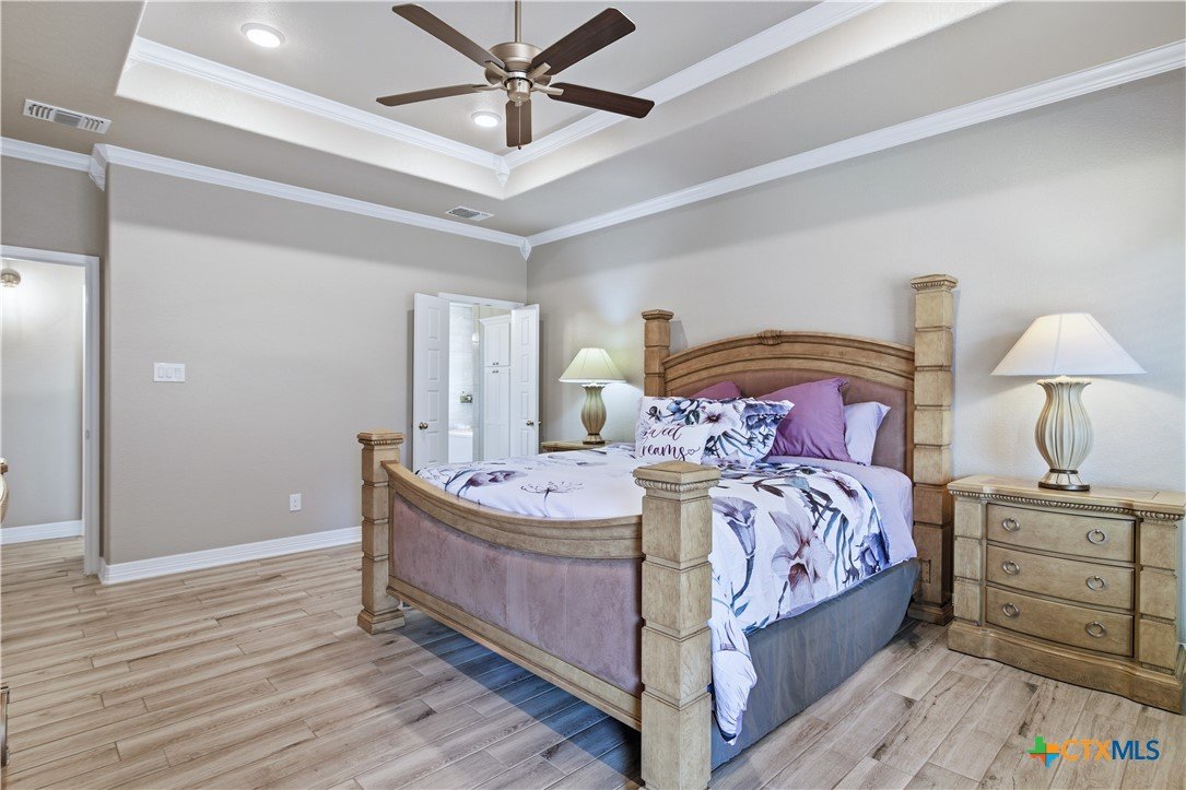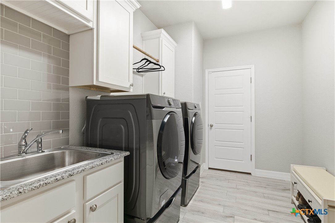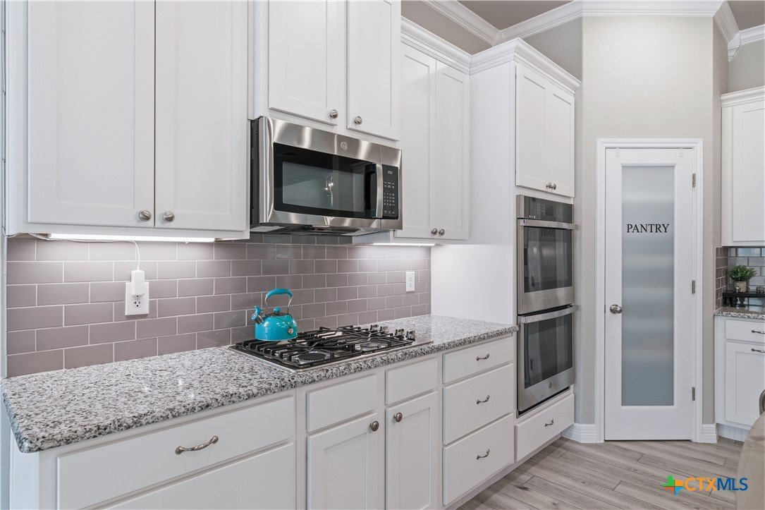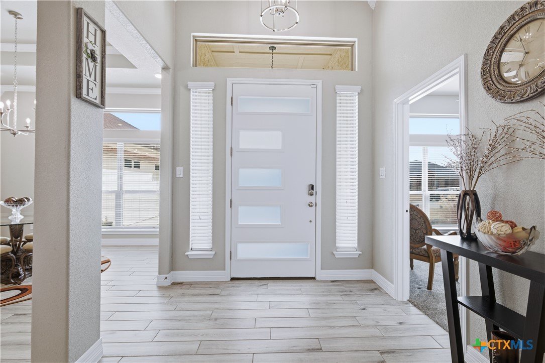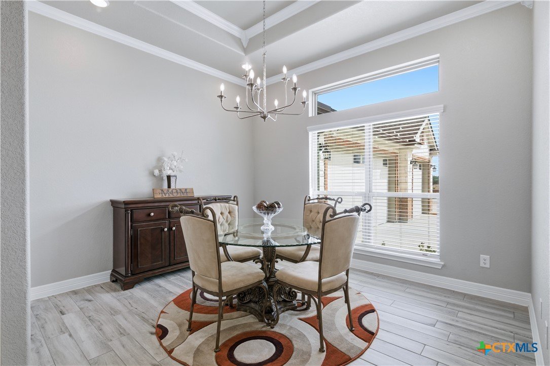 Located within the gated Bella Charca community, 4090 Turning Leaf Drive in Nolanville, TX offers a refined blend of upscale design, functionality, and Hill Country–inspired living. This exceptionally maintained home spans 2,990 square feet and features four bedrooms and three full bathrooms, providing generous space for both everyday living and entertaining. Upon entry, wood-look tile flooring creates a cohesive and elegant flow through the dining room, living areas, gourmet island kitchen, and family room. Crown molding, upgraded lighting, and custom blinds throughout reflect thoughtful attention to detail and elevate the overall aesthetic. The gourmet kitchen is designed to impress, featuring a large working island with large sink and breakfast bar seating, stainless steel appliances, under-cabinet lighting, and abundant cabinetry—ideal for hosting or daily living. The adjacent family room is warm and inviting, anchored by a gas log fireplace and enhanced by an open-concept layout that balances connectivity with defined spaces. The primary suite serves as a private retreat, highlighted by a tray ceiling and a spa-like en-suite bathroom with a sleek soaking tub and spacious walk-in shower. Additional bedrooms are well-sized and thoughtfully arranged, offering flexibility for guests, home office use, or multi-generational living. Outdoors, the home continues to impress with gutters, a full sprinkler system, a covered patio, and a well-appointed outdoor kitchen, perfect for enjoying the Texas lifestyle year-round. Residents of Bella Charca enjoy gated access, scenic surroundings, and convenient proximity to Fort Cavazos, shopping, dining, and major commuter routes. This move-in-ready home delivers upscale finishes, quality craftsmanship, and timeless design in one of Nolanville’s most desirable communities.