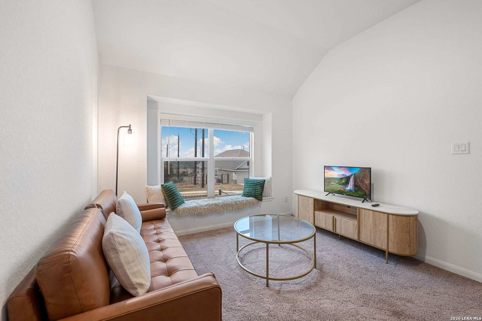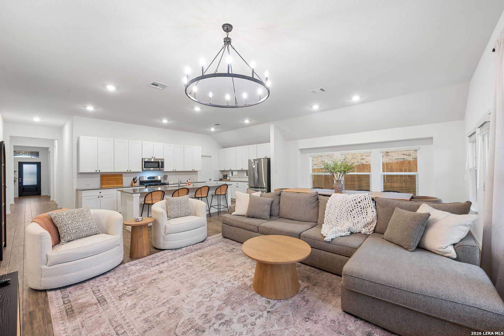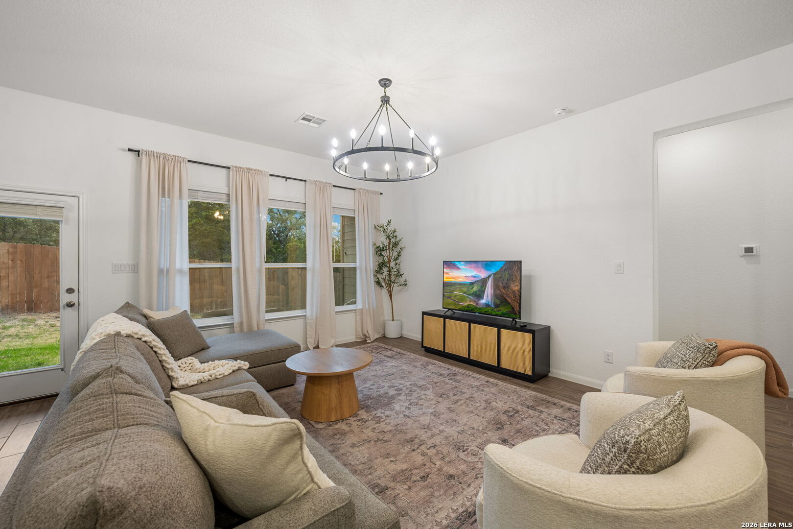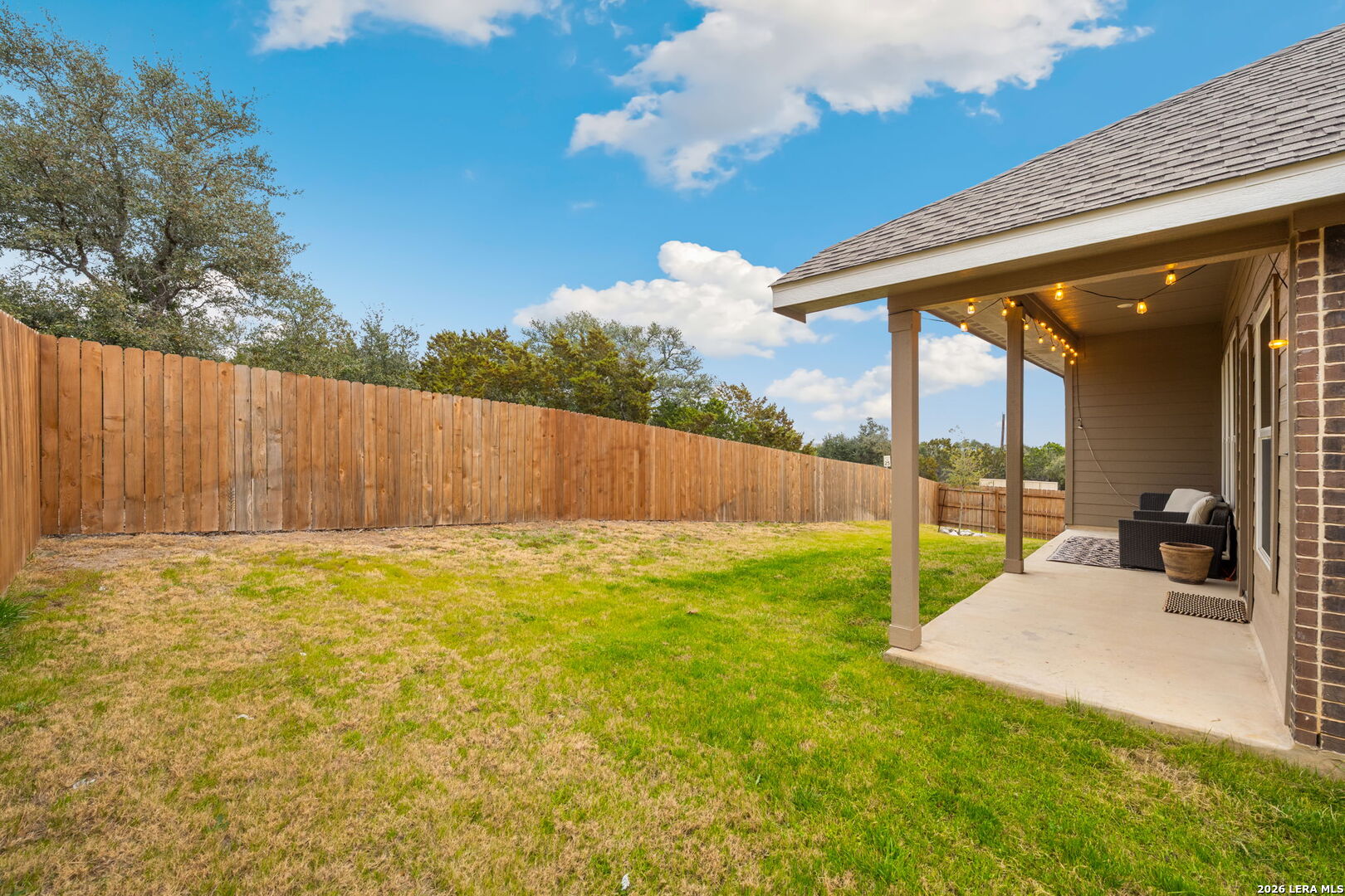 Welcome to this stunning, nearly new home located in the highly sought-after Johnson Ranch community in Bulverde. Built in 2024, this beautifully designed single-story residence offers 4 bedrooms, 3 full bathrooms, and approximately 2,377 square feet of thoughtfully designed living space with a flexible and functional layout. Step inside to discover a bright, open-concept floor plan featuring a spacious kitchen, dining area, and family room that flow seamlessly together, making it perfect for both everyday living and entertaining. The modern kitchen is the heart of the home, complete with ample counter space, stylish finishes, and abundant storage. The primary suite is tucked away at the back of the home and offers a spa-like ensuite bath along with a generous walk-in closet. A versatile bonus space provides the perfect option for a home office, playroom, or additional living area. The covered patio creates an inviting outdoor retreat ideal for relaxing evenings, weekend gatherings, or enjoying the beautiful Texas Hill Country lifestyle. Situated on a desirable corner lot, this home offers a larger yard and added privacy with green space behind and to the side of the property. Enjoy peaceful views of mature trees and natural surroundings from your back porch, where you can truly take in the beauty of the Hill Country. Additional upgrades include enhanced lighting fixtures and a water softener system. Located in a gated section of the community, residents enjoy access to top-tier neighborhood amenities including parks, pools, walking trails, and community events. Located within the award-winning Comal ISD and just minutes from Spring Branch, Bulverde, and convenient shopping, dining, and entertainment, this home offers the perfect balance of peaceful living with easy access to San Antonio. This is a rare opportunity to own a nearly new home in one of the fastest-growing areas north of San Antonio. Schedule your showing today!