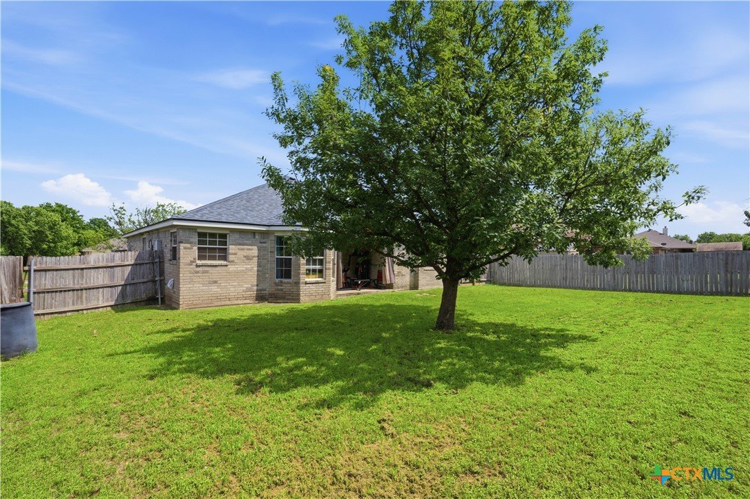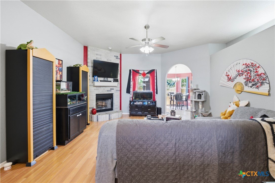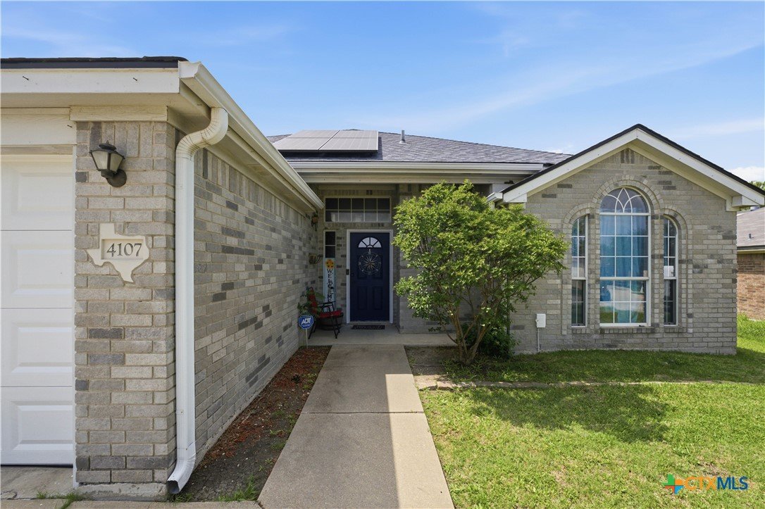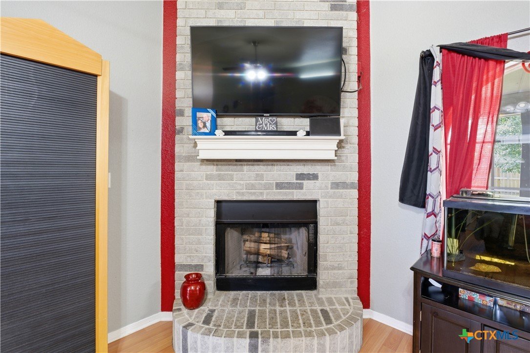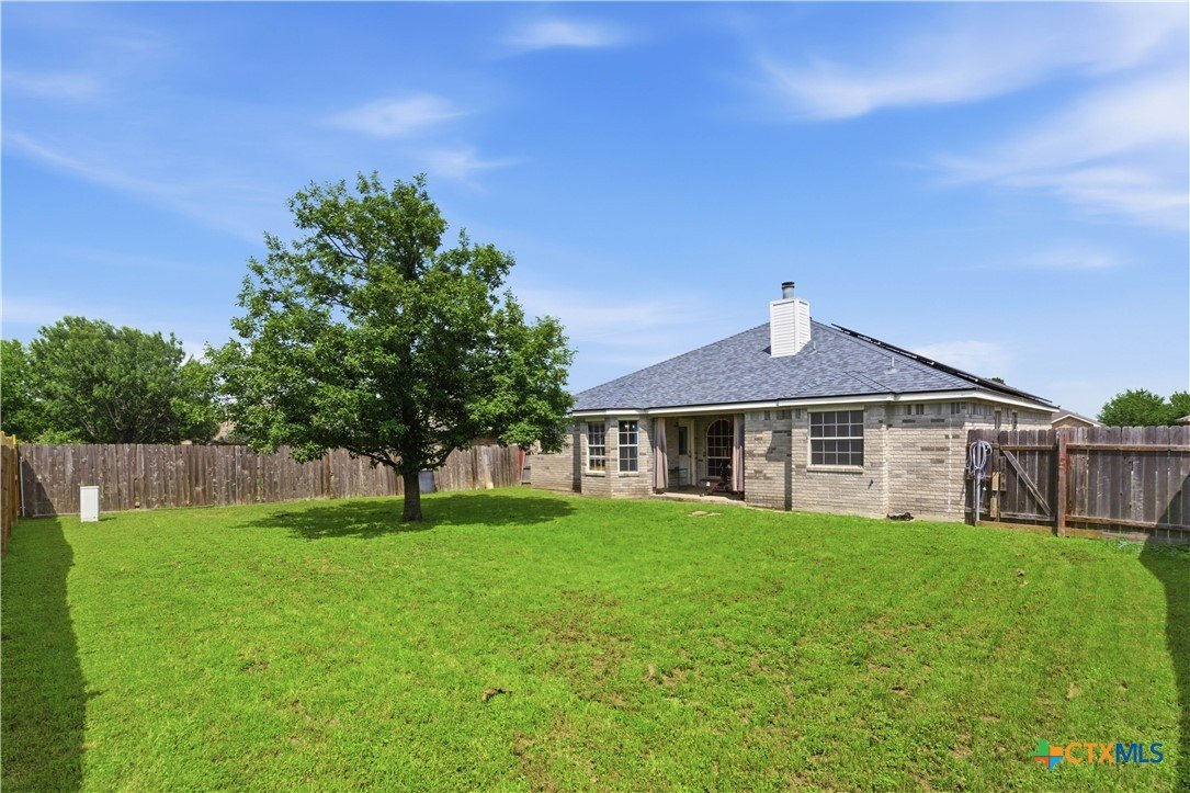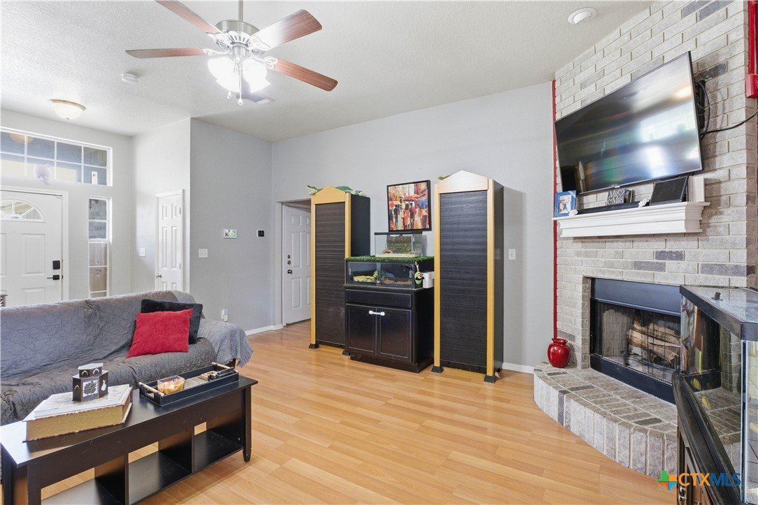 Beautifully built Carothers Home in Clear Creek Estates featuring a spacious living room with a floor-to-ceiling brick wood-burning fireplace, vinyl wood flooring, and an arched entryway. The kitchen offers white cabinetry, stainless steel appliances, ample counter space, and a bright bay window dining area. The primary suite fits a king-size bed and includes a jetted tub, separate shower, dual vanities, and walk-in closets. Secondary bedrooms are well-sized with ceiling fans. Energy-efficient solar panels, a full-home water softening system add comfort and efficiency. Enjoy a covered patio and spacious backyard, conveniently located near Fort Hood, hospitals, schools, and shopping.