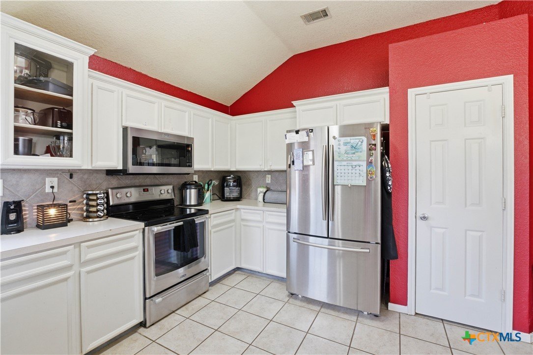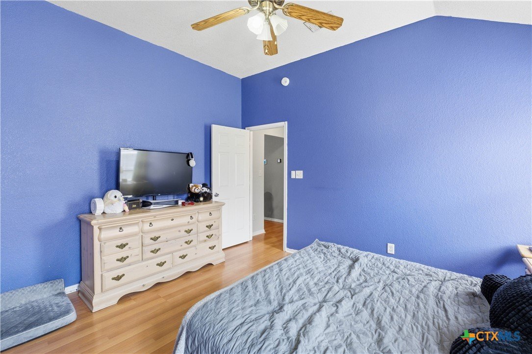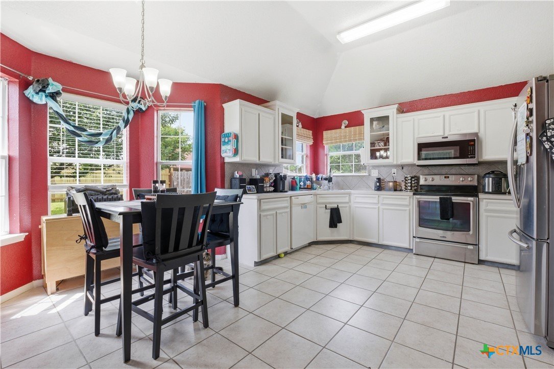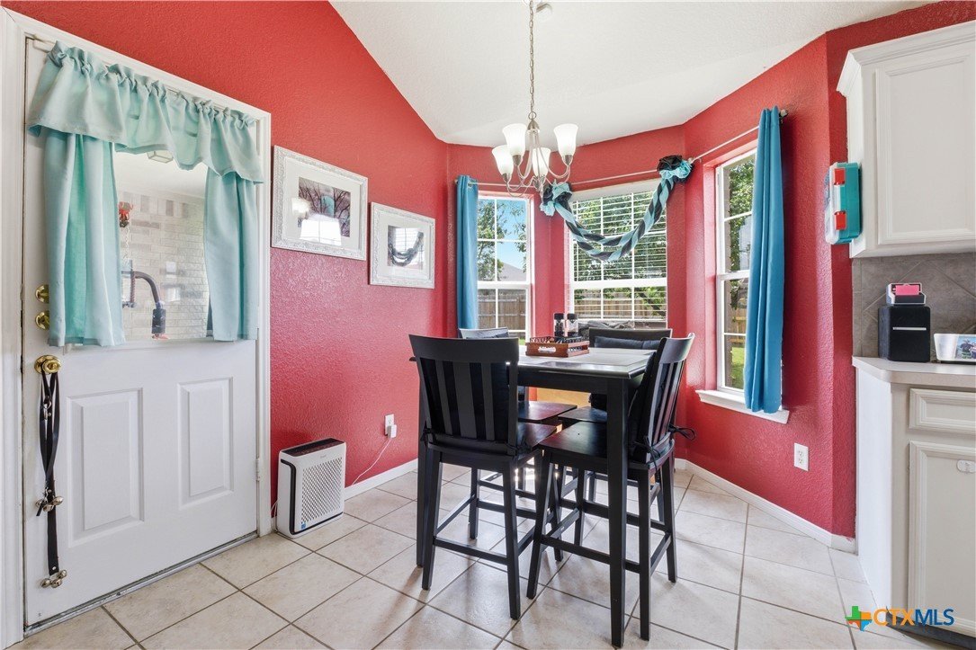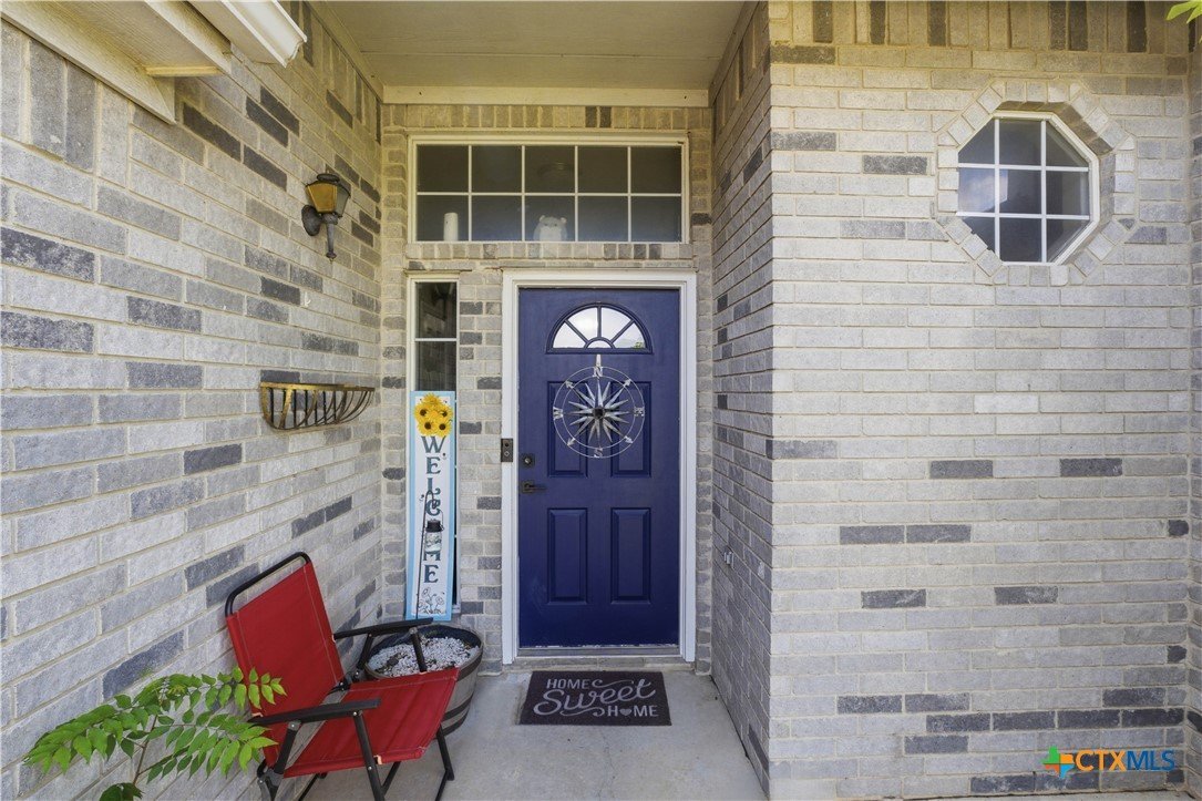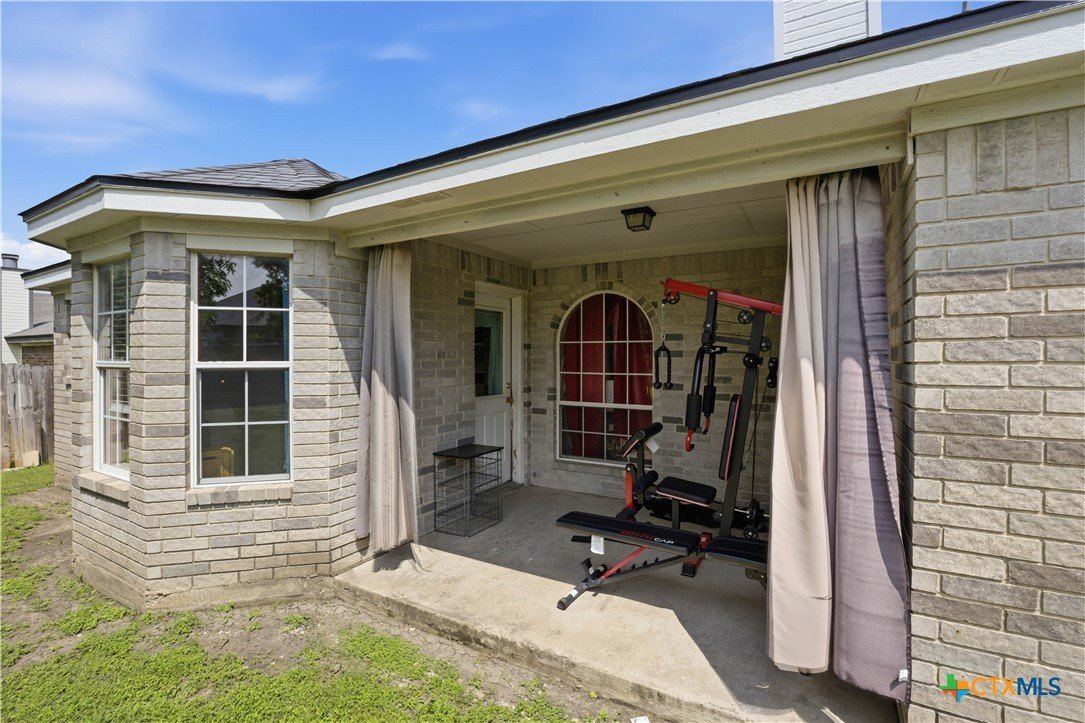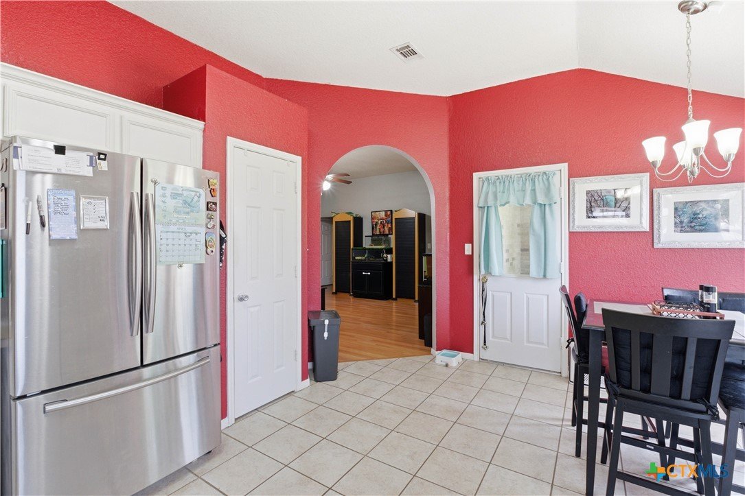 Beautifully built Carothers Home in Clear Creek Estates featuring a spacious living room with a floor-to-ceiling brick wood-burning fireplace, vinyl wood flooring, and an arched entryway. The kitchen offers white cabinetry, stainless steel appliances, ample counter space, and a bright bay window dining area. The primary suite fits a king-size bed and includes a jetted tub, separate shower, dual vanities, and walk-in closets. Secondary bedrooms are well-sized with ceiling fans. Energy-efficient solar panels, a full-home water softening system add comfort and efficiency. Enjoy a covered patio and spacious backyard, conveniently located near Fort Hood, hospitals, schools, and shopping.