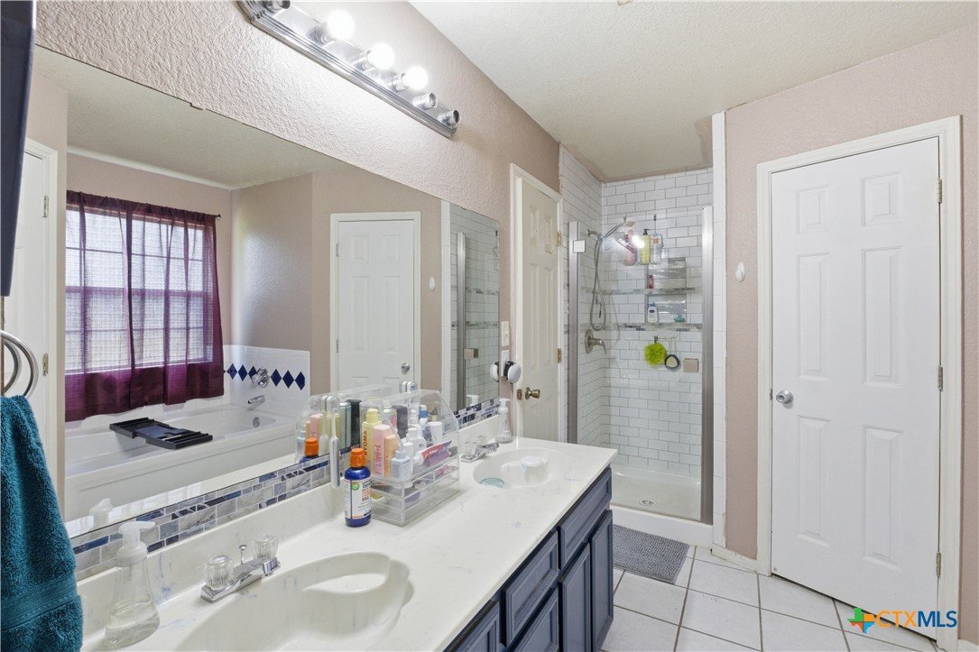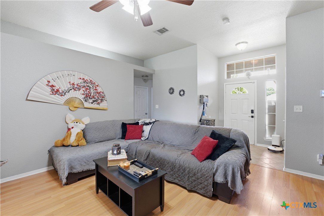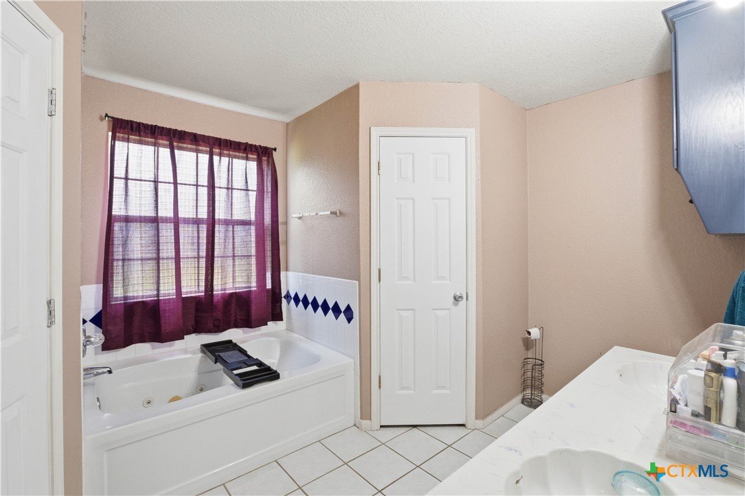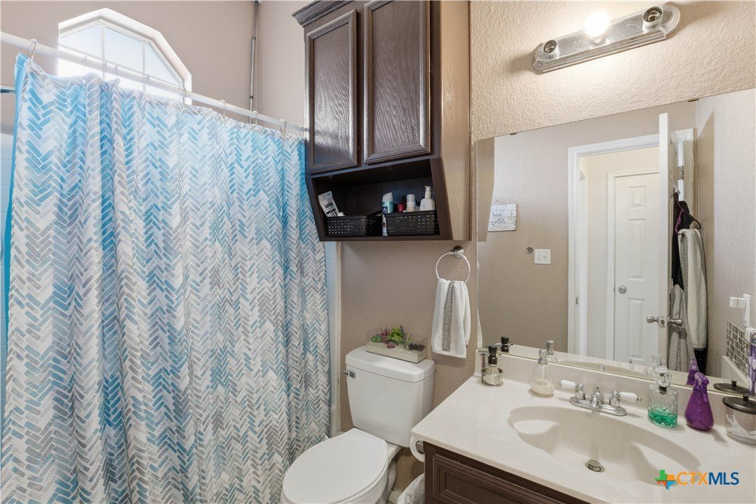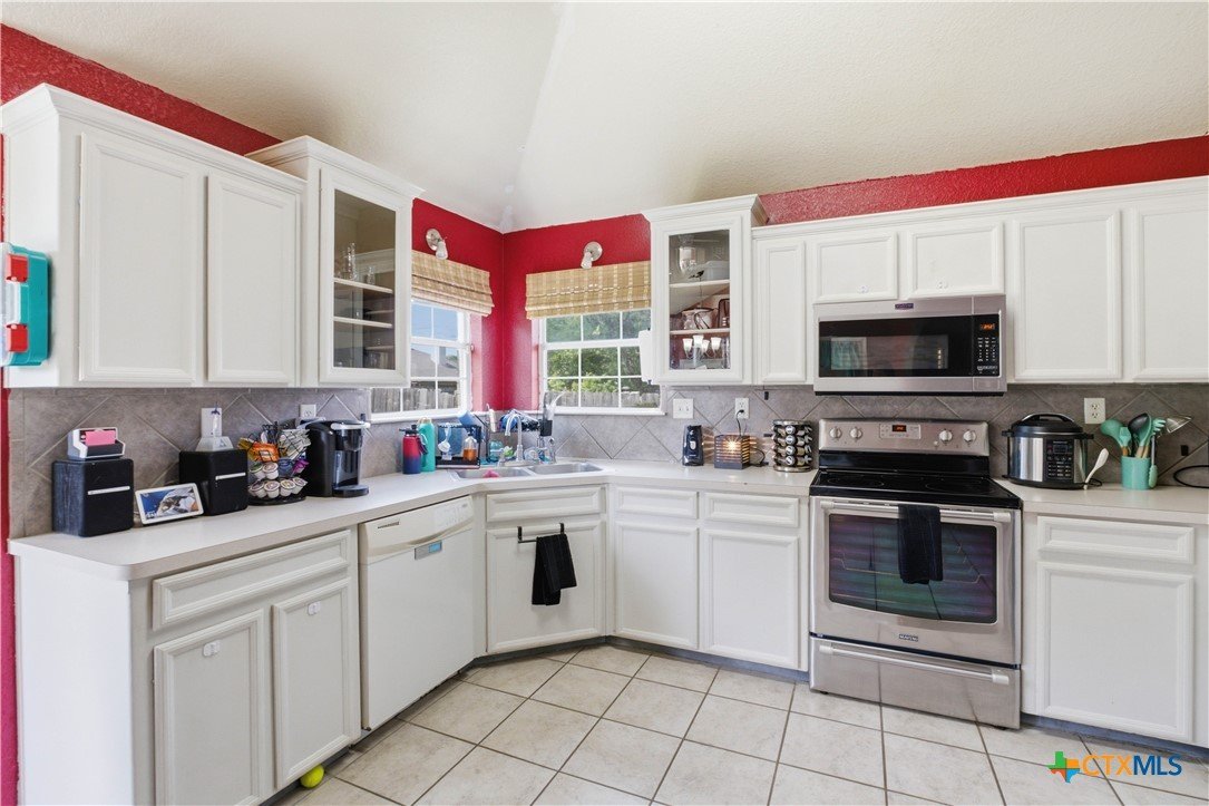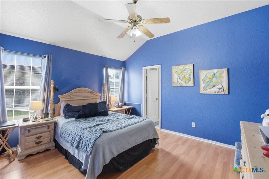 Beautifully built Carothers Home in Clear Creek Estates featuring a spacious living room with a floor-to-ceiling brick wood-burning fireplace, vinyl wood flooring, and an arched entryway. The kitchen offers white cabinetry, stainless steel appliances, ample counter space, and a bright bay window dining area. The primary suite fits a king-size bed and includes a jetted tub, separate shower, dual vanities, and walk-in closets. Secondary bedrooms are well-sized with ceiling fans. Energy-efficient solar panels, a full-home water softening system add comfort and efficiency. Enjoy a covered patio and spacious backyard, conveniently located near Fort Hood, hospitals, schools, and shopping.