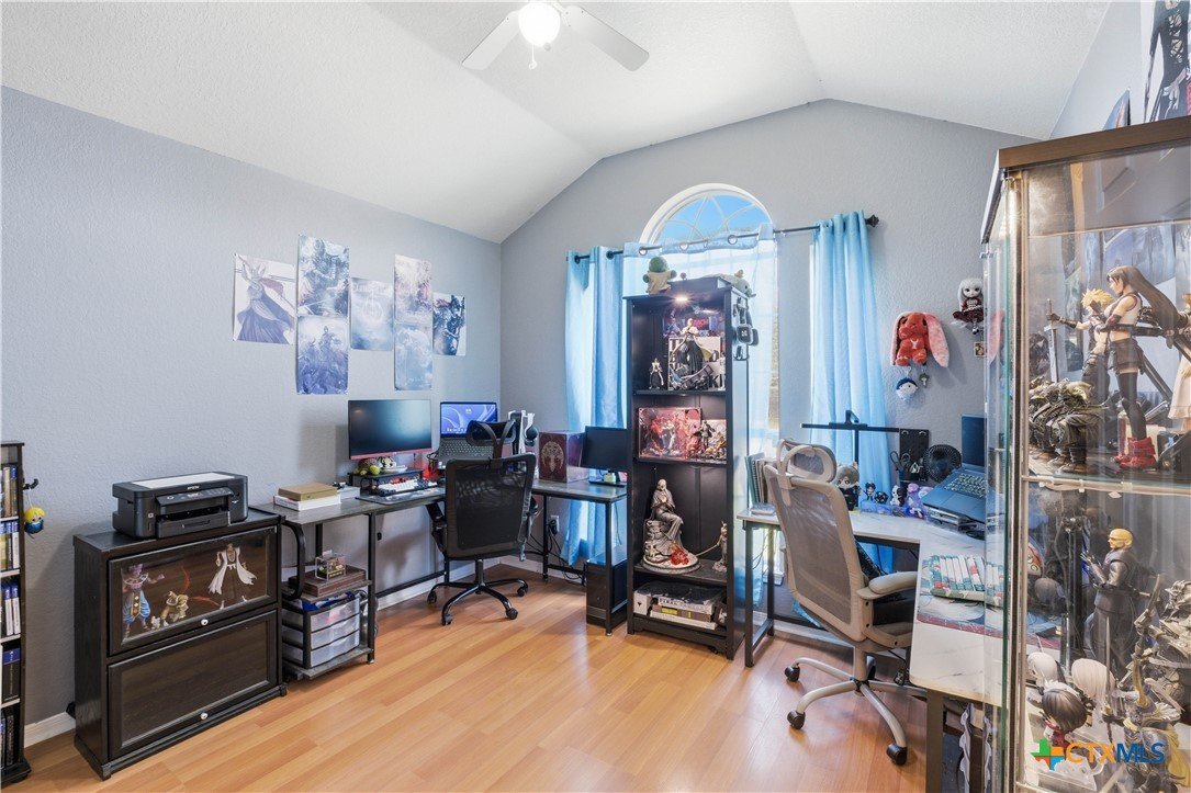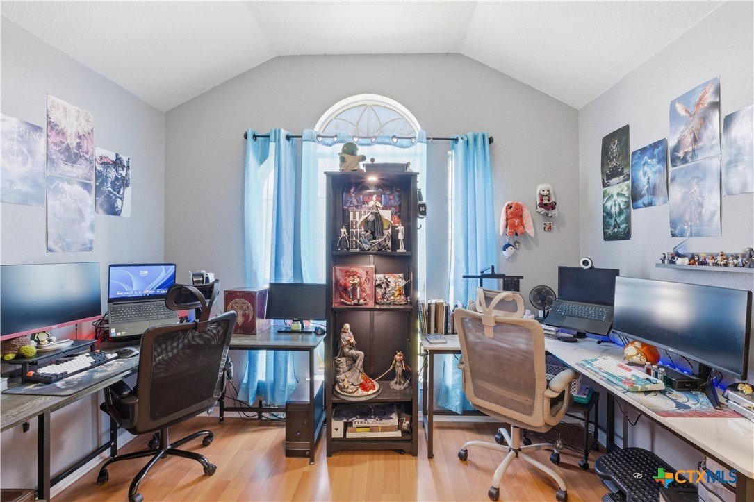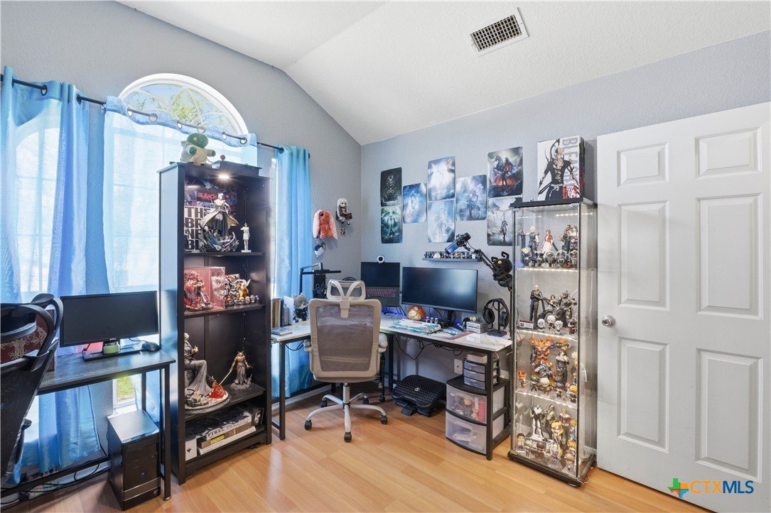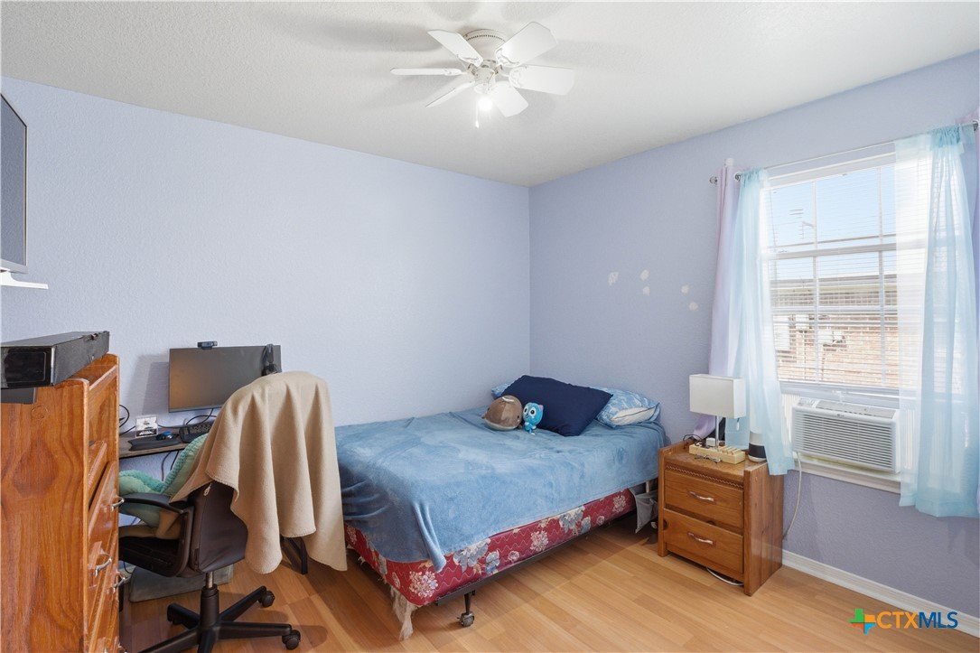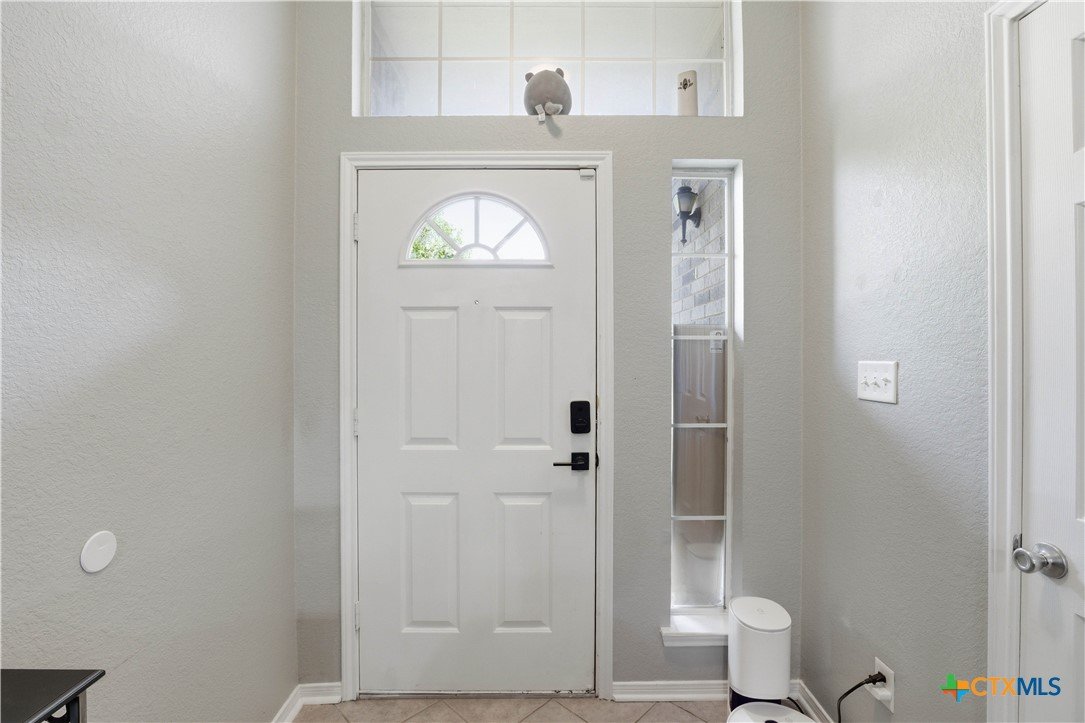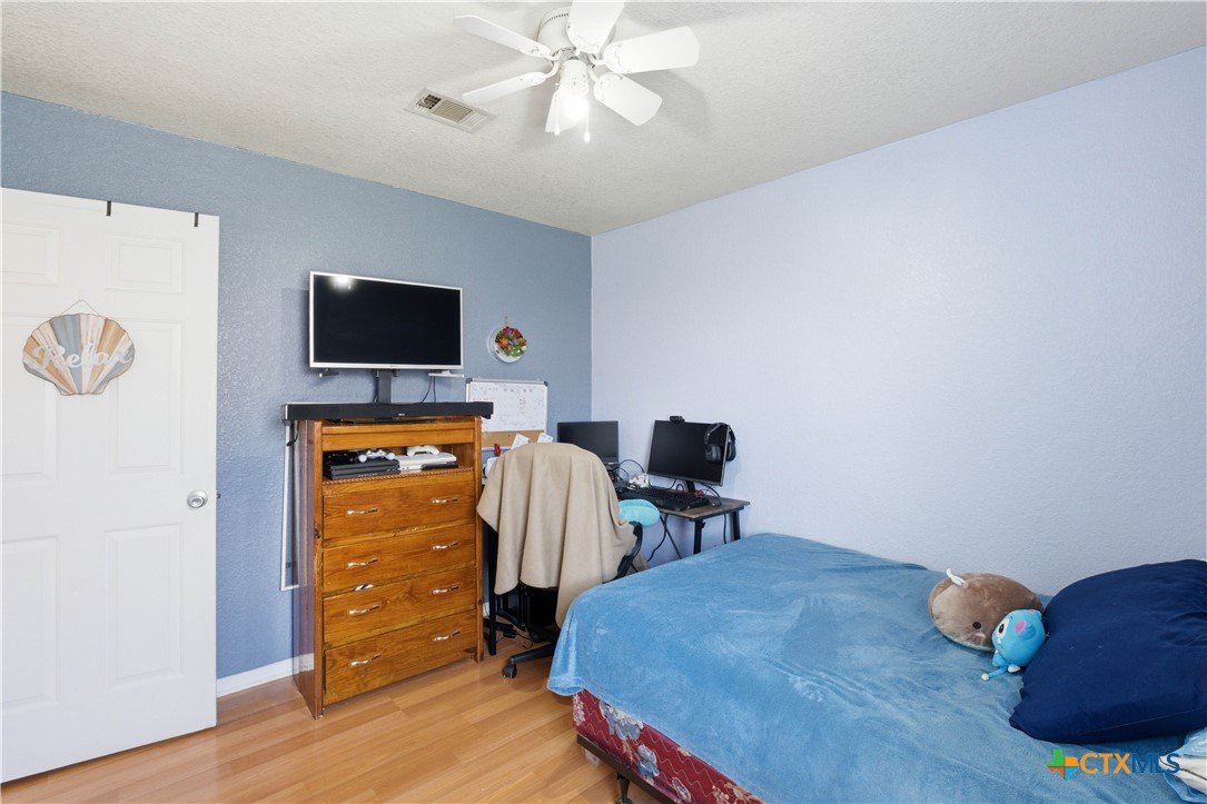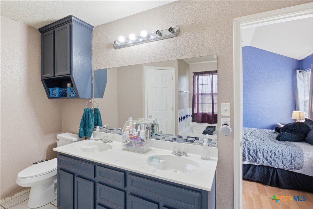 Beautifully built Carothers Home in Clear Creek Estates featuring a spacious living room with a floor-to-ceiling brick wood-burning fireplace, vinyl wood flooring, and an arched entryway. The kitchen offers white cabinetry, stainless steel appliances, ample counter space, and a bright bay window dining area. The primary suite fits a king-size bed and includes a jetted tub, separate shower, dual vanities, and walk-in closets. Secondary bedrooms are well-sized with ceiling fans. Energy-efficient solar panels, a full-home water softening system add comfort and efficiency. Enjoy a covered patio and spacious backyard, conveniently located near Fort Hood, hospitals, schools, and shopping.