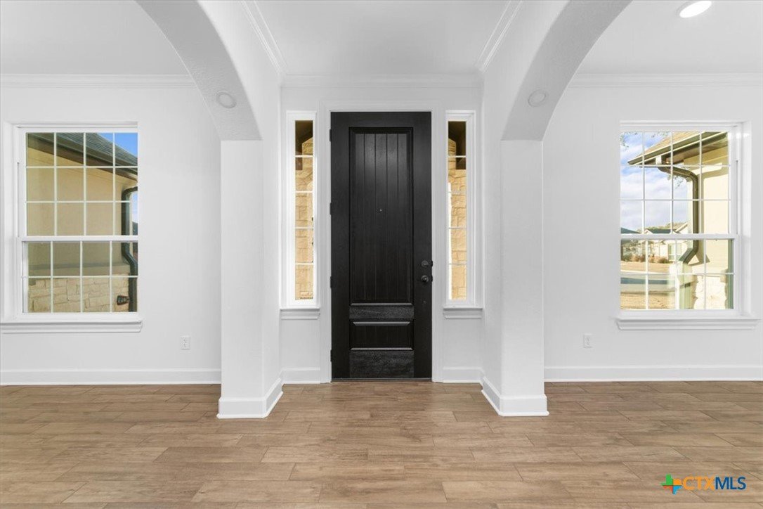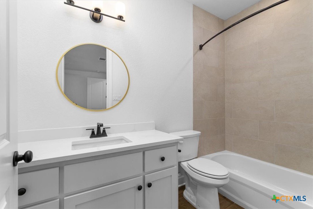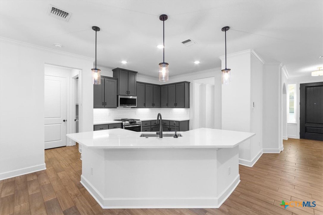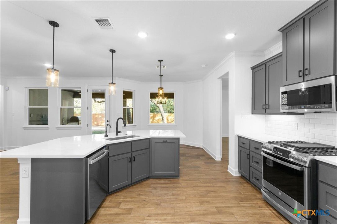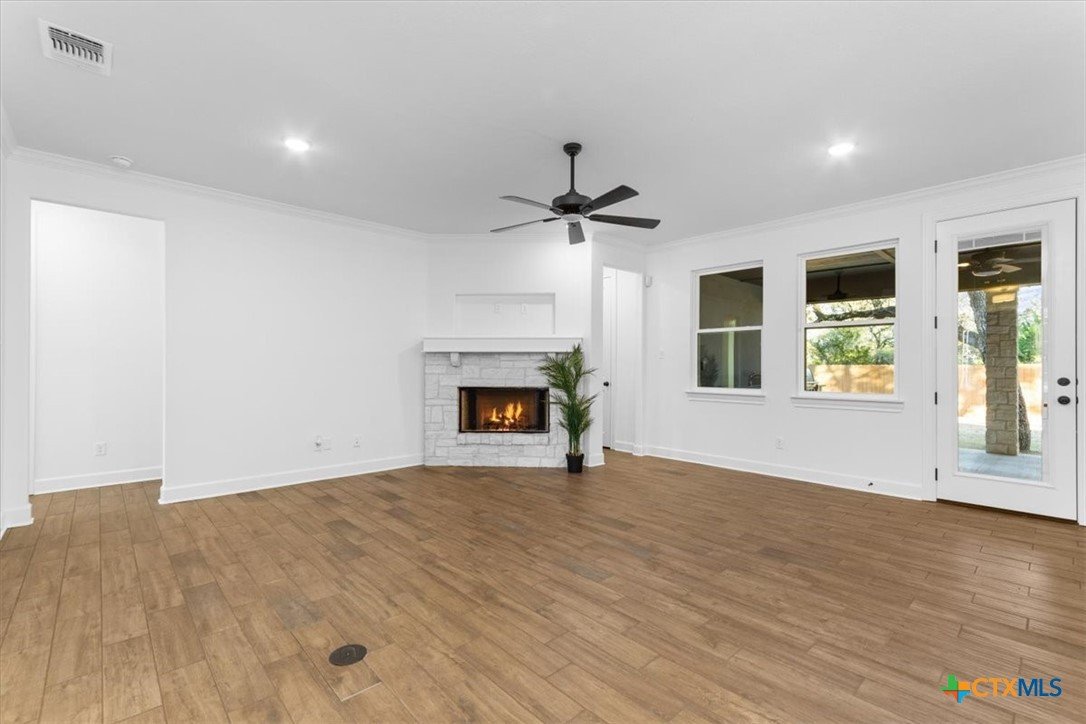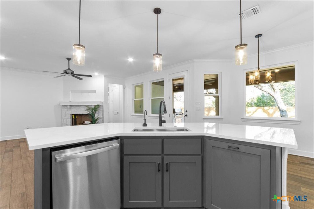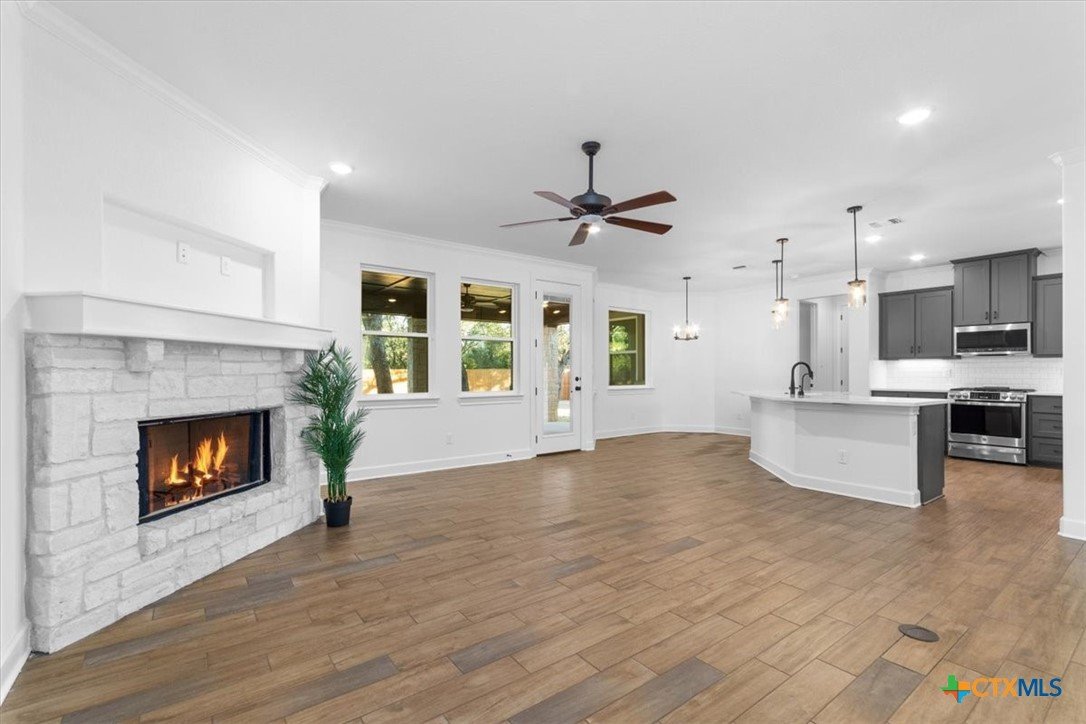 4121 Turning Leaf Drive offers timeless design, energy-efficient features, and the craftsmanship you expect from the Parade of Homes award-winning builder Alethium Star Homes. Nestled in the gated Bella Charca community, this thoughtfully designed 2,397 square foot home includes four bedrooms, three full baths, and a spacious, open-concept layout ideal for entertaining and daily living alike. A large foyer opens into the main living space, where expansive windows frame a peaceful view of the backyard. Just beyond, the covered patio is outfitted with a complete outdoor kitchen—including a built-in grill, refrigerator, sink, and storage—making al fresco dining a breeze. Inside, the kitchen is a true focal point with designer quartz countertops, stainless steel appliances, custom wood cabinetry, and a walk-in pantry. A generous island and dual dining spaces oNer flexibility for both casual meals and formal gatherings. The living room includes a wood-burning fireplace with gas ignitor and floor outlets, while crown molding and prewiring for TV and data are found throughout the home. The primary suite oNers a garden tub, walk-in tiled shower with dual shower heads, and dual vanities with quartz surfaces. An in-law suite with private bath ensures guests or family have their own retreat, while secondary bedrooms are enhanced with barn-door closets. Additional highlights include a WiFi-enabled thermostat, 15 SEER HVAC, Low-E windows, R38 attic insulation, and a 50-gallon gas recirculating water heater. Outside, you'll find a fully sodded yard with irrigation system, flower beds, privacy fencing, landscape lighting, and a 50-amp EV charger in the garage. Located minutes from Fort Cavazos, and with quick access to I-14 and area schools, this home combines luxury and location in one exceptional package.