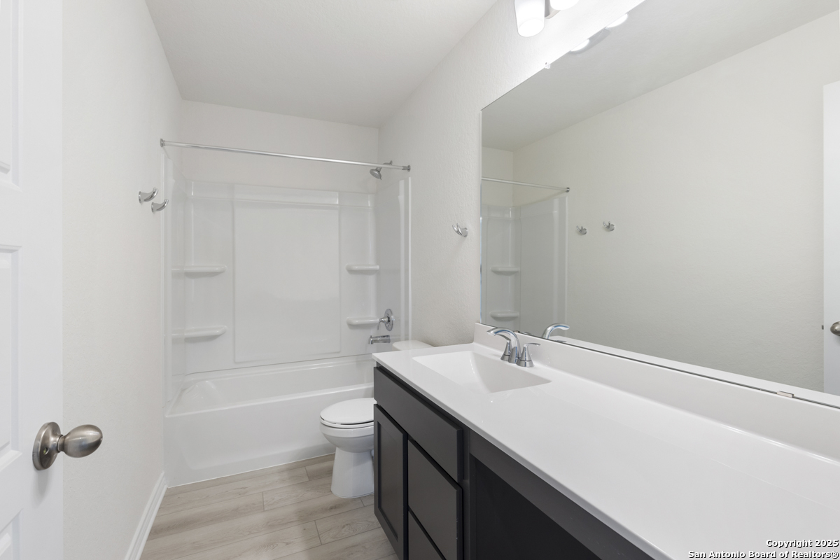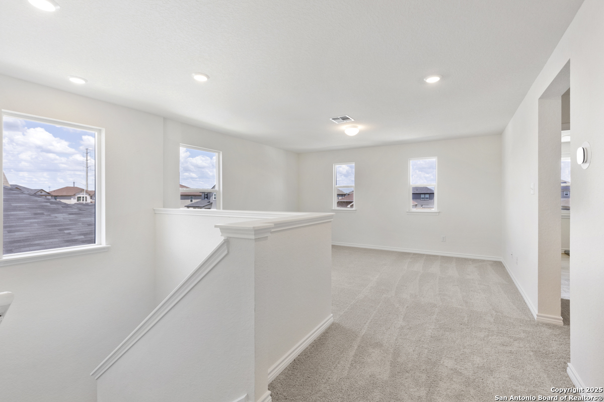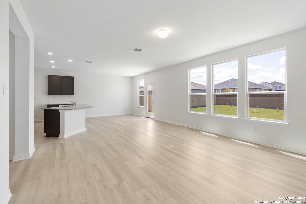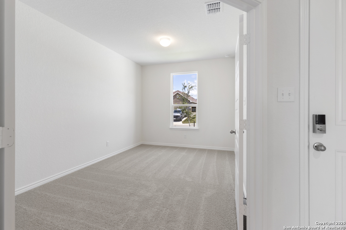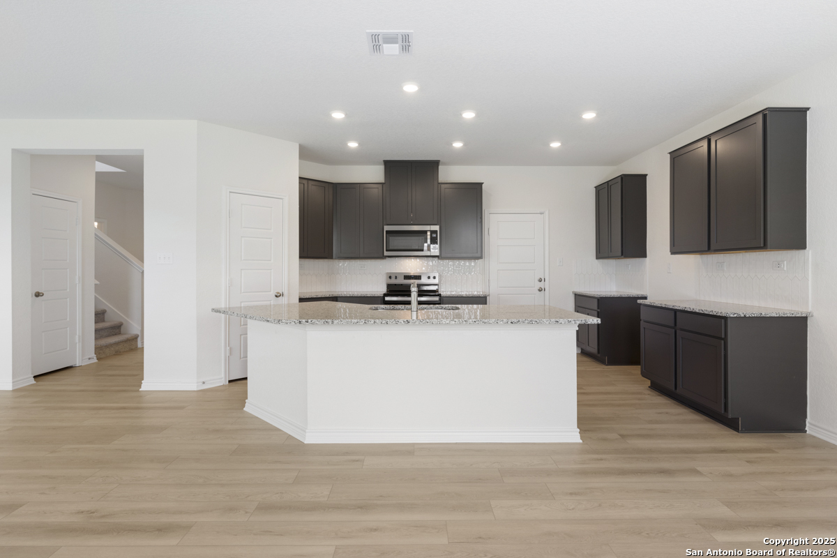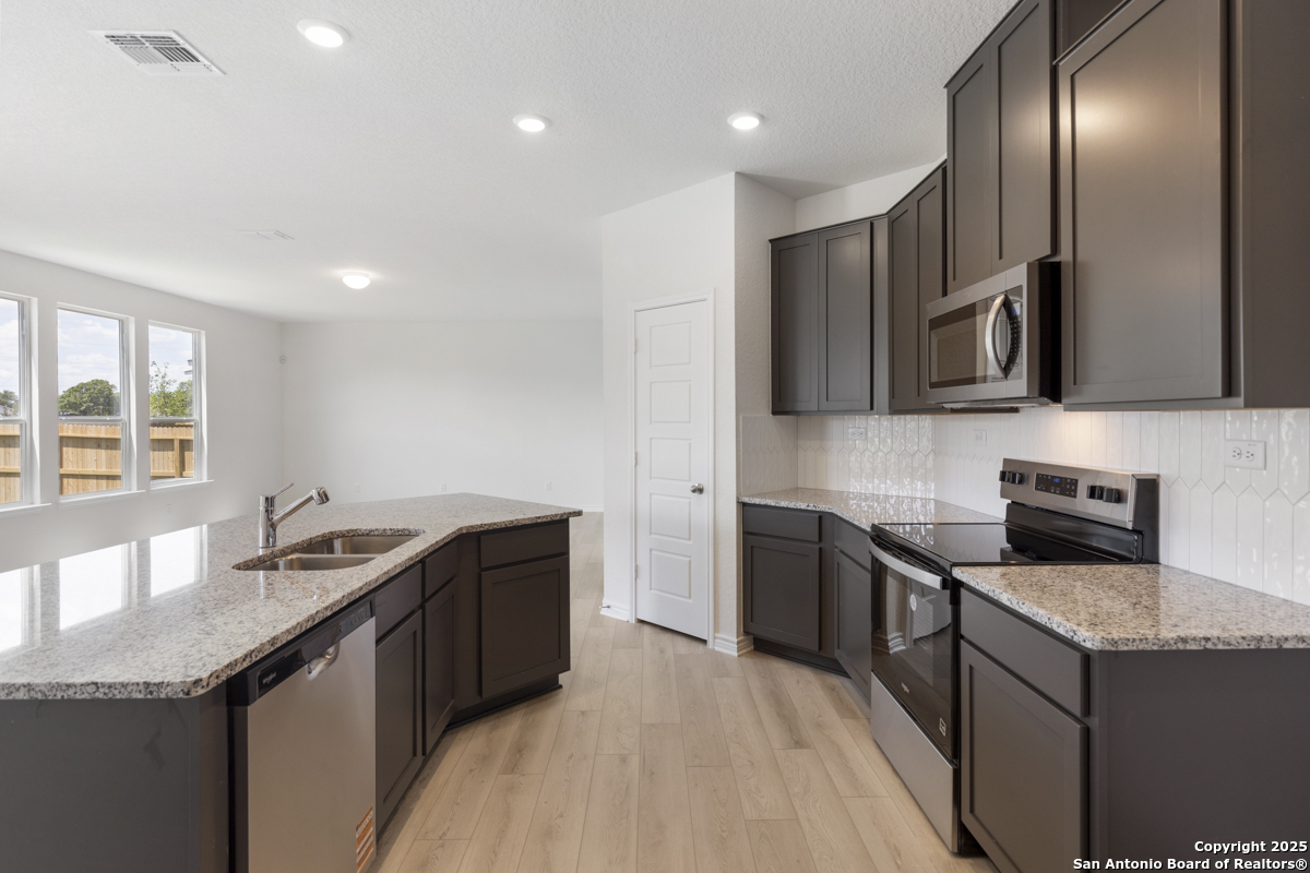 This beautifully designed home offers 9-ft. first-floor ceilings and a versatile den with double doors. The kitchen impresses with Whirlpool stainless steel appliances, Woodmont Dakota Shaker panel 42-in. upper cabinets, a Daltile tile backsplash, an extended breakfast bar, and stunning granite countertops in Aspen White. The primary bath boasts upgraded cabinets and a luxurious walk-in entry shower with a tile surround. Stylish details include a Carrara-style entry door, Kwikset Smartcode Contemporary knob interior door hardware, and durable vinyl plank flooring in the great room, kitchen, and primary bathroom. Modern conveniences include a wireless security system and an automatic sprinkler system for effortless living.