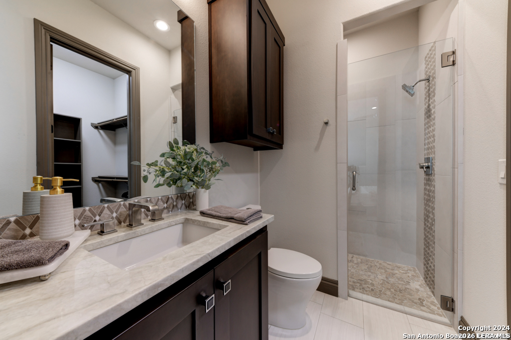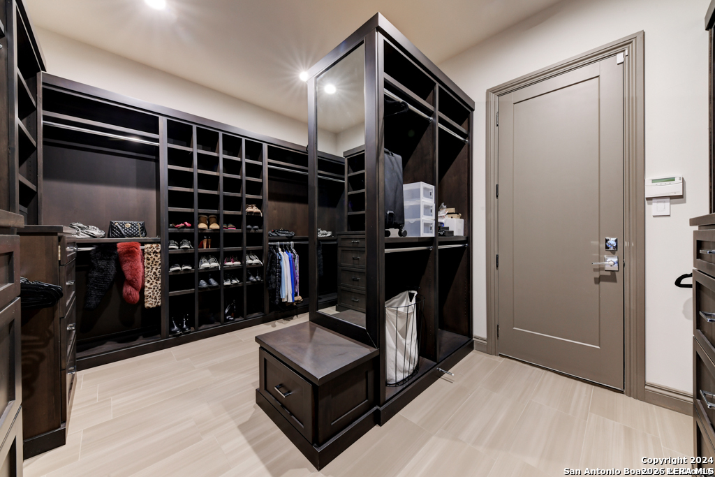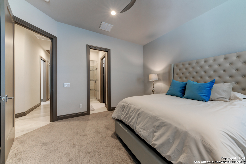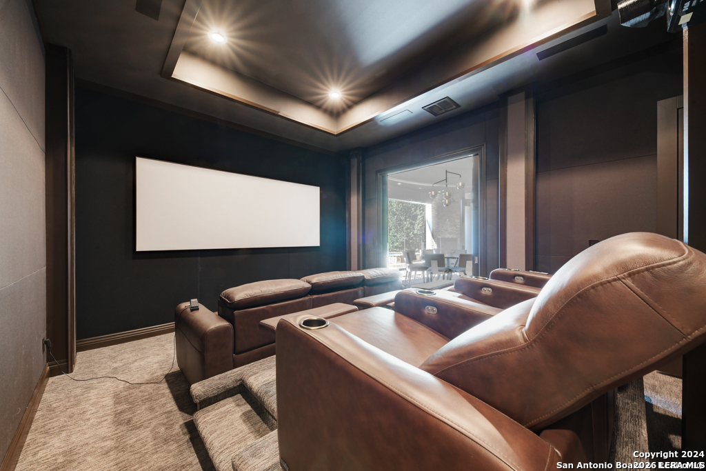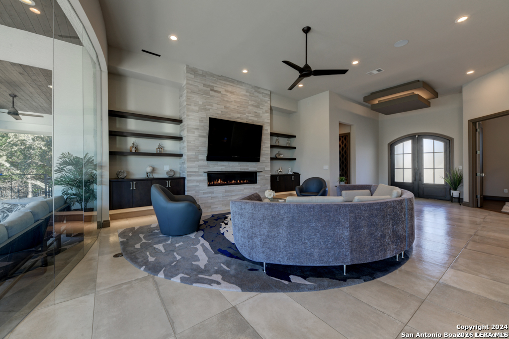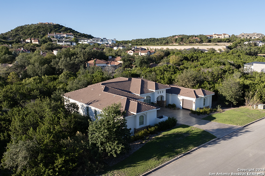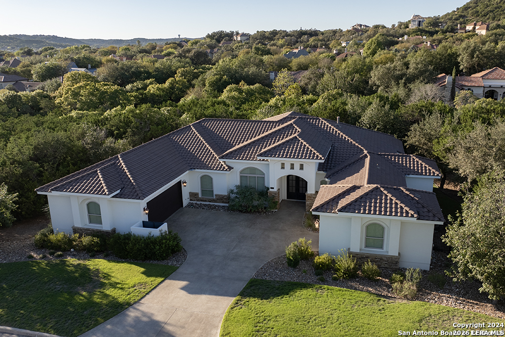 Discover unparalleled elegance in this sprawling one-story modern Mediterranean estate! This home redefines luxury living, featuring four bedrooms, 4.5 baths, a private office, a state-of-the-art theater, and a personal gym/bonus room off the primary suite. The meticulously designed open floor plan is perfect for entertaining, with two opposing garages offering parking for three vehicles. The exquisite chef's kitchen flows seamlessly into the living and dining areas, showcasing stunning architectural details and high-end finishes. Flow effortlessly into your own secluded outdoor oasis on an expansive greenbelt lot. The extended outdoor living space includes a large, covered patio, a fully equipped outdoor kitchen with a gas grill and fridge, plus an infinity-edge pool with spa--all surrounded by lush, newly updated landscaping. Professionally designed and recently refreshed with a freshly painted exterior, this home is move-in ready. Furnishings are negotiable, making this a turnkey luxury experience. Don't miss this rare opportunity to own a masterpiece in one of San Antonio's most exclusive communities.