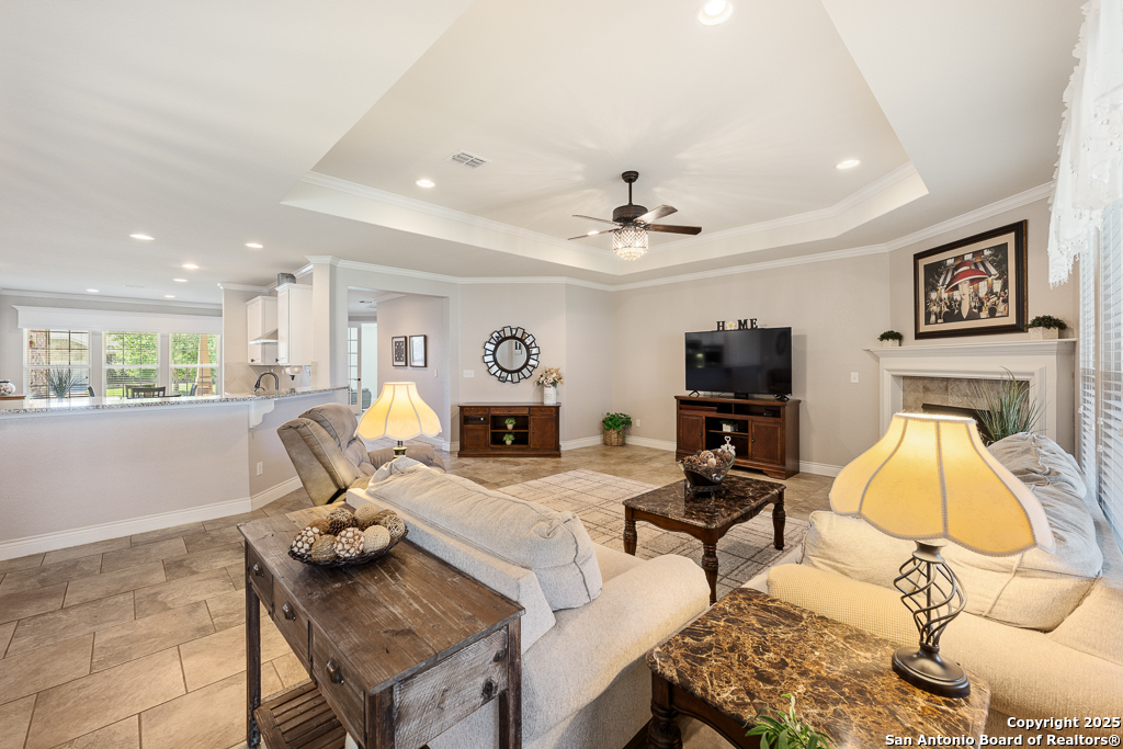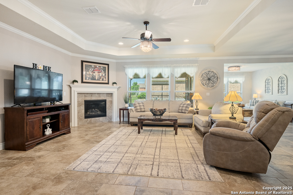 PRICE DROP!!! One of the most beautifully designed and immaculately maintained properties sure to be found in the Del Webb community of Hill Country Retreat, 4203 Paddling Pass is an entertainer's dream! The beautiful open layout features a recently renovated (!) gourmet kitchen with granite counters and stainless-steel appliances, including a gas range and double ovens, opening up to a living/dining combined space with tall ceilings and plentiful natural light. Rarely found in this floor plan, a sunroom off to the side extends the living area beautifully and provides a cozy room full of windows for reading, crafting, or relaxing. Off the sunroom you'll find a large screened in porch, open on two sides, that takes advantage of the glorious breeze provided in the perfect location of the home, sitting on the corner lot on a hill. The spacious living room focuses on a cozy fireplace tucked in the corner to warm the heart in cold winter months. A third living area/office is found at the front of the house with double glass doors (great for a TV room!). The primary suite is spacious and bright, with a beautifully expansive primary bath featuring a large walk-in/roll-in shower. The primary closet is roomy and well designed with plenty of hanging space in addition to extra storage. With a second en-suite bedroom complete with full bath and walk in closet, this pristine, no carpet home combines resort-style living with unmatched comfort. Close to shopping, dining, and parks. The Del Webb community is a Senior Community with activities and amenities to keep life fun and full.
