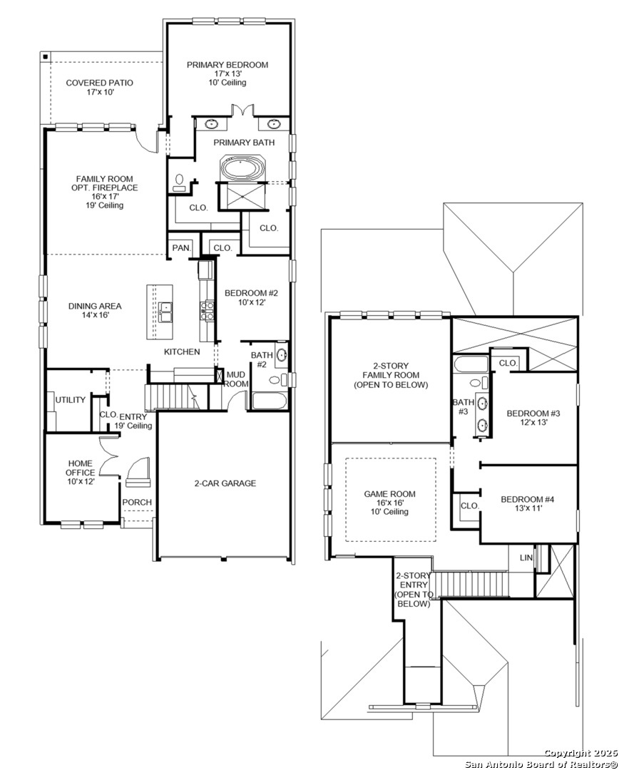 Home office with French doors set at two-story entry. Dining area opens to kitchen and adjacent two-story family room. Kitchen features walk-in pantry, a 5-burner gas cooktop and generous island with built-in seating space. Family room features wall of windows. First-floor primary suite includes primary bath with dual vanity, garden tub, separate glass-enclosed shower and two walk-in closets. An additional bedroom is downstairs. A game room and two secondary bedrooms are upstairs. Covered backyard patio. Landscape features a 5-zone sprinkler system. Mud room off two-car garage.