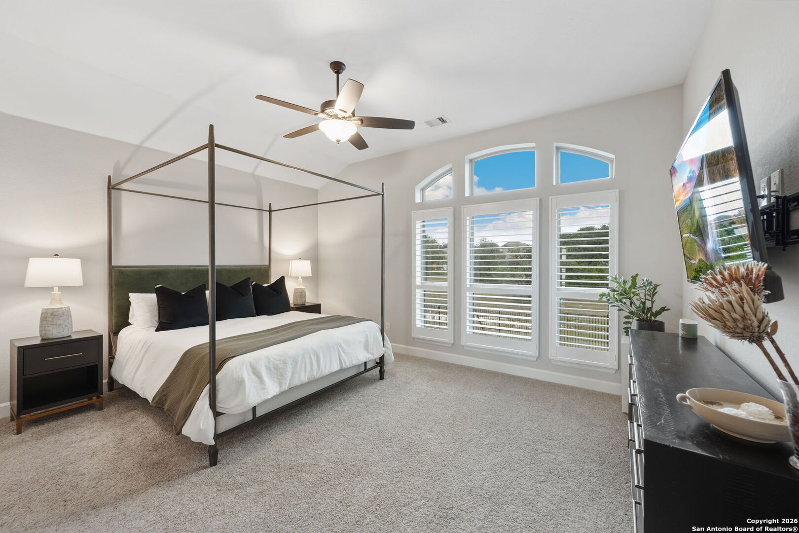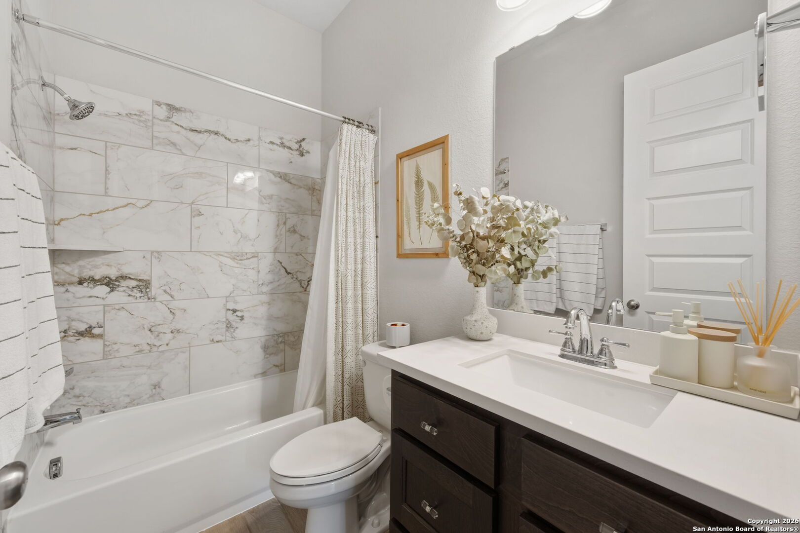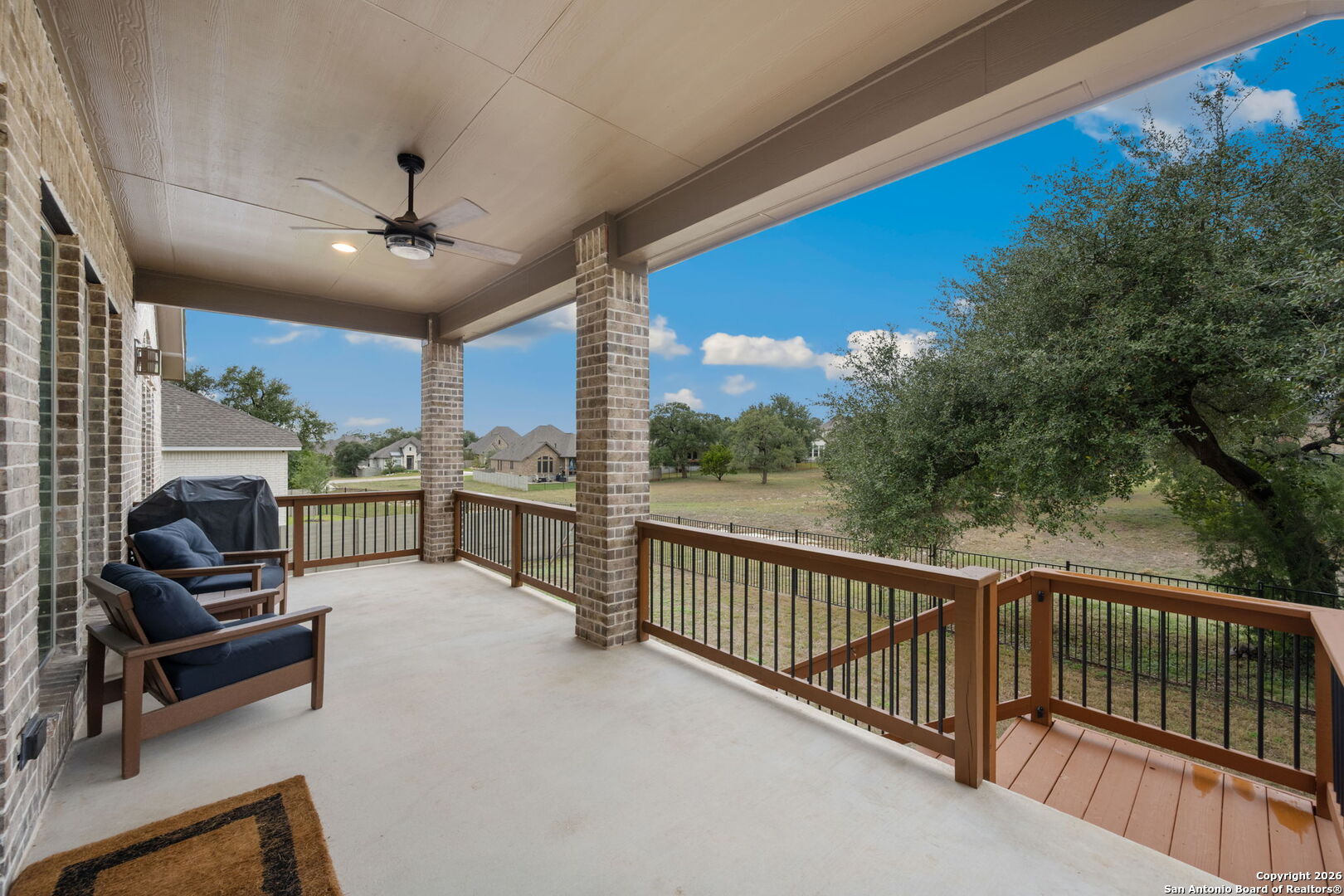 Beautifully maintained home in The Grove at Vintage Oaks, built in 2021 and set on an over 9,500 sq ft lot backing to a peaceful greenbelt with a majestic oak tree providing exceptional privacy. Offering 2,633 square feet, this thoughtfully designed single-story layout features 4 bedrooms, 3 full baths, and a desirable 3-car tandem garage with an epoxy-coated floor. This home showcases a truly exceptional kitchen designed to be lived around, featuring a generous island, abundant counter and cabinet space, stainless steel appliances, built-in microwave, 36" gas range, and double built-in ovens. Luxurious snowfall granite countertops with an elegant ogee edge are complemented by a custom arabesque stone backsplash, creating a striking yet timeless finish ideal for both everyday living and entertaining. The open-concept floor plan provides comfortable everyday living with flexibility for guests or a home office. Enjoy resort-style Vintage Oaks amenities including pools, a lazy river, extensive walking trails, and a full calendar of community events-all within one of New Braunfels' most sought-after Hill Country communities.