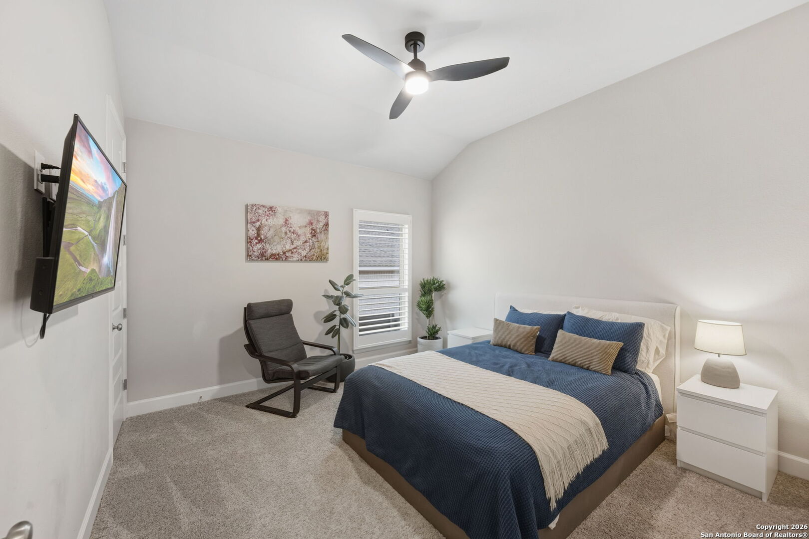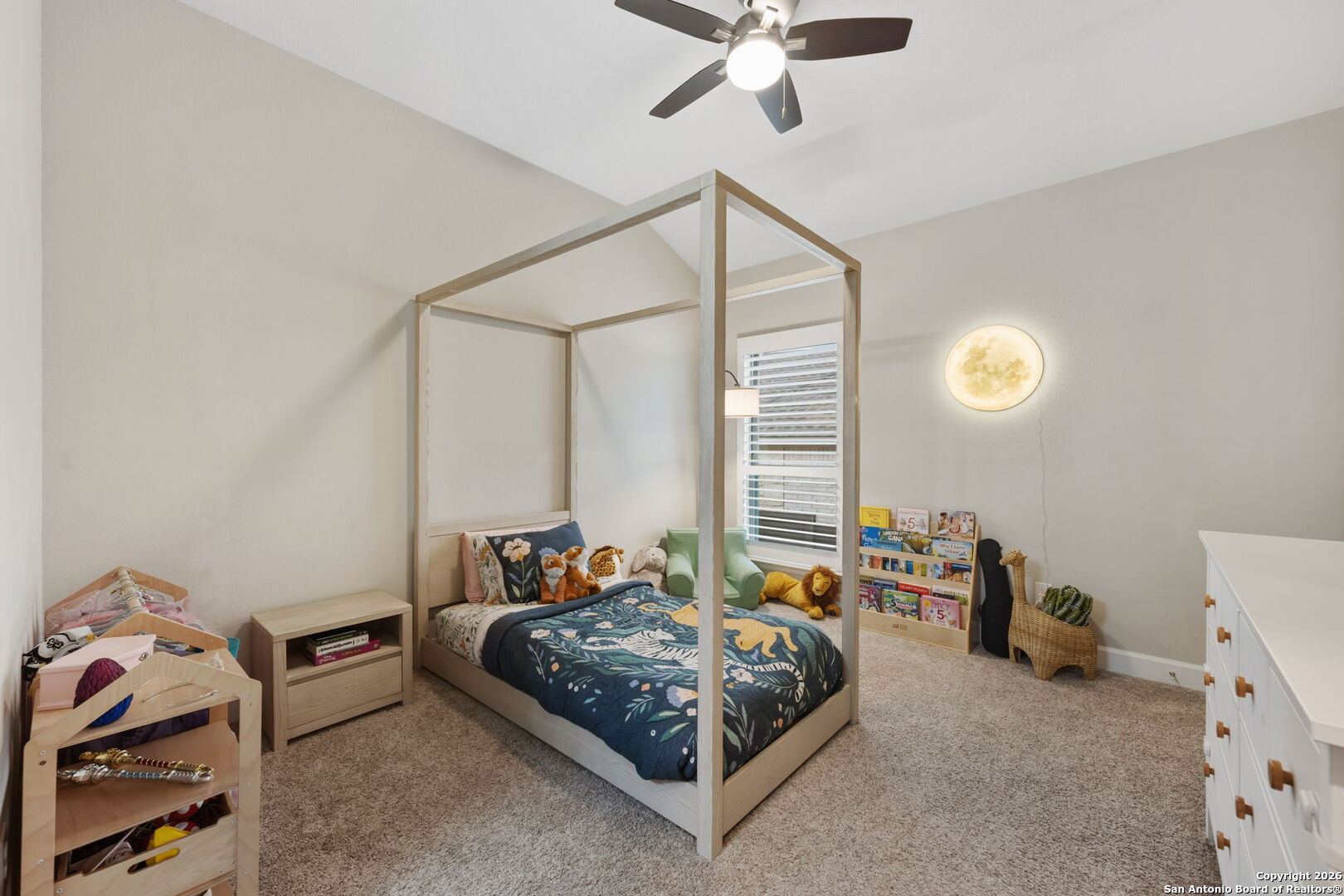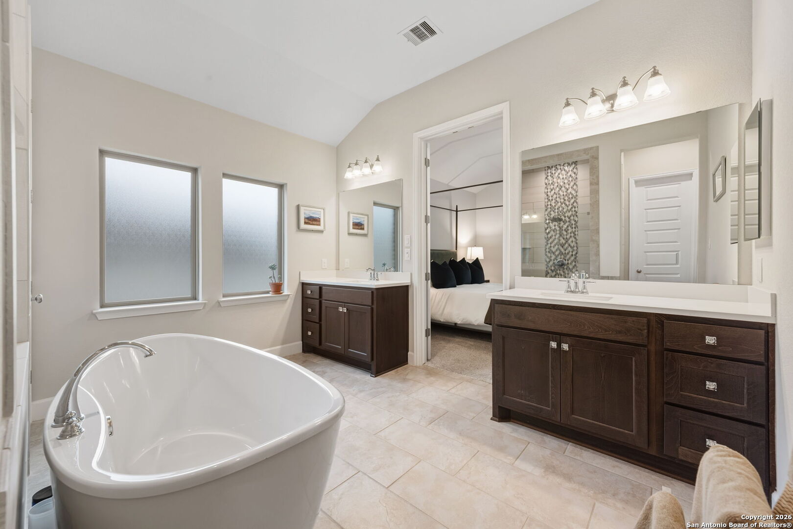 Beautifully maintained home in The Grove at Vintage Oaks, built in 2021 and set on an over 9,500 sq ft lot backing to a peaceful greenbelt with a majestic oak tree providing exceptional privacy. Offering 2,633 square feet, this thoughtfully designed single-story layout features 4 bedrooms, 3 full baths, and a desirable 3-car tandem garage with an epoxy-coated floor. This home showcases a truly exceptional kitchen designed to be lived around, featuring a generous island, abundant counter and cabinet space, stainless steel appliances, built-in microwave, 36" gas range, and double built-in ovens. Luxurious snowfall granite countertops with an elegant ogee edge are complemented by a custom arabesque stone backsplash, creating a striking yet timeless finish ideal for both everyday living and entertaining. The open-concept floor plan provides comfortable everyday living with flexibility for guests or a home office. Enjoy resort-style Vintage Oaks amenities including pools, a lazy river, extensive walking trails, and a full calendar of community events-all within one of New Braunfels' most sought-after Hill Country communities.