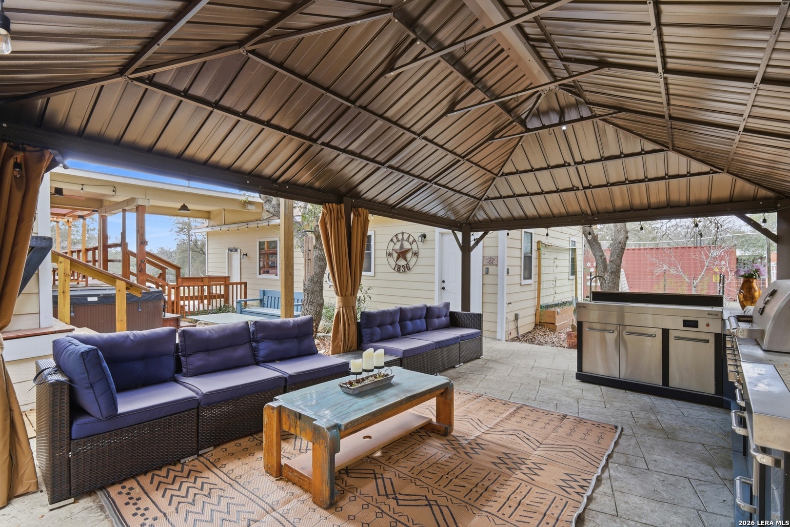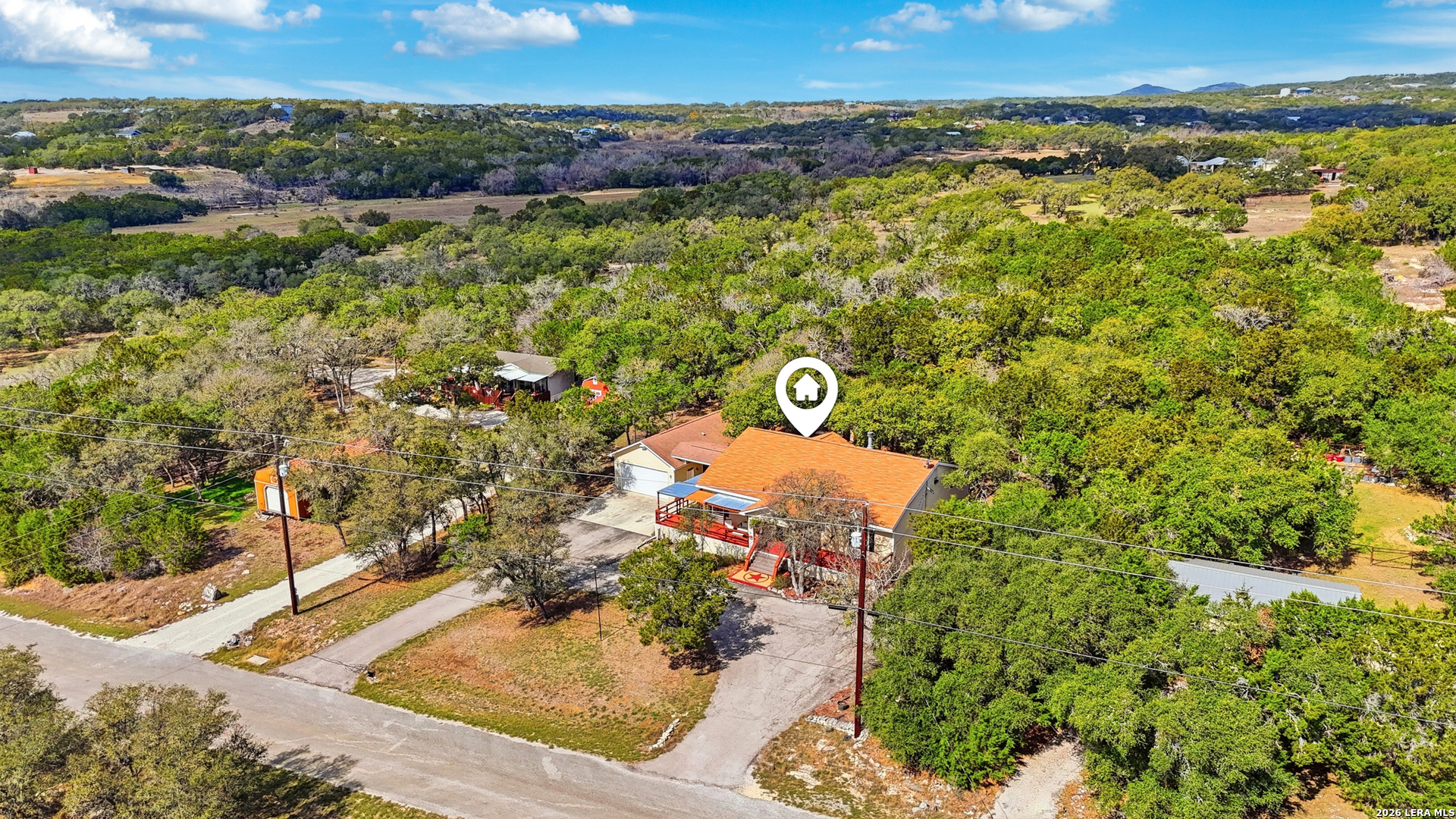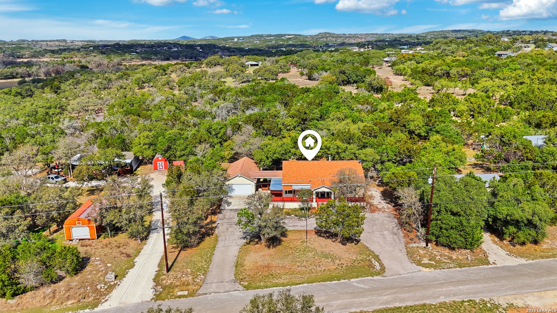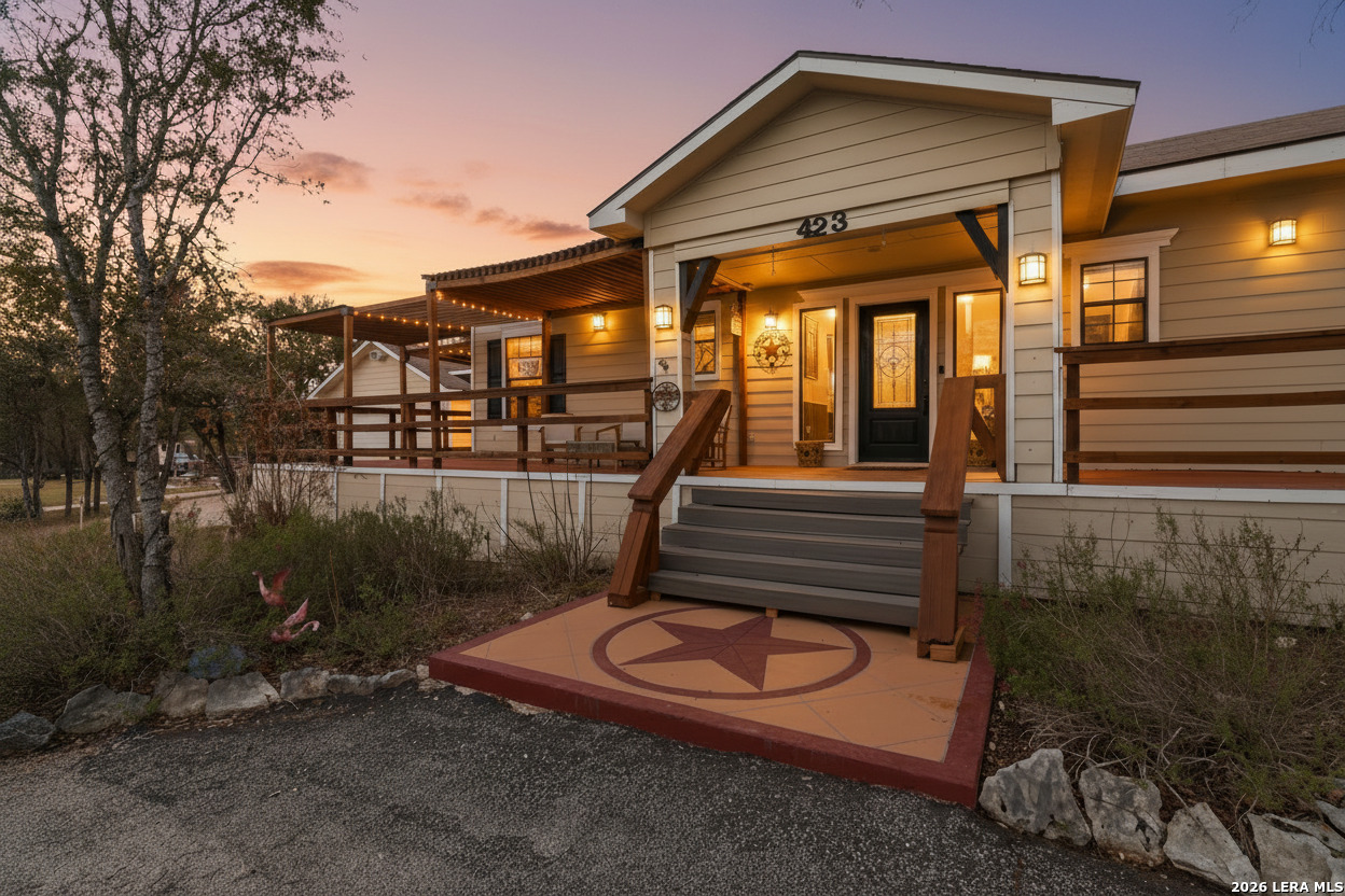 Nestled in the heart of the Texas Hill Country, this charming oasis sits on a spacious .57-acre lot designed for both relaxation and entertaining. A welcoming wraparound porch sets the tone for peaceful mornings and scenic evenings, while the outdoor living spaces truly shine - featuring a fully equipped outdoor kitchen, private hot tub, garden area, and an expansive backyard perfect for gatherings, games, and memorable nights under the stars. Inside, this 1.5-story home offers a flexible and inviting layout with 3 bedrooms and 3 full baths. The massive upstairs suite includes a private bath and kitchenette, making it ideal for guests, multi-generational living, a caretaker's quarters, or even a game room or man cave. Recent upgrades provide modern comfort and style, including all-new appliances, granite countertops, new carpet, and updated flooring throughout. A detached two-car garage with an oversized workshop space adds exceptional functionality for hobbies, storage, or projects. This property blends Hill Country charm, thoughtful updates, and versatile living spaces - creating the perfect retreat to make home!