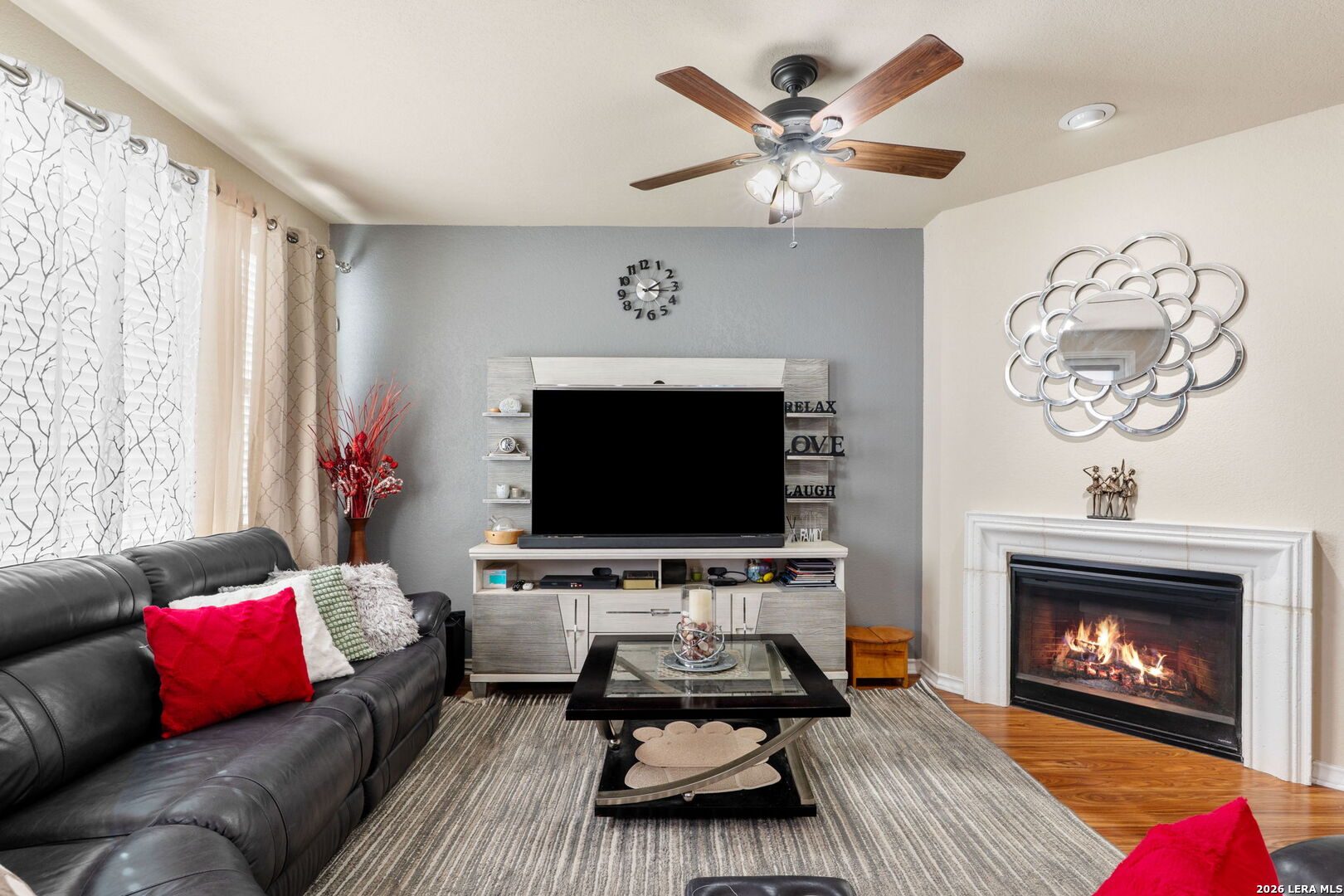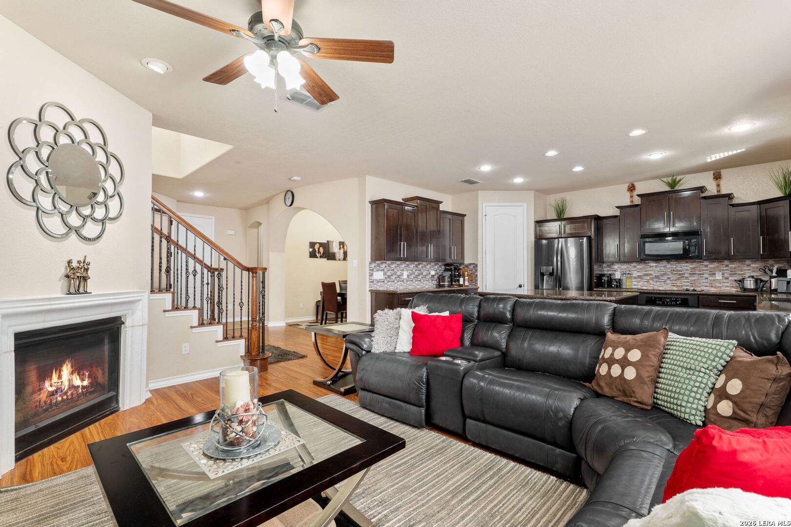 Located in the Presidio Heights neighborhood within a gated community, this two story home offers a thoughtful layout paired with stylish finishes throughout. An open floor plan creates an easy flow from the formal dining room into the main living area, where a fireplace and recessed lighting add warmth and character. The kitchen is both functional and inviting, featuring dark brown cabinets, a large kitchen island, and a breakfast bar that opens to the living space. A beautiful handrail leads upstairs to a small loft and a flex room ideal for a home office, workout room, or additional living space. The primary bedroom provides a comfortable retreat with an ensuite bathroom that includes double vanities, a separate shower and soaking tub. The upstairs guest bathroom is highlighted by beautiful tile work in the shower, adding a refined design touch. Outdoor living is enhanced by a backyard with a deck and attached shade, offering a great space for relaxing. Additional features include a metal roof and water softener. Neighborhood amenities include a park and pool, while the location offers easy access to Loop 1604 and I10, a short commute to Camp Bullis, and close proximity to La Cantera and Six Flags. The property is located within award winning NISD.