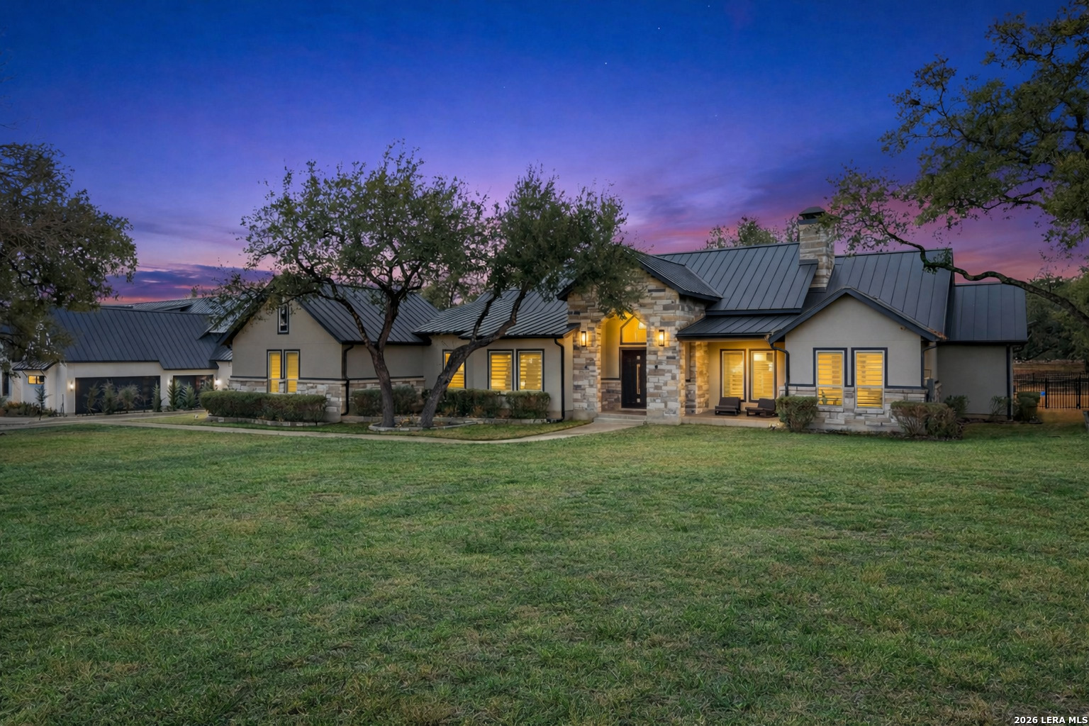 Located in Mystic Shores, a controlled-access gated community in Spring Branch, this stunning single-story home sits on over an acre and offers refined Hill Country living with thoughtful upgrades and elevated design throughout. Just minutes from the Guadalupe River and Canyon Lake, the property combines privacy, space, and convenience. Inside, high ceilings and an open floor plan create an airy, inviting atmosphere. The living room features vaulted ceilings accented by a striking cedar beam, a floor to ceiling stone fireplace, custom built-in shelving, and tall windows with sliding glass doors that flood the space with natural light while seamlessly connecting indoor and outdoor living. The gourmet kitchen is designed to impress with a large island, quartz countertops, stainless steel appliances, built-in appliances, gas cooktop with kettle faucet, designer tile backsplash, beautiful white cabinetry, and decorative wood beams. A bright breakfast area overlooks the backyard, making this space ideal for both everyday living and entertaining. This is a true four bedroom home with a versatile flex room perfect for a home office, media space, or additional lounge area. A private guest suite offers added flexibility for extended stays. The primary suite is a peaceful retreat featuring tray ceilings, expansive windows, and a spa inspired bathroom with dual vanities, a soaking tub, a spacious walk-in rain shower, and an oversized walk-in closet with built-in shelving. Wood look tile flooring, recessed lighting, a water softener, and a durable metal roof add both style and functionality. The laundry room includes a mud room area with a dedicated pet washing station for added convenience. Step outside to an exceptional outdoor living space complete with a covered patio, stained concrete flooring, shiplap ceiling, full outdoor kitchen, built in bar, and outdoor surround sound system. The fenced backyard provides ample room to relax or entertain. As part of Mystic Shores, residents enjoy waterfront access, a community pool, tennis courts, basketball courts, parks, and scenic trails. This Texas Hill Country home offers luxury finishes, modern upgrades, and access to premier amenities in one of the area's most desirable communities.