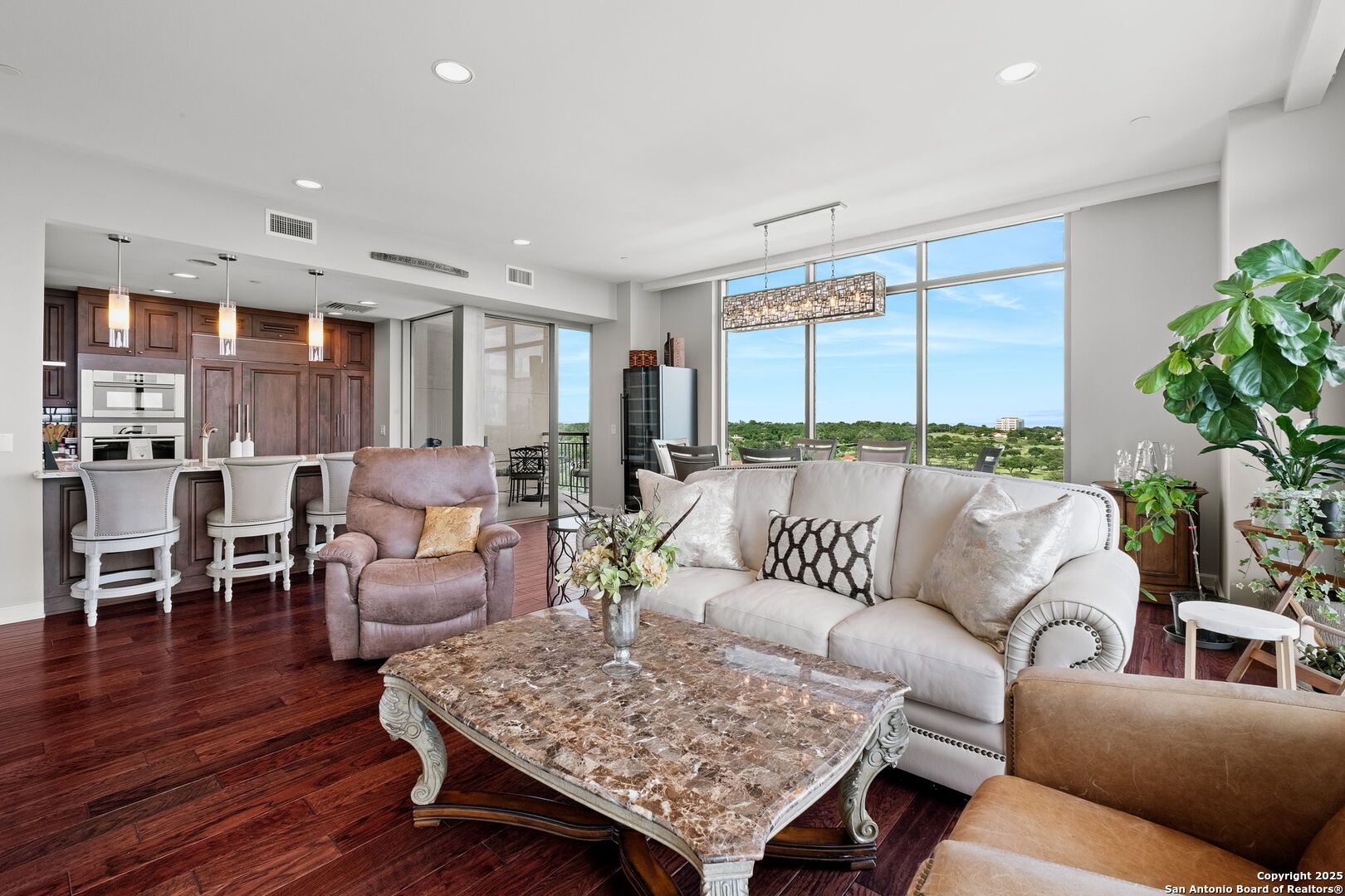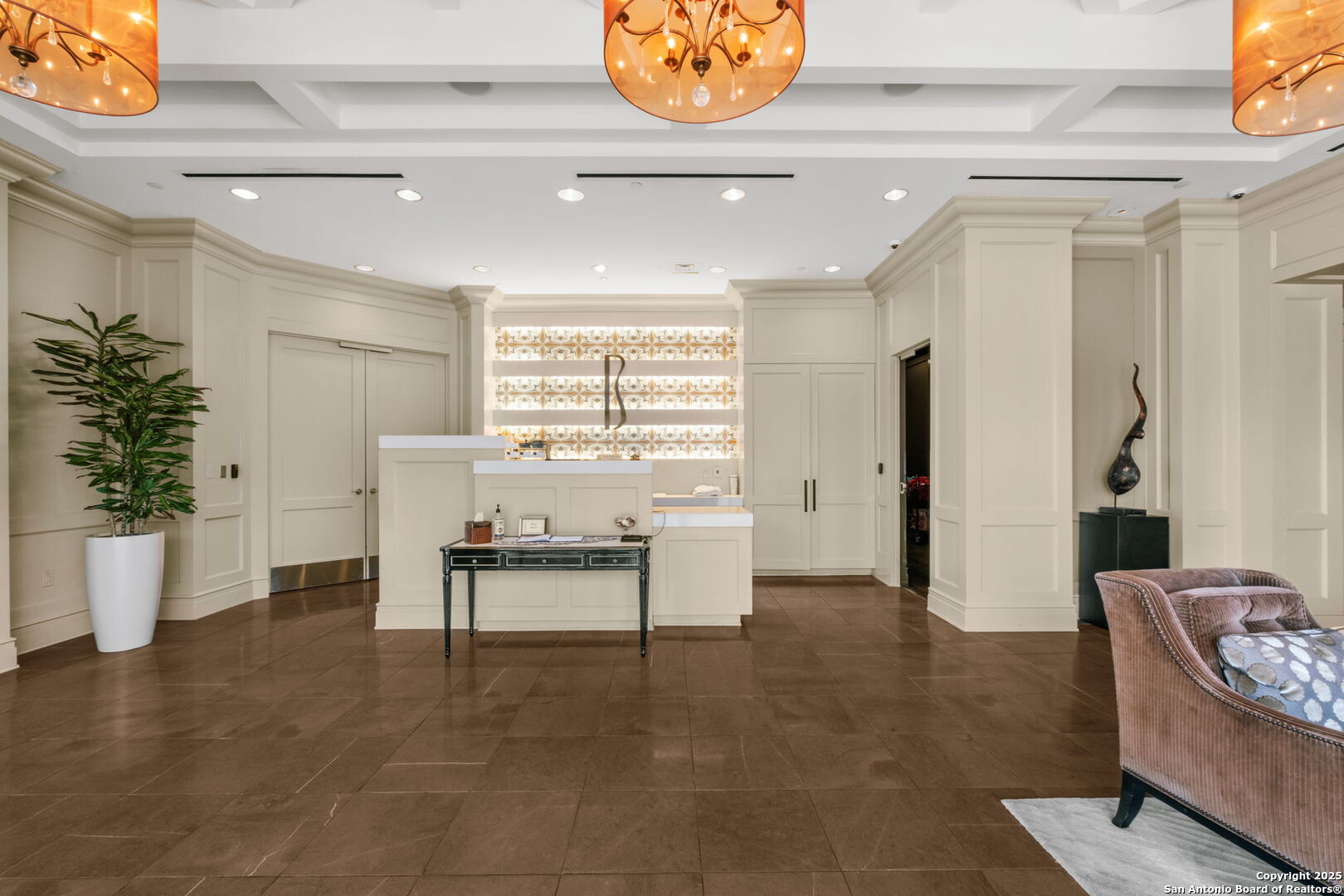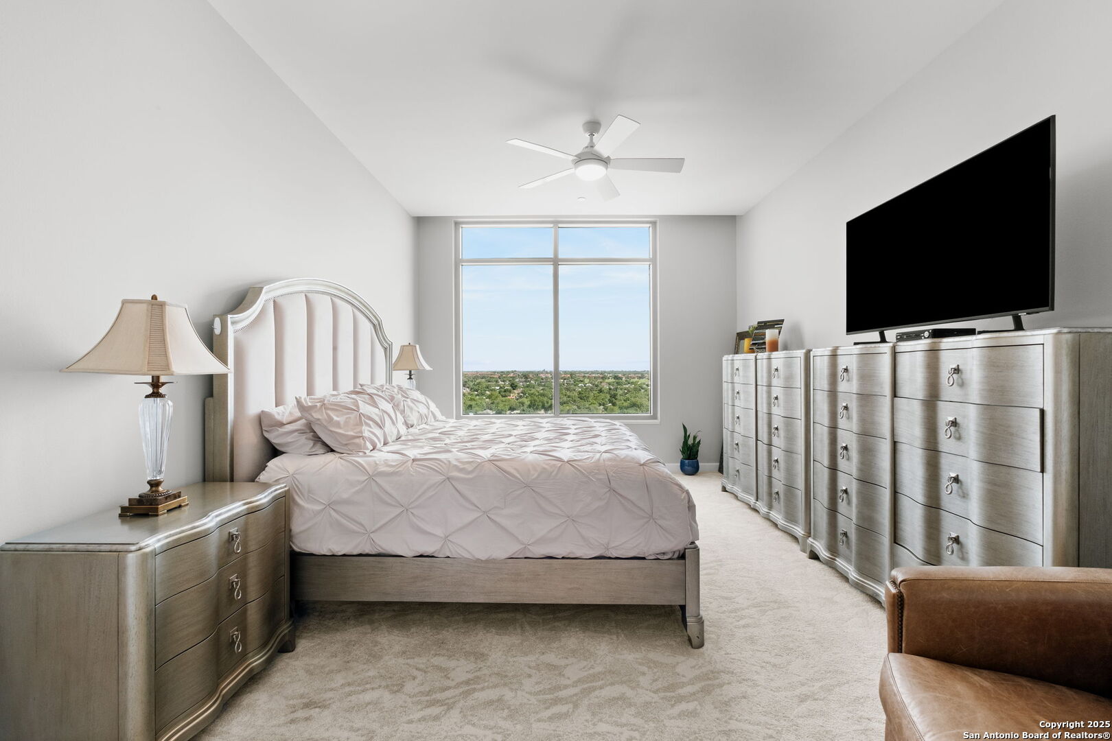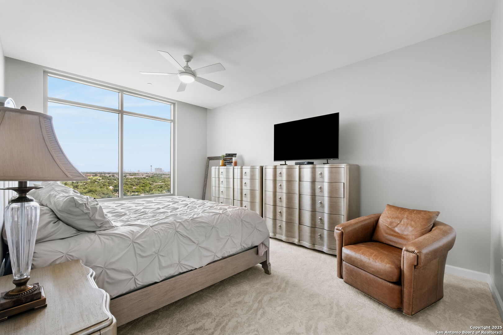 This corner unit features captivating south and east-facing views from the spacious open concept living - dining area, showcasing both the downtown San Antonio skyline and the verdant expanse of The San Antonio Country Club. The interior features a classic finish out with warm tones, complemented by a gourmet kitchen equipped with Miele appliances, gas cooking, and a Sub-Zero refrigerator. Primary suite with spa style ensuite bathroom and large walk-in closet. Stacked washer/dryer closet in unit. Residents enjoy a concierge lifestyle with dual balconies providing breathtaking vistas. The Broadway building itself is renowned for its full-service amenities, including valet parking, a 24-hour concierge, a resort-style heated pool and spa, a state-of-the-art gym, grilling stations, dog parks, sport courts, and private workout studios, ensuring unparalleled comfort and convenience.
