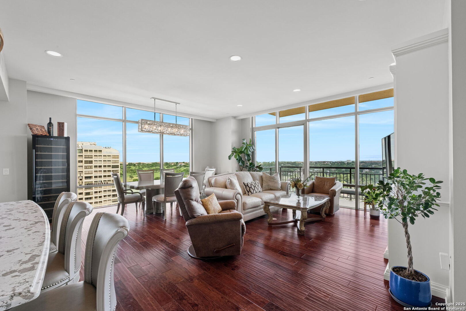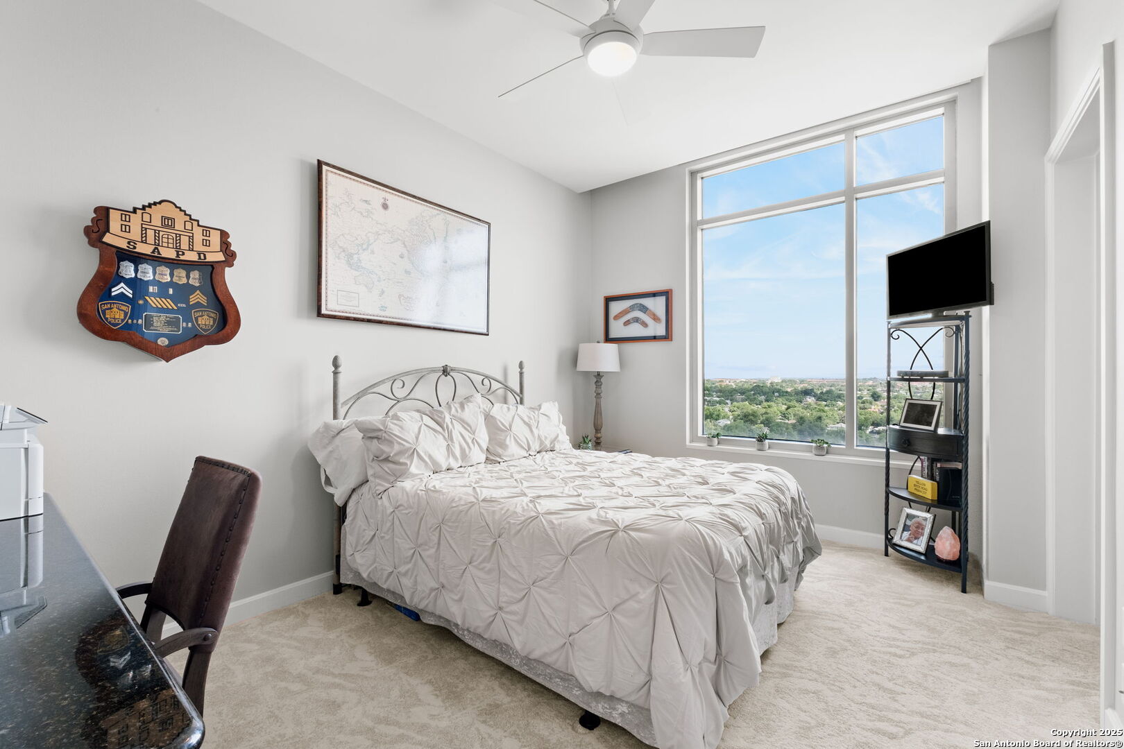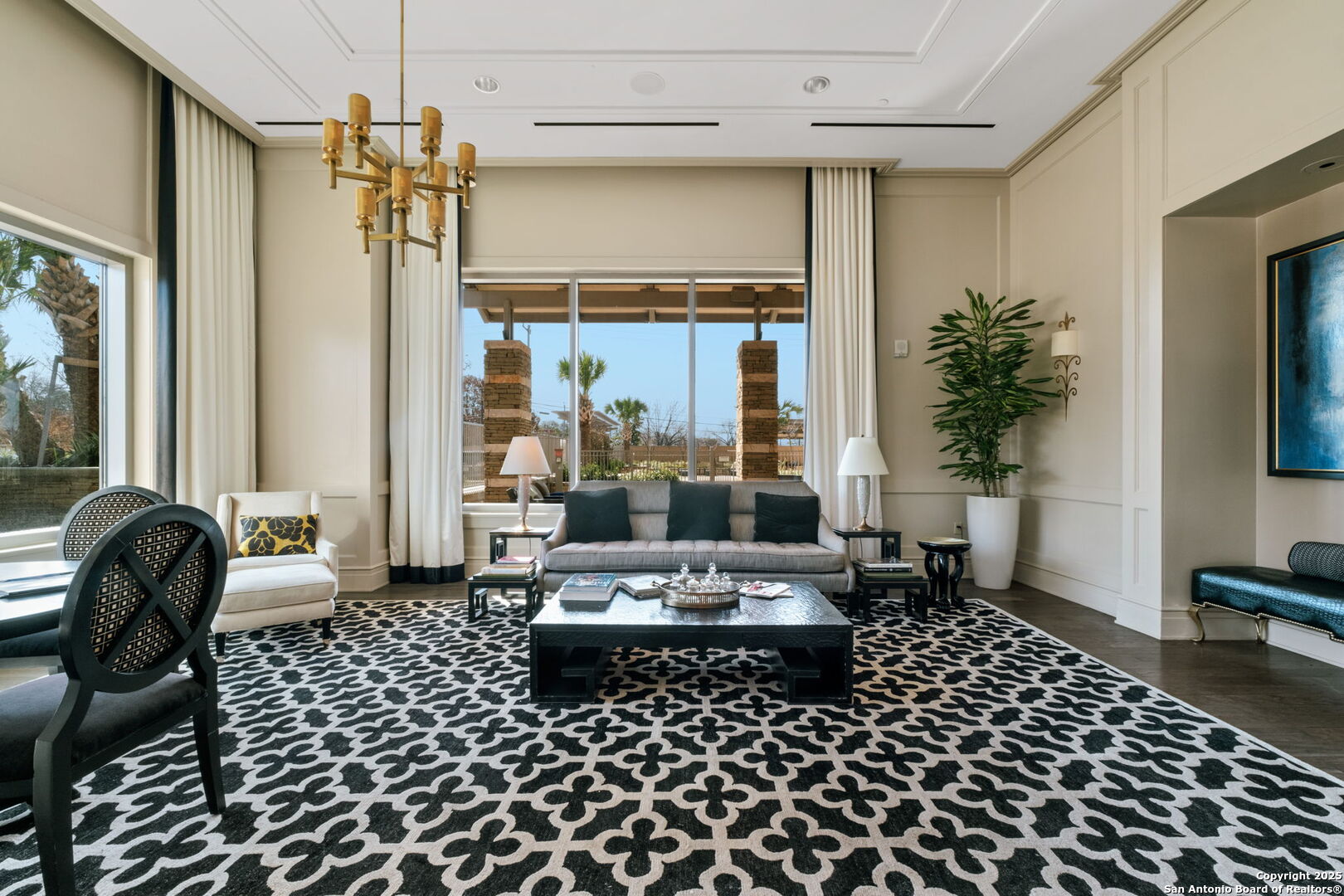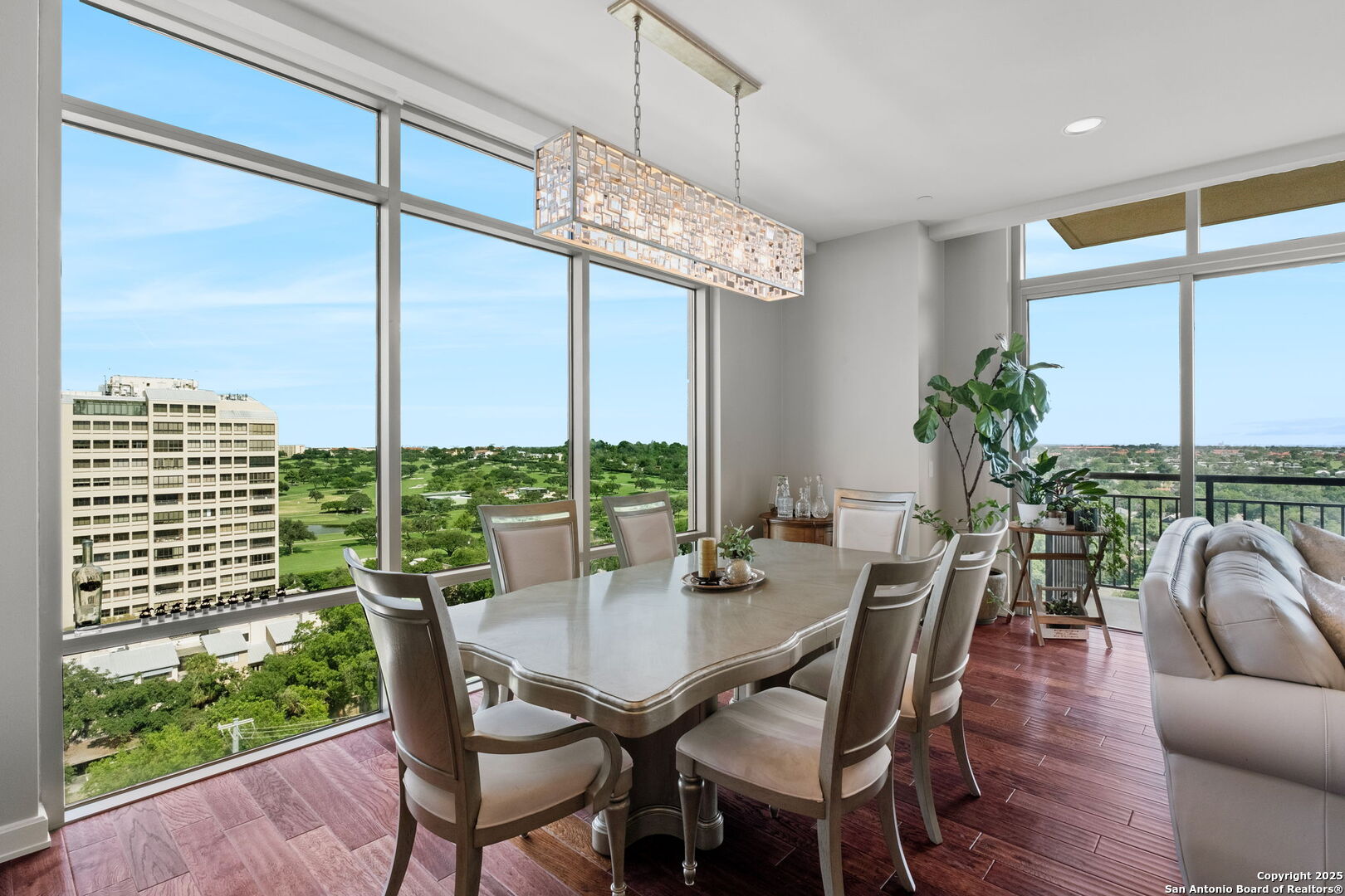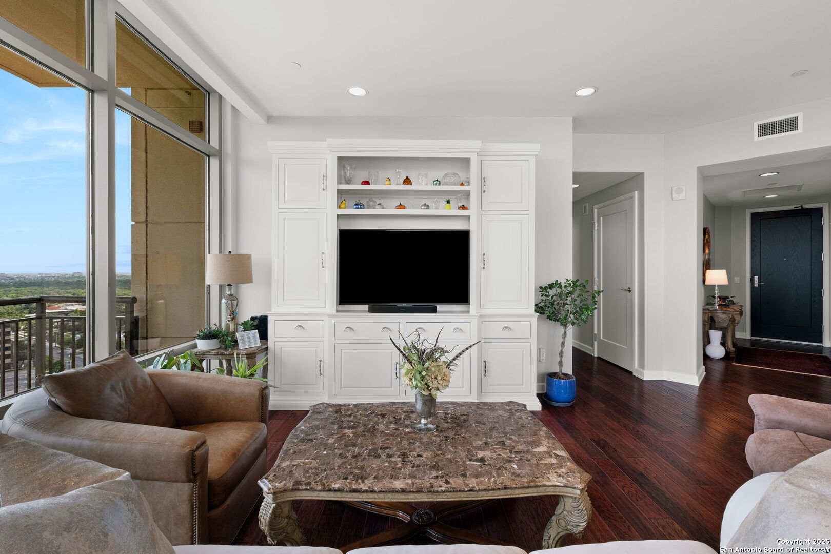 This corner unit features captivating south and east-facing views from the spacious open concept living - dining area, showcasing both the downtown San Antonio skyline and the verdant expanse of The San Antonio Country Club. The interior features a classic finish out with warm tones, complemented by a gourmet kitchen equipped with Miele appliances, gas cooking, and a Sub-Zero refrigerator. Primary suite with spa style ensuite bathroom and large walk-in closet. Stacked washer/dryer closet in unit. Residents enjoy a concierge lifestyle with dual balconies providing breathtaking vistas. The Broadway building itself is renowned for its full-service amenities, including valet parking, a 24-hour concierge, a resort-style heated pool and spa, a state-of-the-art gym, grilling stations, dog parks, sport courts, and private workout studios, ensuring unparalleled comfort and convenience.