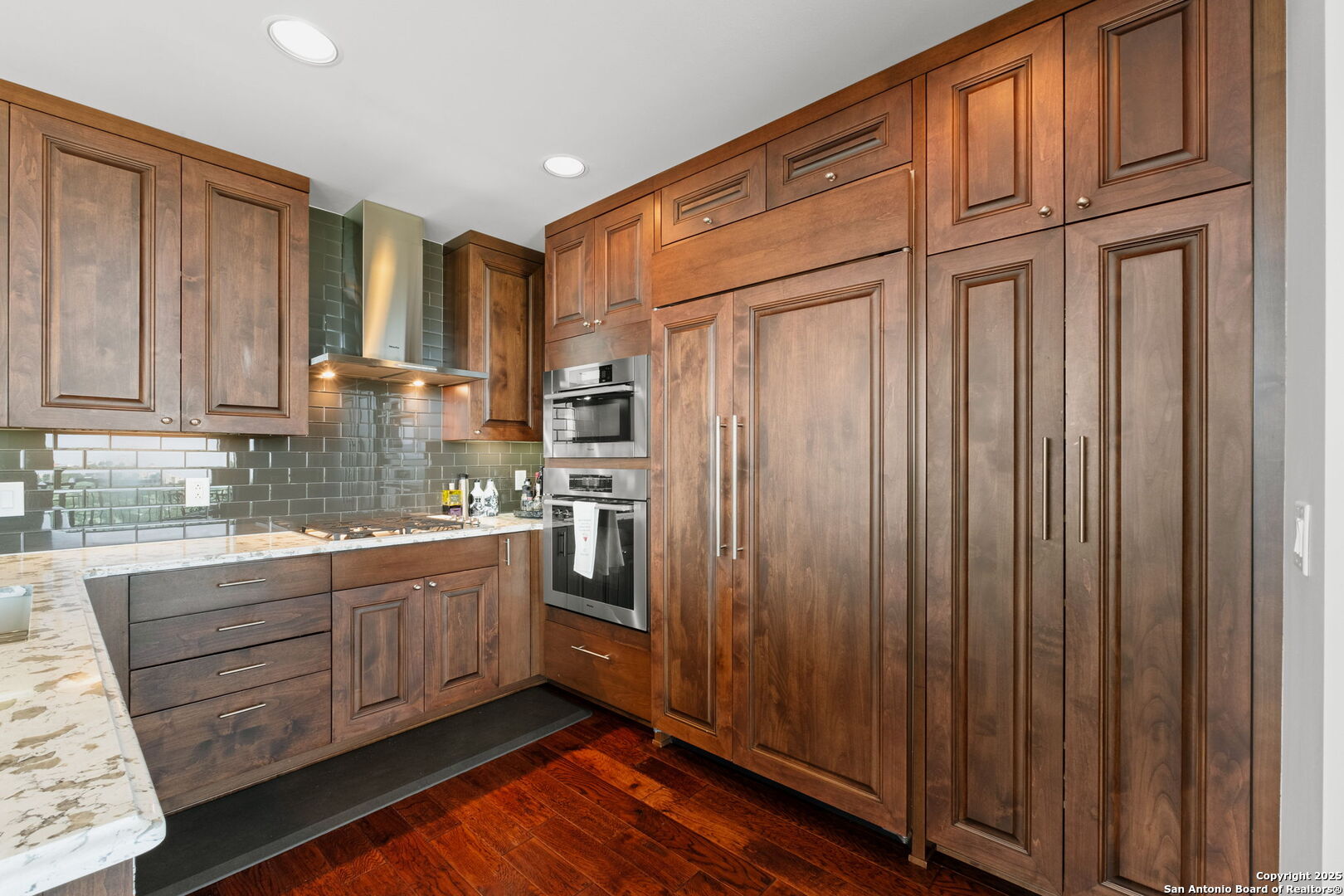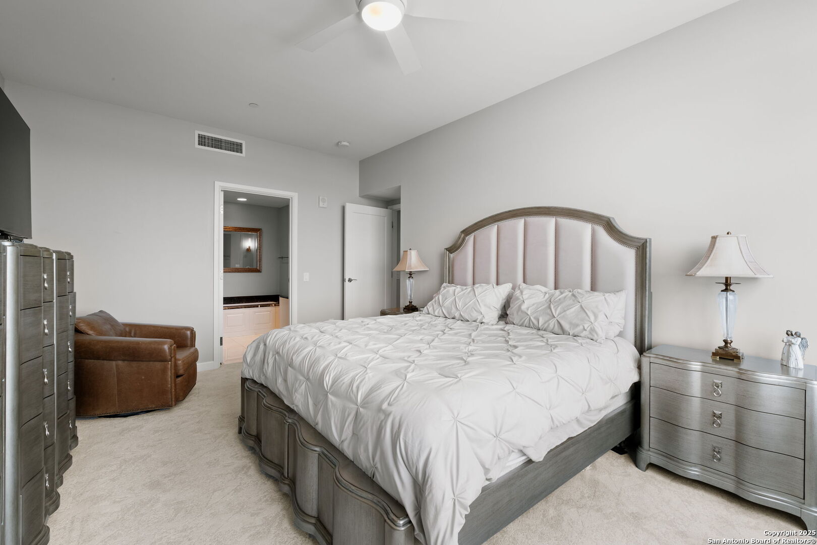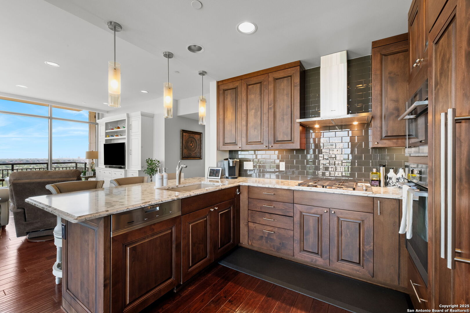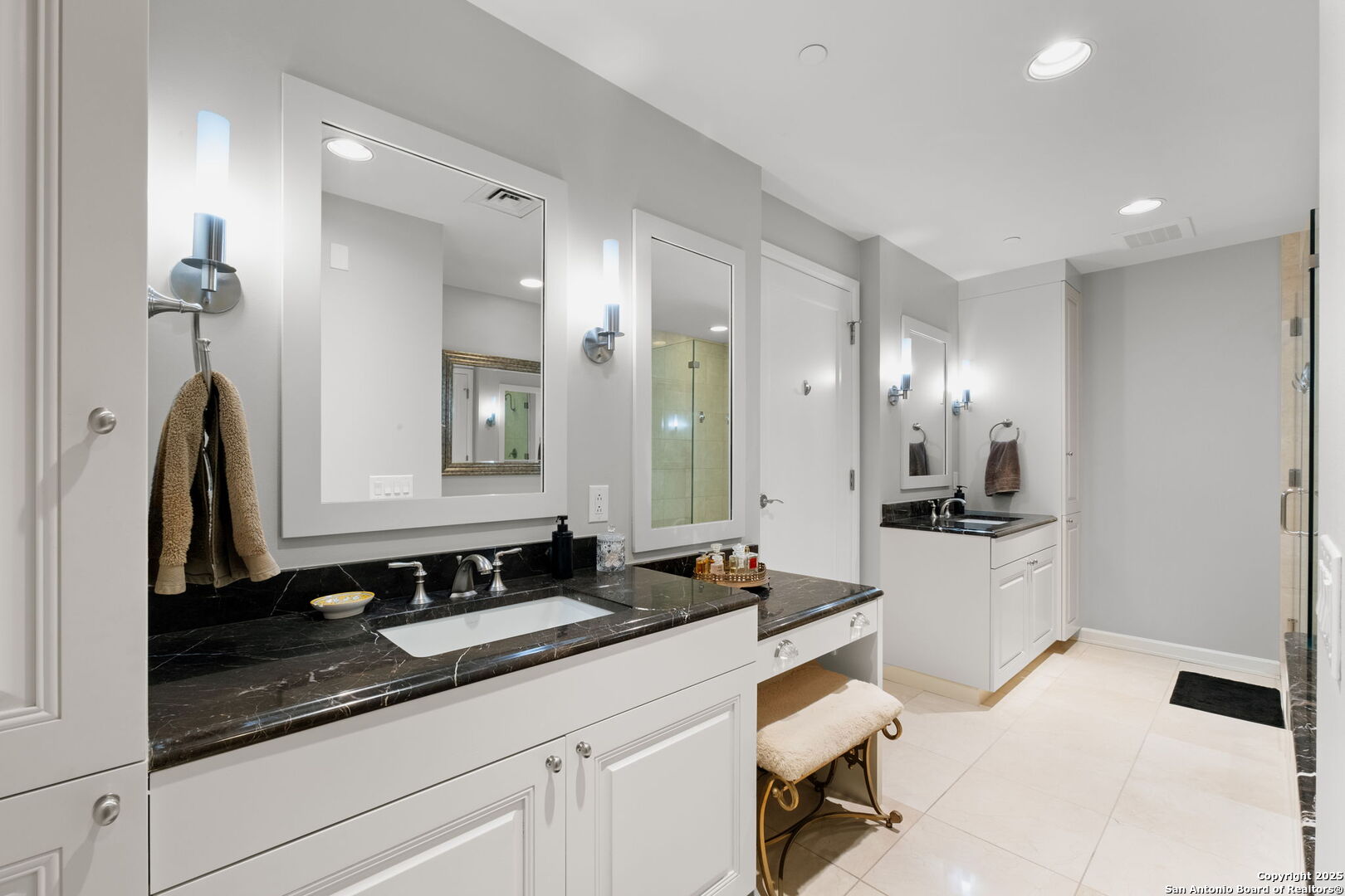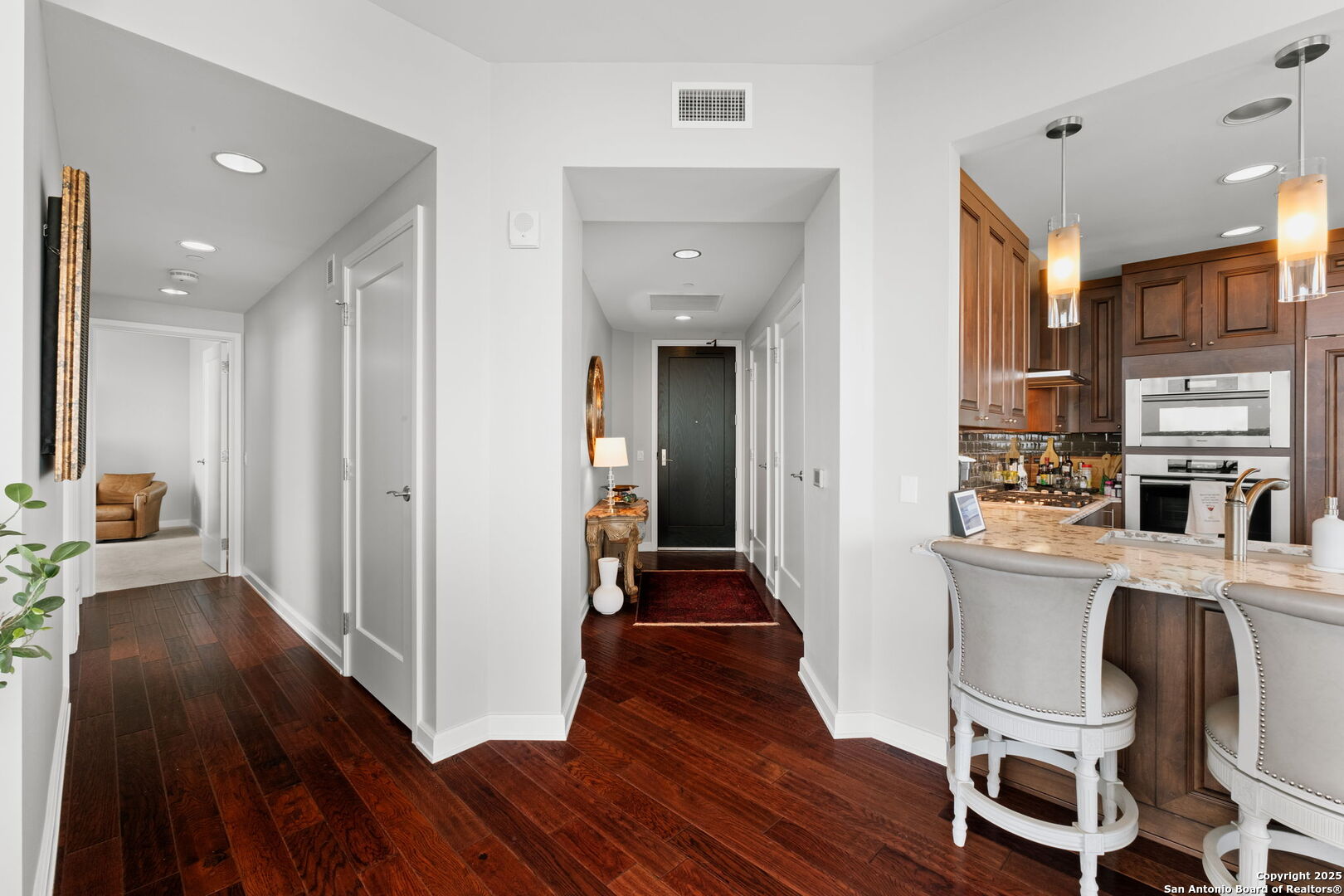 This corner unit features captivating south and east-facing views from the spacious open concept living - dining area, showcasing both the downtown San Antonio skyline and the verdant expanse of The San Antonio Country Club. The interior features a classic finish out with warm tones, complemented by a gourmet kitchen equipped with Miele appliances, gas cooking, and a Sub-Zero refrigerator. Primary suite with spa style ensuite bathroom and large walk-in closet. Stacked washer/dryer closet in unit. Residents enjoy a concierge lifestyle with dual balconies providing breathtaking vistas. The Broadway building itself is renowned for its full-service amenities, including valet parking, a 24-hour concierge, a resort-style heated pool and spa, a state-of-the-art gym, grilling stations, dog parks, sport courts, and private workout studios, ensuring unparalleled comfort and convenience.