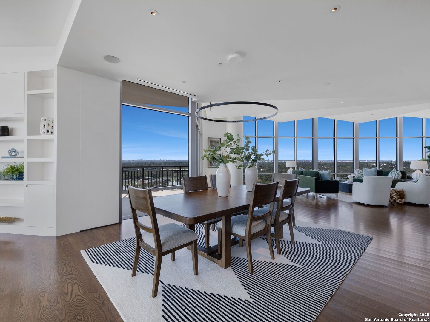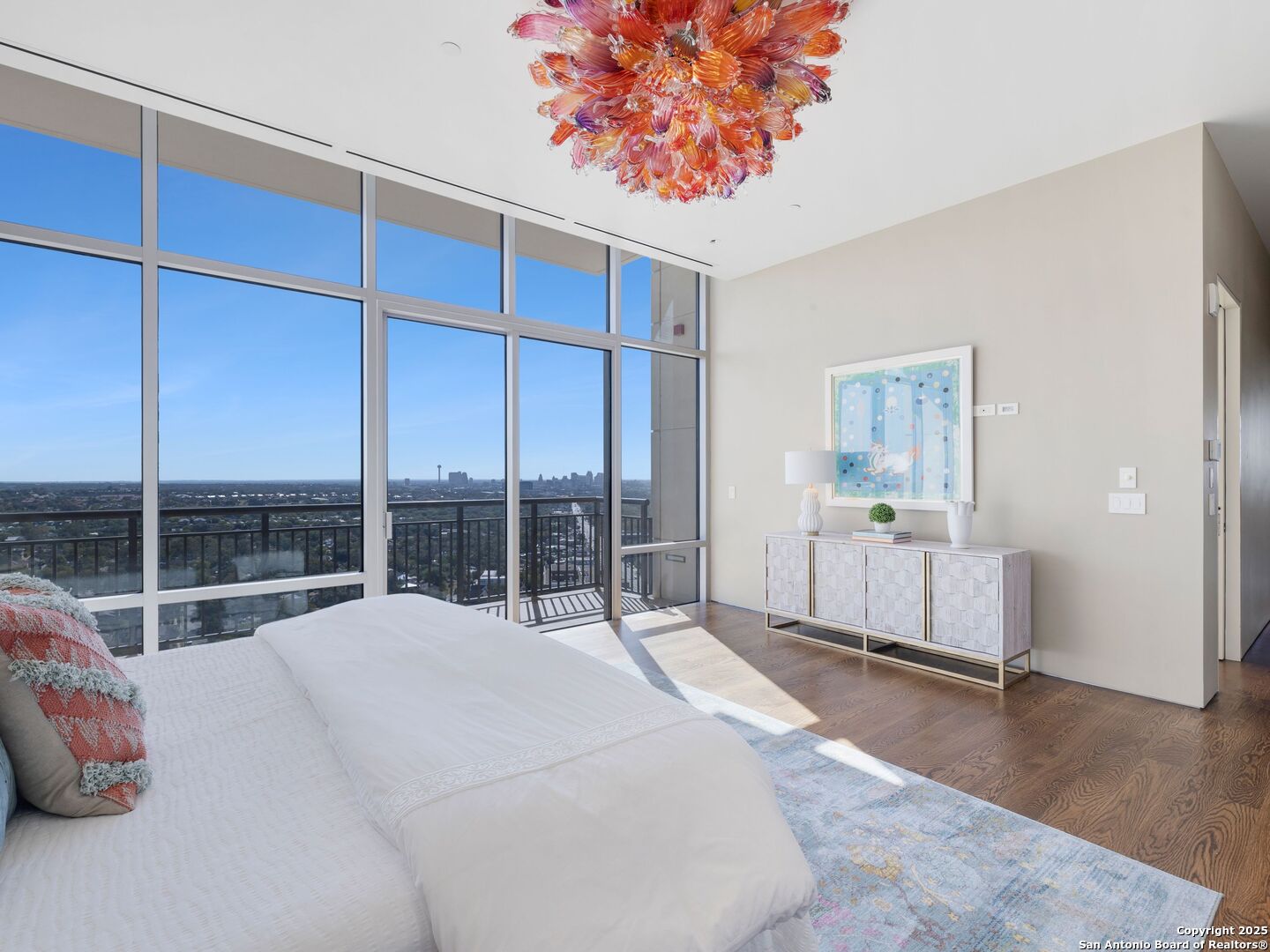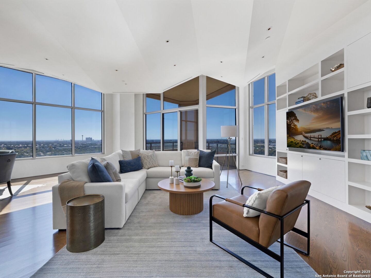 Exceptional high-rise living on one of the most desired floors at The Broadway. This refined residence captures sweeping skyline and Hill Country views through walls of floor-to-ceiling glass, creating a light-filled backdrop throughout the home. A private elevator vestibule leads into a generous open-concept layout designed for effortless daily living and sophisticated entertaining. The main living area offers multiple seating arrangements with seamless access to an outdoor terrace that frames the expansive vistas. The kitchen is finished with elevated custom cabinetry, premium stone surfaces, and a full Miele appliance suite including gas cooking. A large island anchors the space, offering both function and presence for culinary preparation or casual dining. The primary suite is positioned to maximize privacy and views, complete with its own terrace access, a spa-caliber bath with dual vanities, a walk-in shower, and a custom-fitted closet. Two additional guest suites each feature en-suite baths and generous storage, providing flexibility for visitors or extended-stay living. Additional highlights include a dedicated study/flex space, well-appointed utility room, and meticulously curated finishes throughout the home. Residents of The Broadway enjoy a premier lock-and-leave lifestyle with 24-hour valet and concierge services, state-of-the-art fitness center, resort-style pool, and unmatched security. All within minutes of the city's best dining, retail, cultural attractions, and outdoor amenities. A rare opportunity to live in one of San Antonio's most distinguished and sought-after luxury high-rise communities.