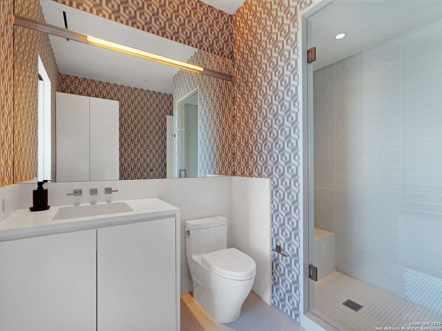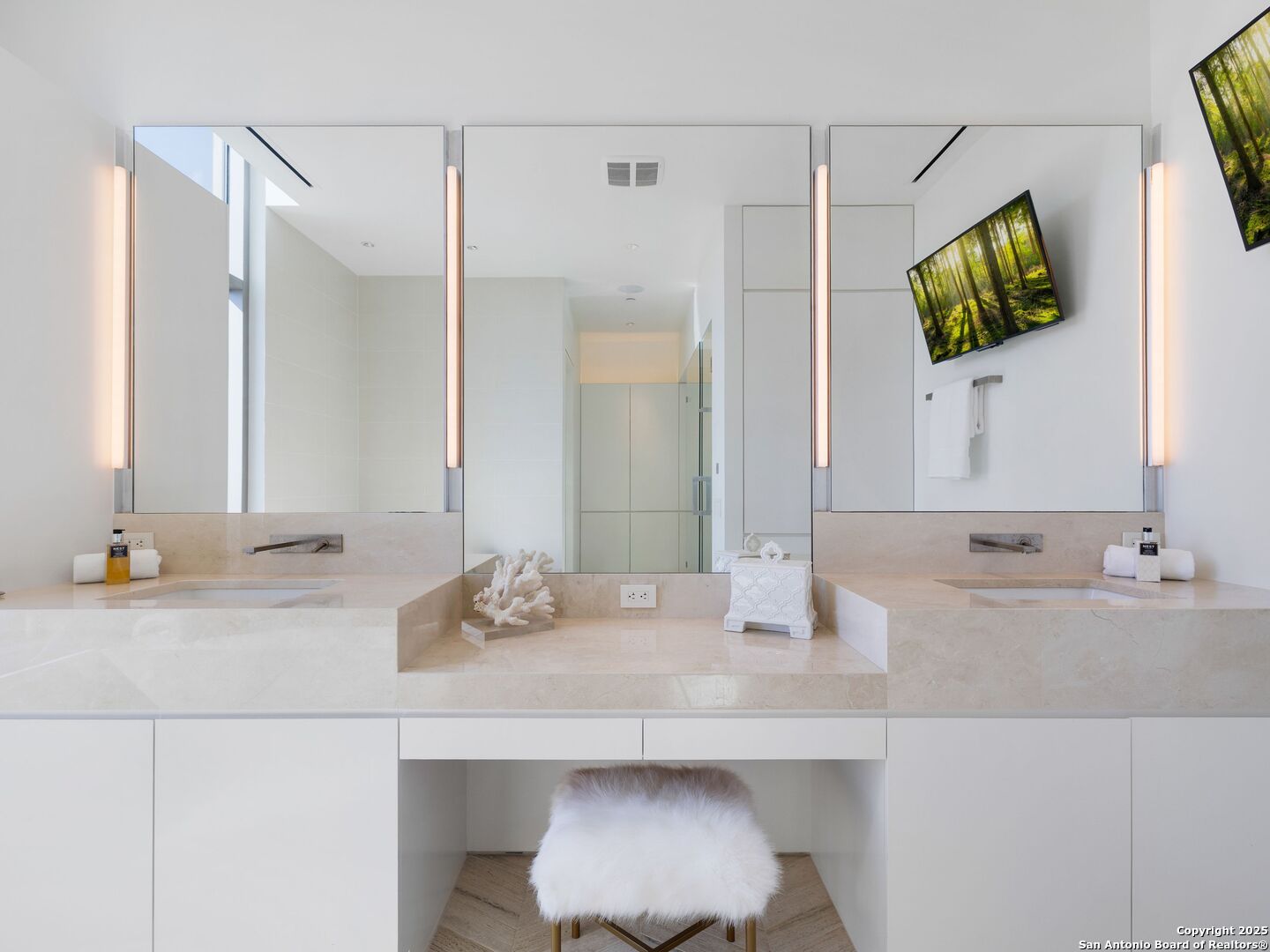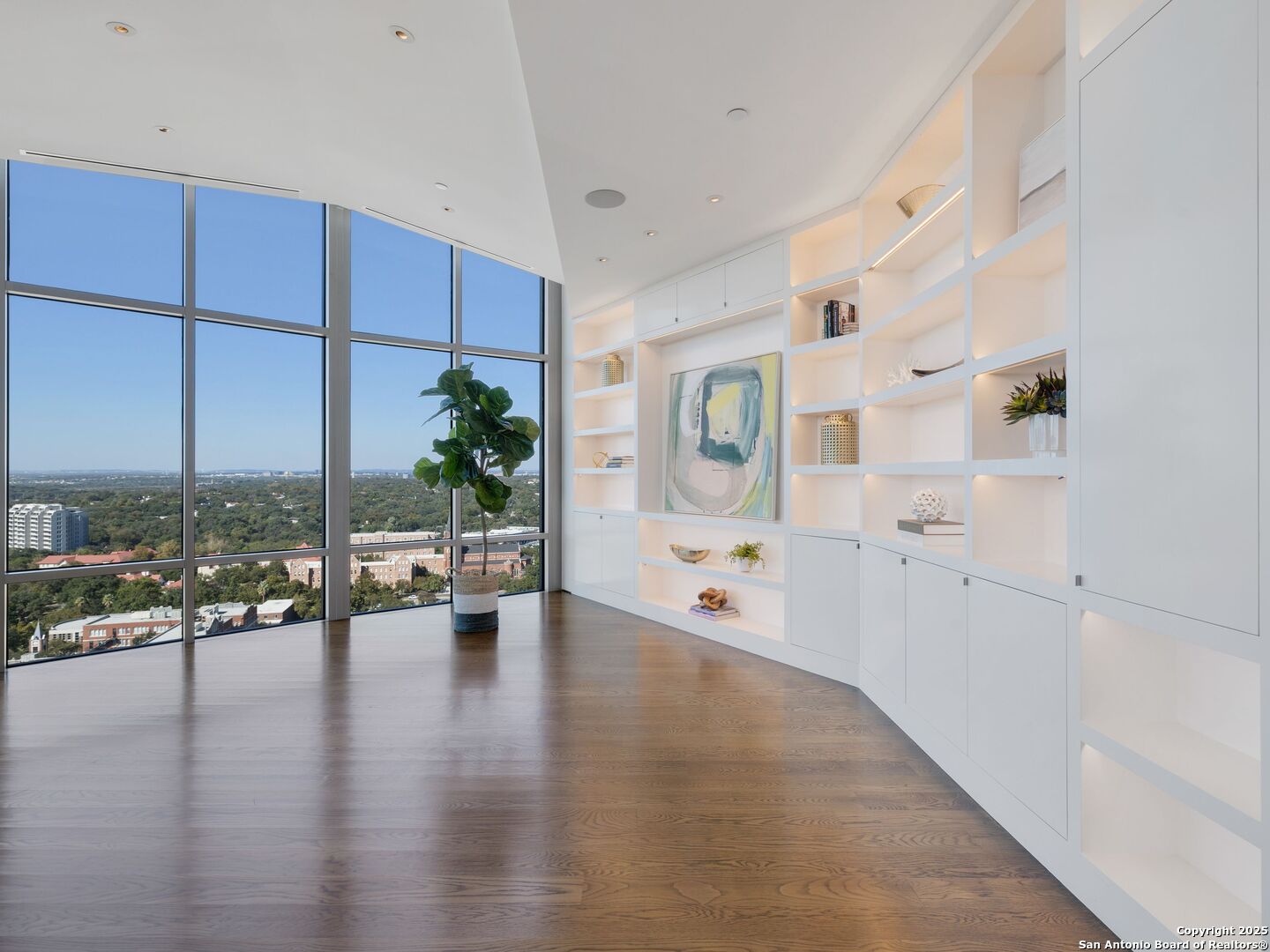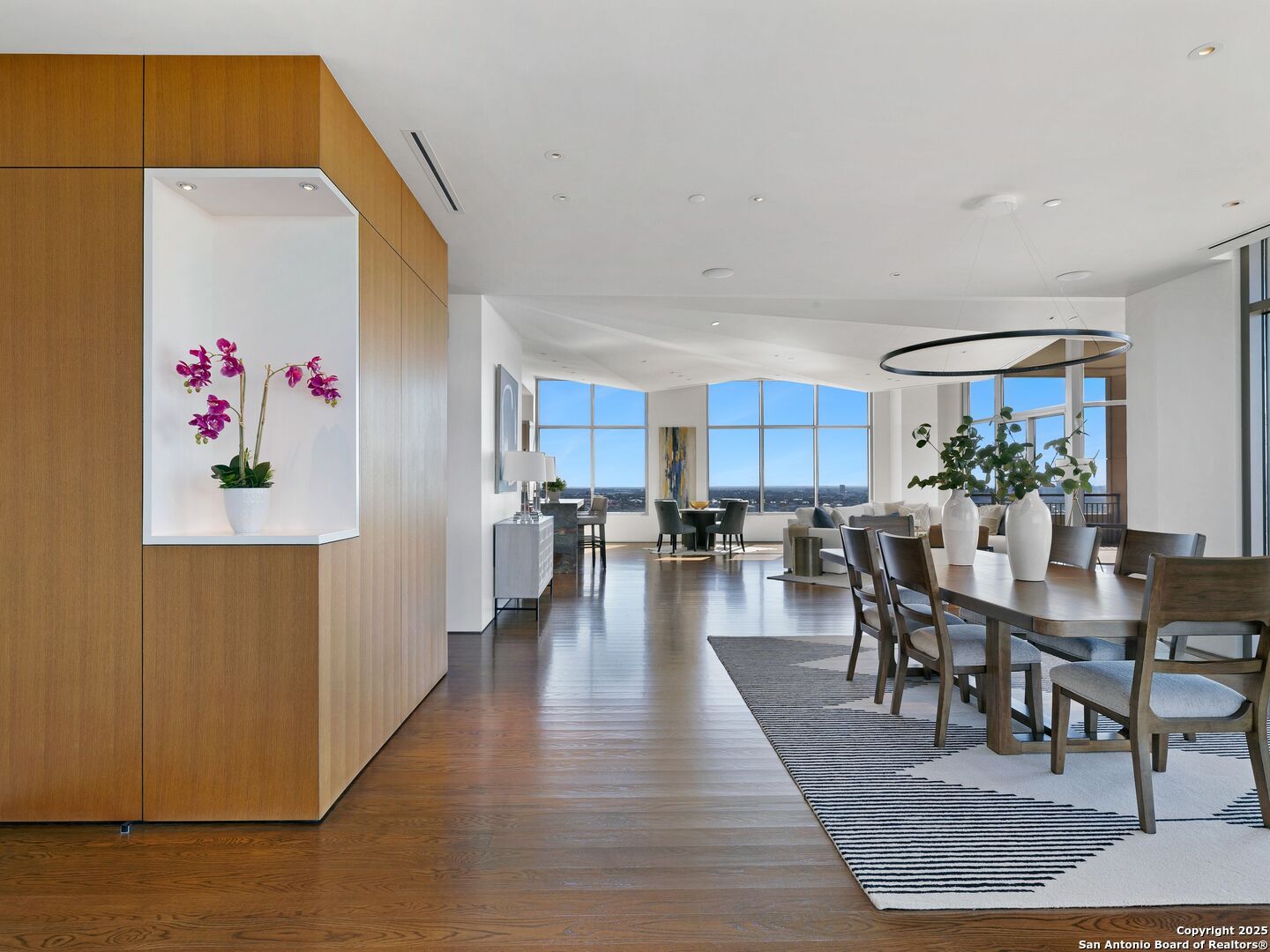 Exceptional high-rise living on one of the most desired floors at The Broadway. This refined residence captures sweeping skyline and Hill Country views through walls of floor-to-ceiling glass, creating a light-filled backdrop throughout the home. A private elevator vestibule leads into a generous open-concept layout designed for effortless daily living and sophisticated entertaining. The main living area offers multiple seating arrangements with seamless access to an outdoor terrace that frames the expansive vistas. The kitchen is finished with elevated custom cabinetry, premium stone surfaces, and a full Miele appliance suite including gas cooking. A large island anchors the space, offering both function and presence for culinary preparation or casual dining. The primary suite is positioned to maximize privacy and views, complete with its own terrace access, a spa-caliber bath with dual vanities, a walk-in shower, and a custom-fitted closet. Two additional guest suites each feature en-suite baths and generous storage, providing flexibility for visitors or extended-stay living. Additional highlights include a dedicated study/flex space, well-appointed utility room, and meticulously curated finishes throughout the home. Residents of The Broadway enjoy a premier lock-and-leave lifestyle with 24-hour valet and concierge services, state-of-the-art fitness center, resort-style pool, and unmatched security. All within minutes of the city's best dining, retail, cultural attractions, and outdoor amenities. A rare opportunity to live in one of San Antonio's most distinguished and sought-after luxury high-rise communities.