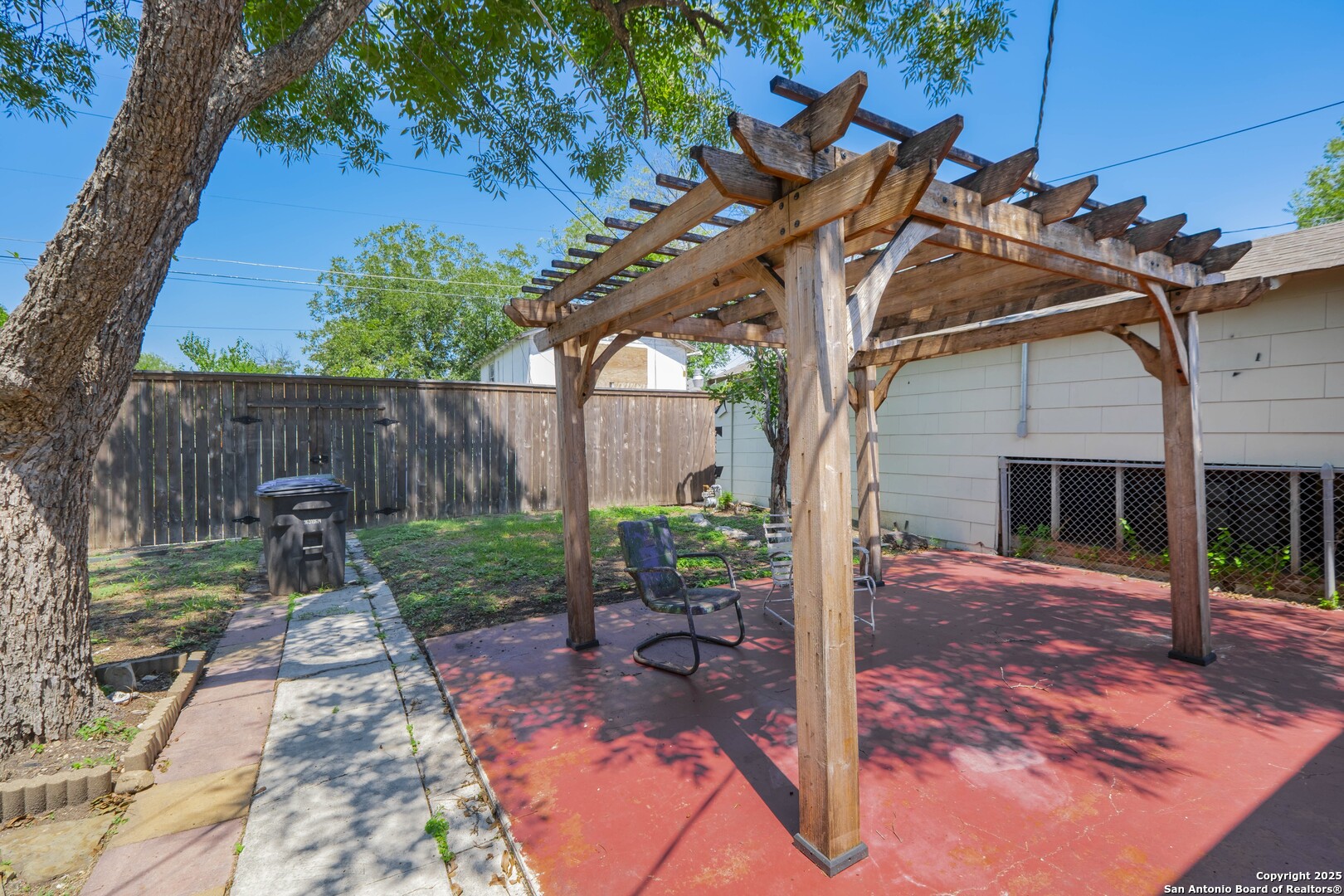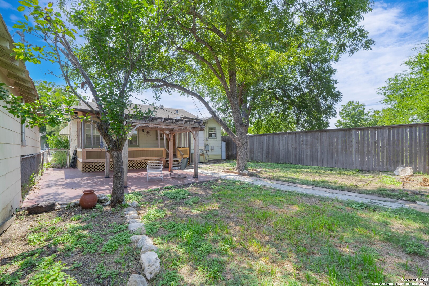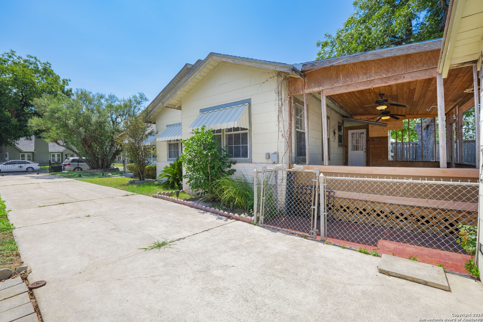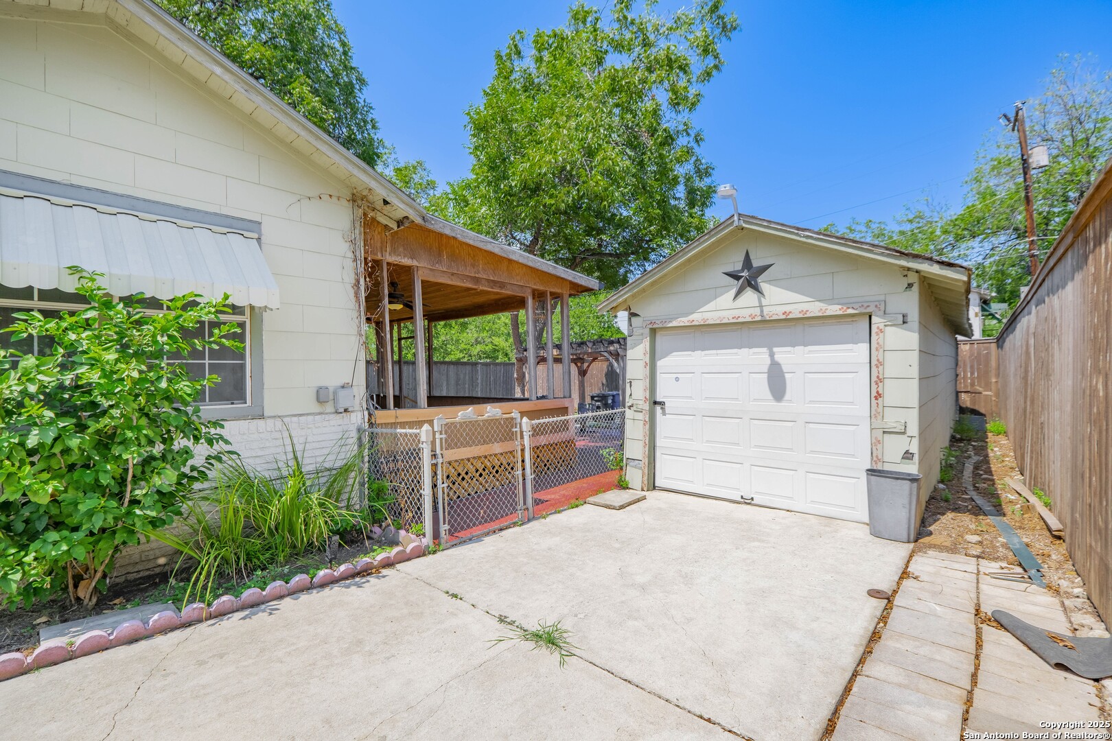This vacant 3-bedroom, 1-bath home offers 1,518 sq. ft. of living space on a 0.17-acre gated lot, combining character with thoughtful updates. The interior features beautifully refinished wood floors that add warmth throughout, complemented by a newly installed stove. A fireplace that is both wood-burning and gas serves as a cozy focal point in the living area. Built on a pier-and-beam foundation, the home is equipped with natural gas for the stove, hot water tank, and furnace, while everything else runs on electric. A covered front porch, covered patio, and pergola at the back extend the living space outdoors, providing multiple spots for relaxation and entertaining. A detached 1-car garage adds additional storage or parking flexibility. The lot is fully secured with a perimeter fence - wooden fencing at the side and back, paired with a wrought iron fence and gate at the front for both privacy and curb appeal. Located just a few minutes from Eloise Japhet Elementary School and H-E-B Plus, this property also offers excellent accessibility. Sitting only a few blocks east of I-37, you'll have direct access to downtown San Antonio within minutes, making this home a convenient and desirable option.