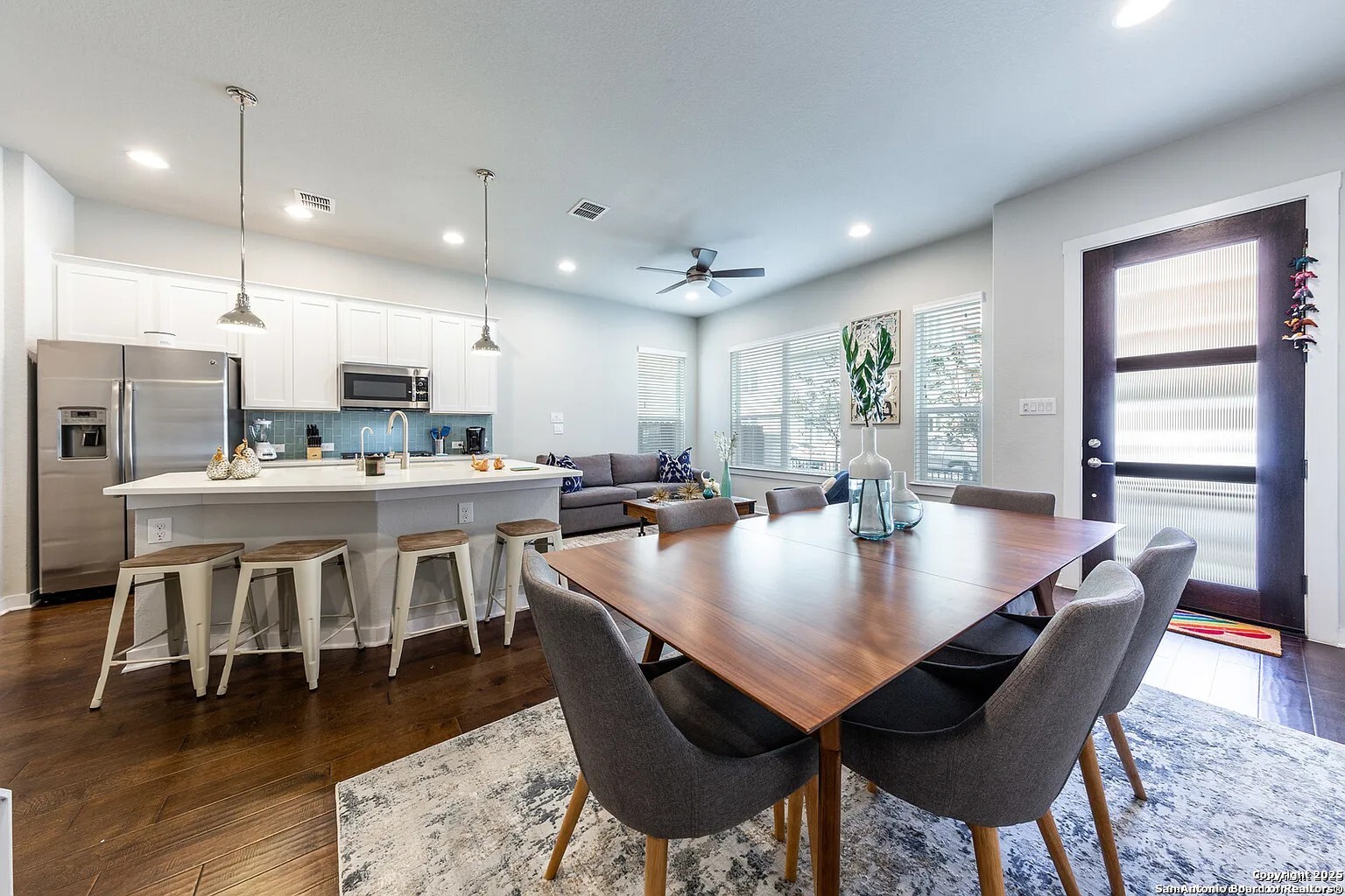Discover the pulse of Southtown, where vibrant urban energy meets the serenity of home. This hassle-free, lock-and-leave 3 bedroom, 2.5 bath freestanding condo offers a rare combination of privacy, style, and an enclosed front and side yard along with a two car garage. The open floor plan is designed for modern living. The kitchen features ample cabinetry, quartz countertops, gas cooking, stainless steel appliances, and a layout that works beautifully for both everyday use and entertaining. A brand-new refrigerator, washer, and dryer are included. The breakfast bar and dining area flow into the great room, where nine foot ceilings and large windows bring in generous natural light and create a warm, inviting space. A half bath on the main level adds convenience for guests. Upstairs, a flexible loft space and laundry closet separate the two secondary bedrooms. Both rooms offer soaring cathedral ceilings and plenty of windows, creating an airy and bright atmosphere throughout the upper level. The primary suite includes a large walk-in closet and a well-appointed bathroom with quartz counters, a separate soaking tub, and a walk-in shower. The second full bath also features quartz countertops and a tub and shower combination. This home places you just steps from Blue Star, the San Antonio River, the Mission Trail, top restaurants, museums, and downtown attractions. Enjoy the best of Southtown living with comfort, style, and an unbeatable location.