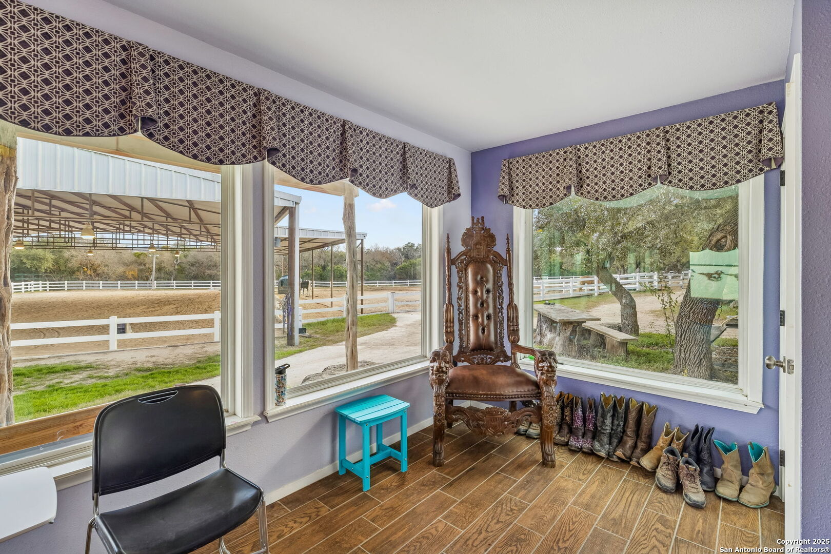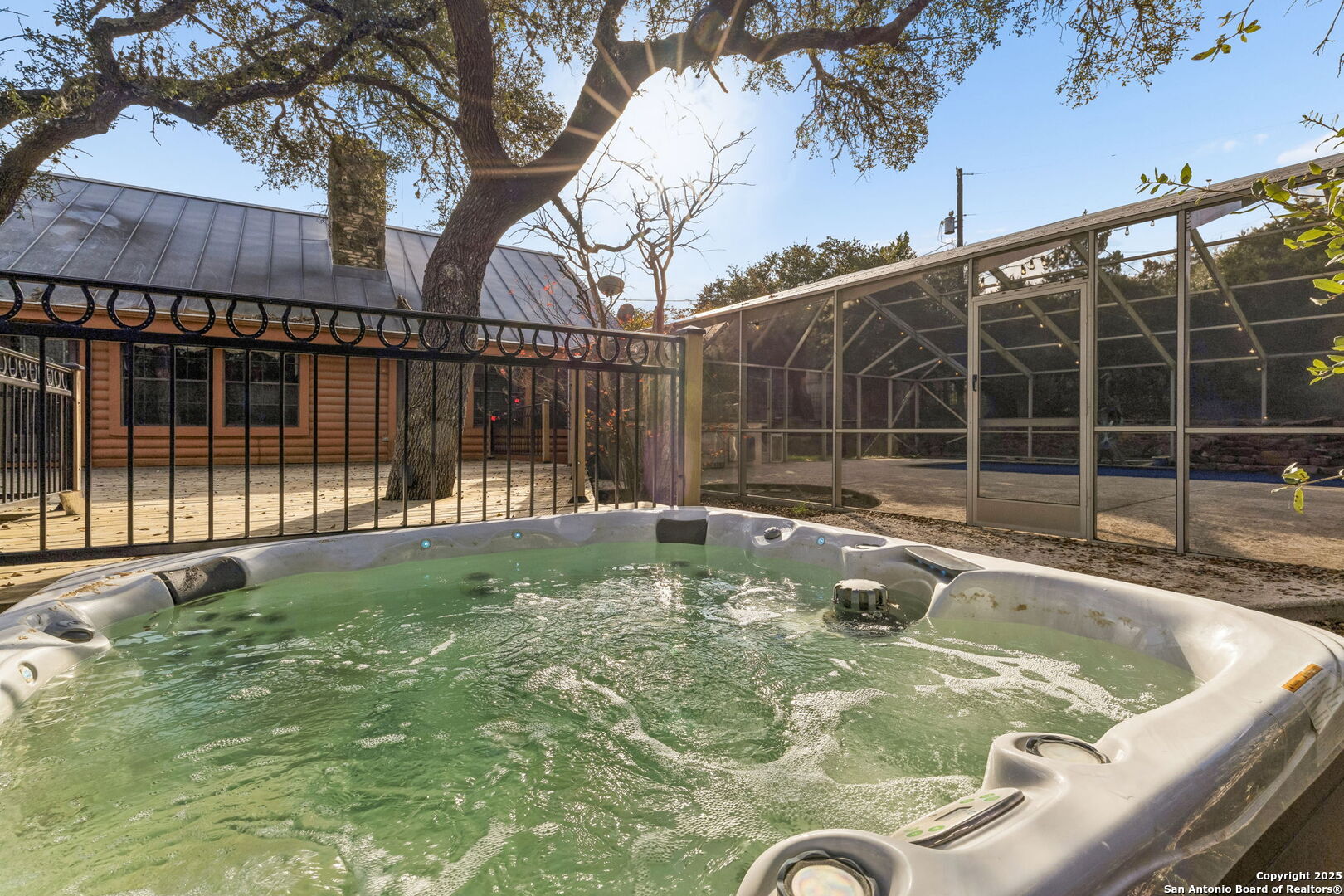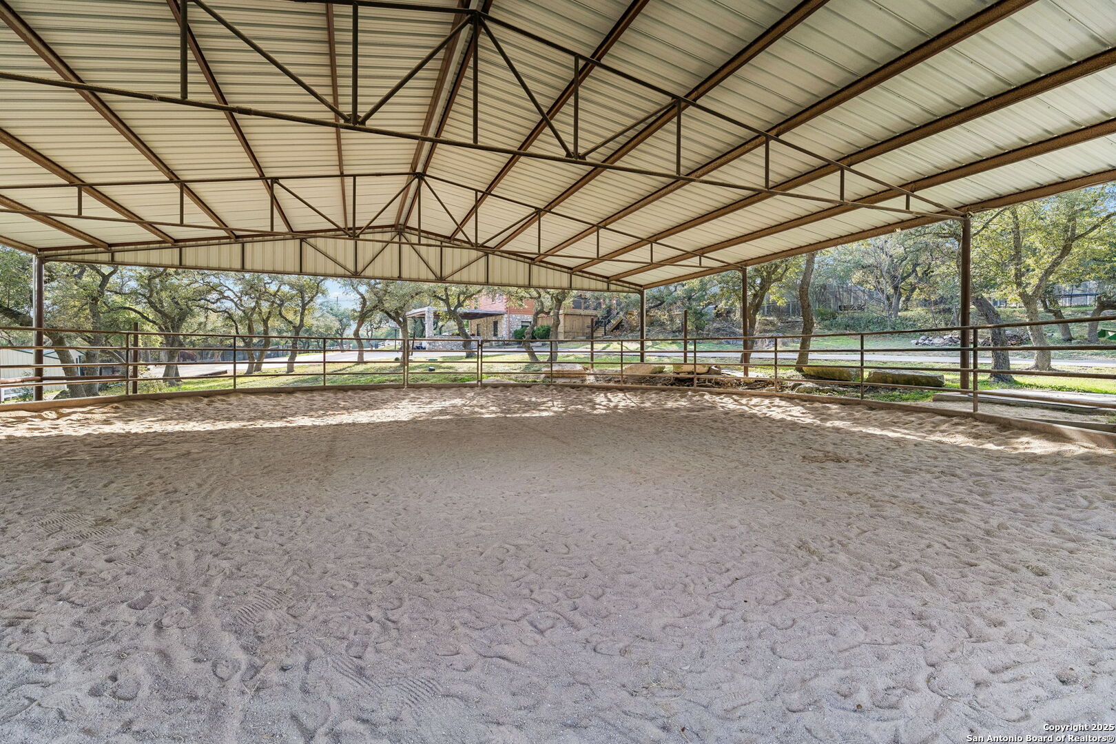 Turn-key equestrian facility in Bulverde, TX, offering an exceptional combination of professional horse amenities and resort-style living. The property features a main barn with 11 stalls (concrete aisle, office, tack room, 3/4 bath), a separate barn wing with 7 stalls, large tack room and foaling stall, plus additional stalls with permanent runs. Equestrian improvements include a covered arena (88' x 120') with sprinkler system and excellent footing, an uncovered arena (88' x 50'), large covered round pen, extended covered paddock area, multiple turnouts, fencing, gates, and waterers. A two-story, climate-controlled viewing lounge offers approx. 1,800 sq ft. Additional improvements include a 1,100 sq ft 2-bedroom apartment, hay barn, shavings building, trailer building, tool shed, multiple portable shelters, dog runs, RV/septic infrastructure, and paved driveway. Main log cabin-style residence featuring an open floor plan with three bedrooms, two and a half bathrooms, a large converted garage, and a loft. Enjoy outdoor living with a screened-in room over the pool, outdoor kitchen, Spa, water feature, custom deck and railings. Rare opportunity to own a fully developed, income-ready horse property with extensive infrastructure.