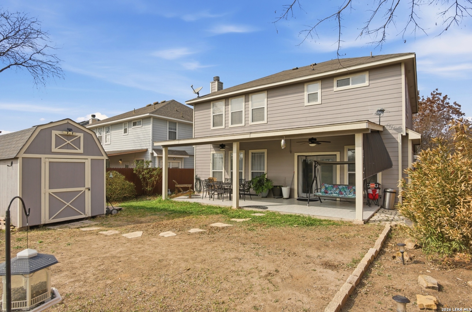 Located in the highly desirable gated and established community of Pecan Valley Heights, this beautifully maintained two-story home offers space, style, and convenience. Surrounded by mature trees, the home provides a peaceful neighborhood setting while remaining close to city amenities. The interior features a functional and inviting floor plan with a separate dining room, breakfast area, and a spacious living area that flows seamlessly into the kitchen. The kitchen is well-appointed with stone countertops, a stylish backsplash, and ample workspace for everyday living and entertaining. Step outside to enjoy the large covered patio addition, perfect for relaxing or hosting gatherings year-round. The generously sized backyard also includes a storage shed for added convenience. Upstairs, the primary suite offers a spacious bedroom with a private en-suite bathroom featuring a walk-in shower and walk-in closet. Two additional bedrooms complete the second level, with both full bathrooms thoughtfully updated with modern finishes. Proudly owned by a single homeowner, this home has been exceptionally maintained and is move-in ready. Conveniently located approximately 10 minutes from shopping, dining, and entertainment at Brooks City Base, and about 20 minutes from San Antonio International Airport, providing easy access to major city destinations.
