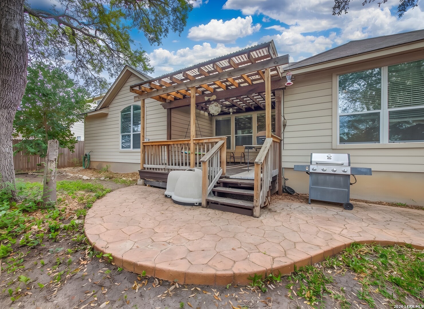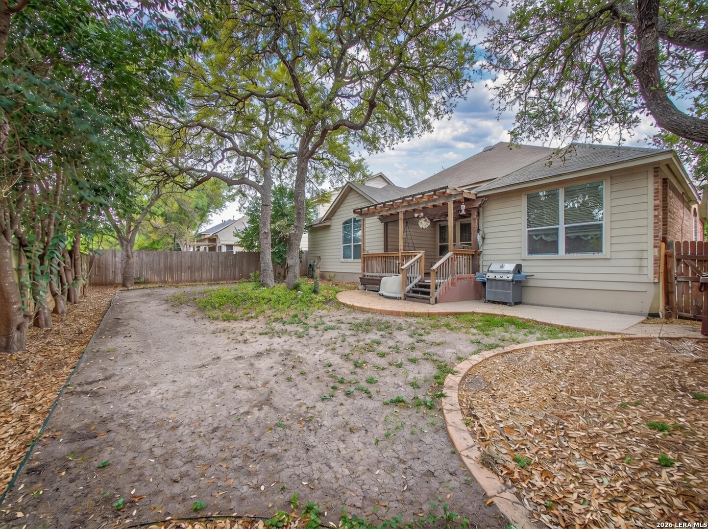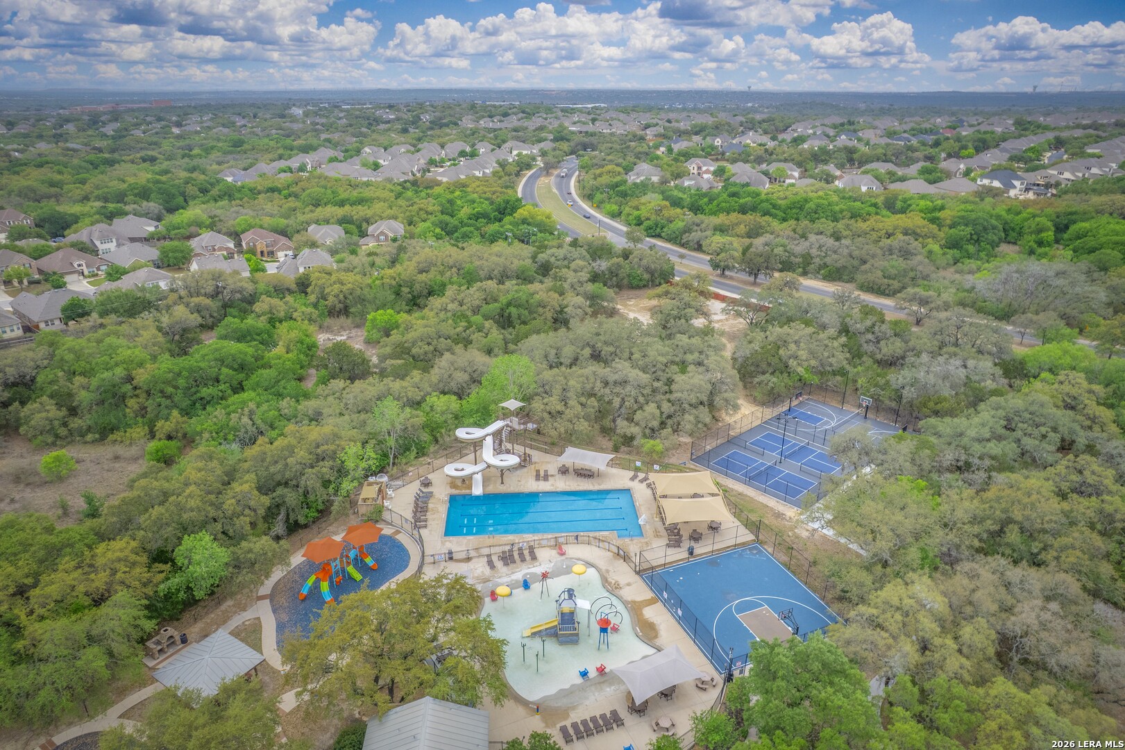 Welcome to this spacious 4-bedroom, 2.5-bathroom home with a dedicated office, situated on a cul-de-sac in the desirable Alamo Ranch subdivision. Offering 2,521 square feet of single-story living space, this home features a welcoming front porch, high ceilings throughout, and a thoughtfully designed layout for comfortable living and easy entertaining. The exterior showcases a combination of brick, siding, and stone for added curb appeal, and a 2-car attached garage adds convenience. Just off the foyer, the private office provides a quiet workspace. The main living area is bright and open, highlighted by an interior archway and a floor-to-ceiling fireplace that creates a striking focal point. The living and dining areas flow together seamlessly, complemented by dining spaces, including a separate dining room, breakfast nook, and breakfast bar. The kitchen boasts granite countertops, ample counter space, a pantry, and a dedicated coffee bar, combining function with style. The primary suite is privately located at the rear of the home and features high ceilings, a walk-in closet, and an ensuite bath with dual vanities, a garden tub, and a walk-in shower. Secondary bedrooms include carpet for comfort. Enjoy outdoor living with a covered deck patio accessible from the breakfast nook, along with a spacious backyard featuring a privacy fence. A new AC system was installed in 2023. Residents enjoy access to community amenities, including a pool, clubhouse, splash pad, playground, park, and jogging trails. Conveniently located just minutes from local schools, shopping, dining, and everyday essentials, this home offers comfort, functionality, and versatility in one complete package.
