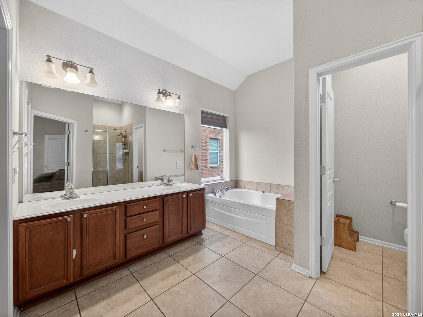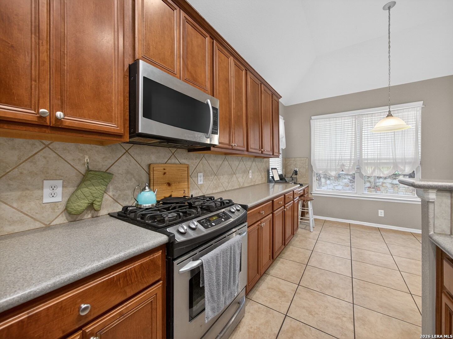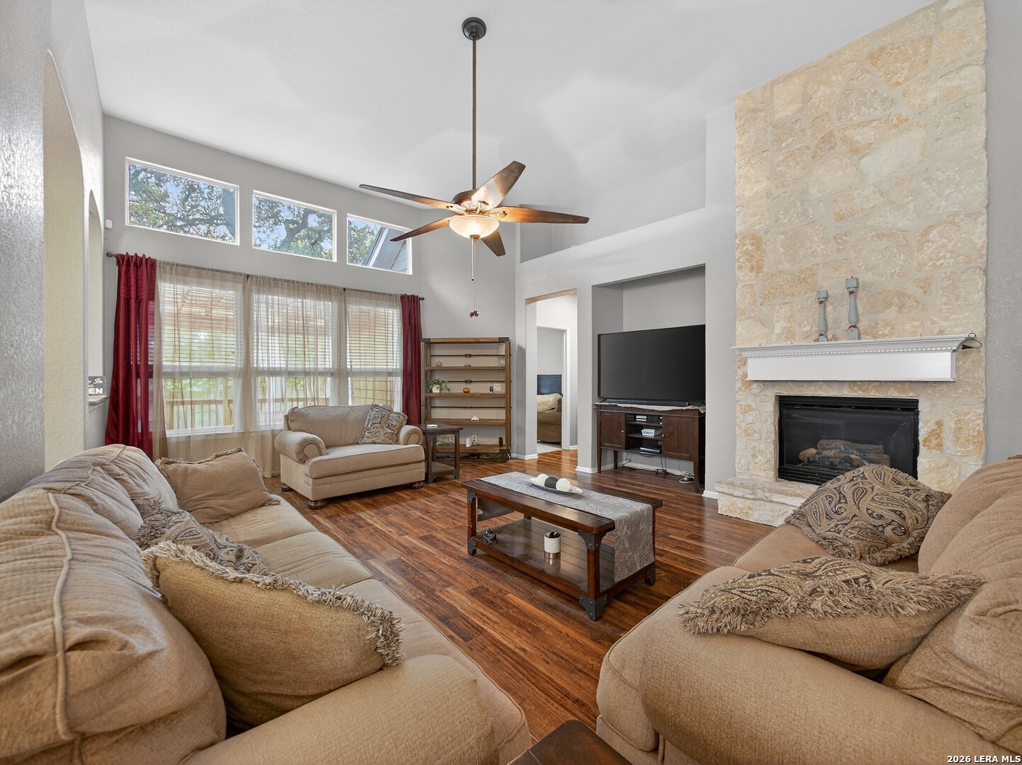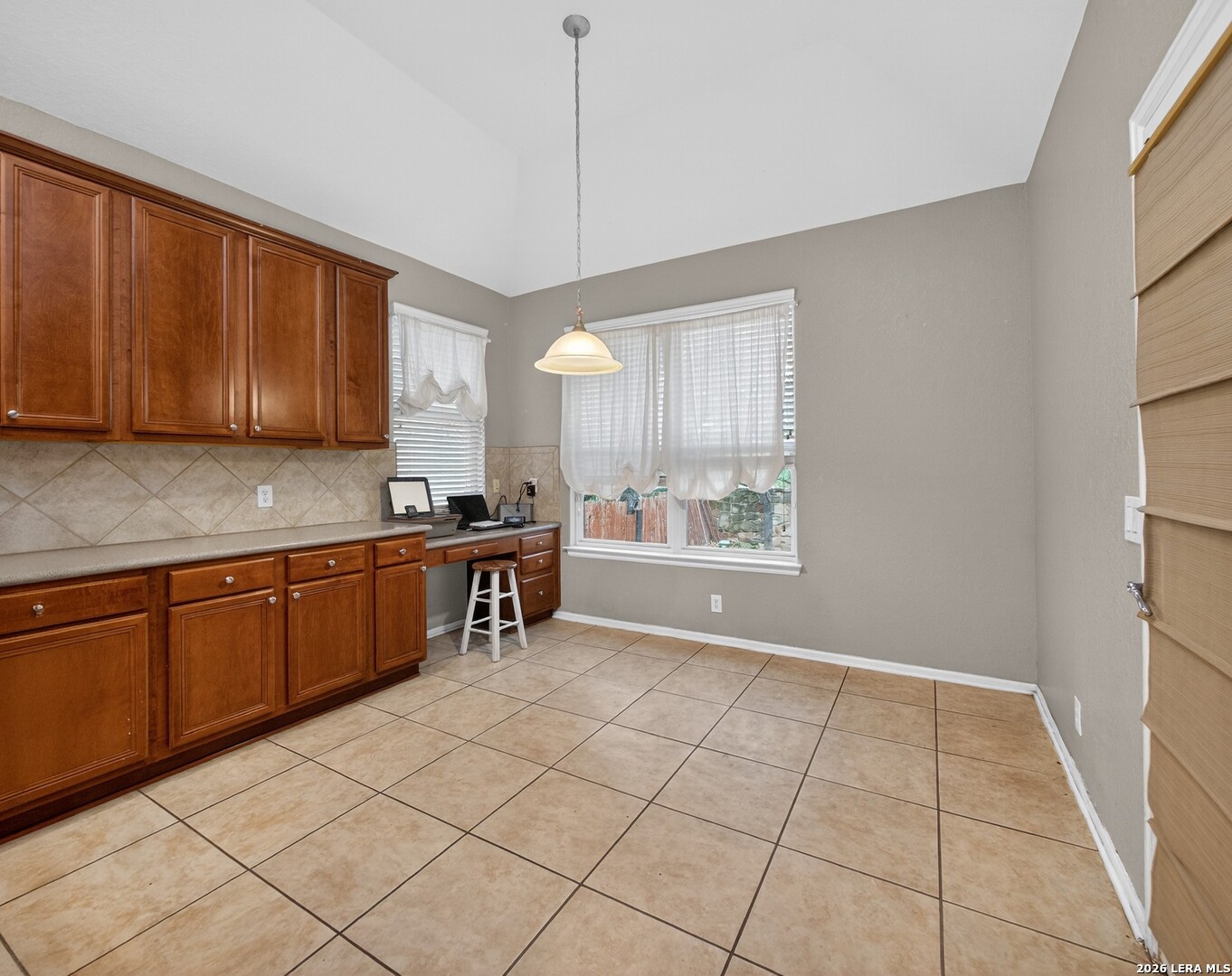 Welcome to this spacious 4-bedroom, 2.5-bathroom home with a dedicated office, situated on a cul-de-sac in the desirable Alamo Ranch subdivision. Offering 2,521 square feet of single-story living space, this home features a welcoming front porch, high ceilings throughout, and a thoughtfully designed layout for comfortable living and easy entertaining. The exterior showcases a combination of brick, siding, and stone for added curb appeal, and a 2-car attached garage adds convenience. Just off the foyer, the private office provides a quiet workspace. The main living area is bright and open, highlighted by an interior archway and a floor-to-ceiling fireplace that creates a striking focal point. The living and dining areas flow together seamlessly, complemented by dining spaces, including a separate dining room, breakfast nook, and breakfast bar. The kitchen boasts granite countertops, ample counter space, a pantry, and a dedicated coffee bar, combining function with style. The primary suite is privately located at the rear of the home and features high ceilings, a walk-in closet, and an ensuite bath with dual vanities, a garden tub, and a walk-in shower. Secondary bedrooms include carpet for comfort. Enjoy outdoor living with a covered deck patio accessible from the breakfast nook, along with a spacious backyard featuring a privacy fence. A new AC system was installed in 2023. Residents enjoy access to community amenities, including a pool, clubhouse, splash pad, playground, park, and jogging trails. Conveniently located just minutes from local schools, shopping, dining, and everyday essentials, this home offers comfort, functionality, and versatility in one complete package.