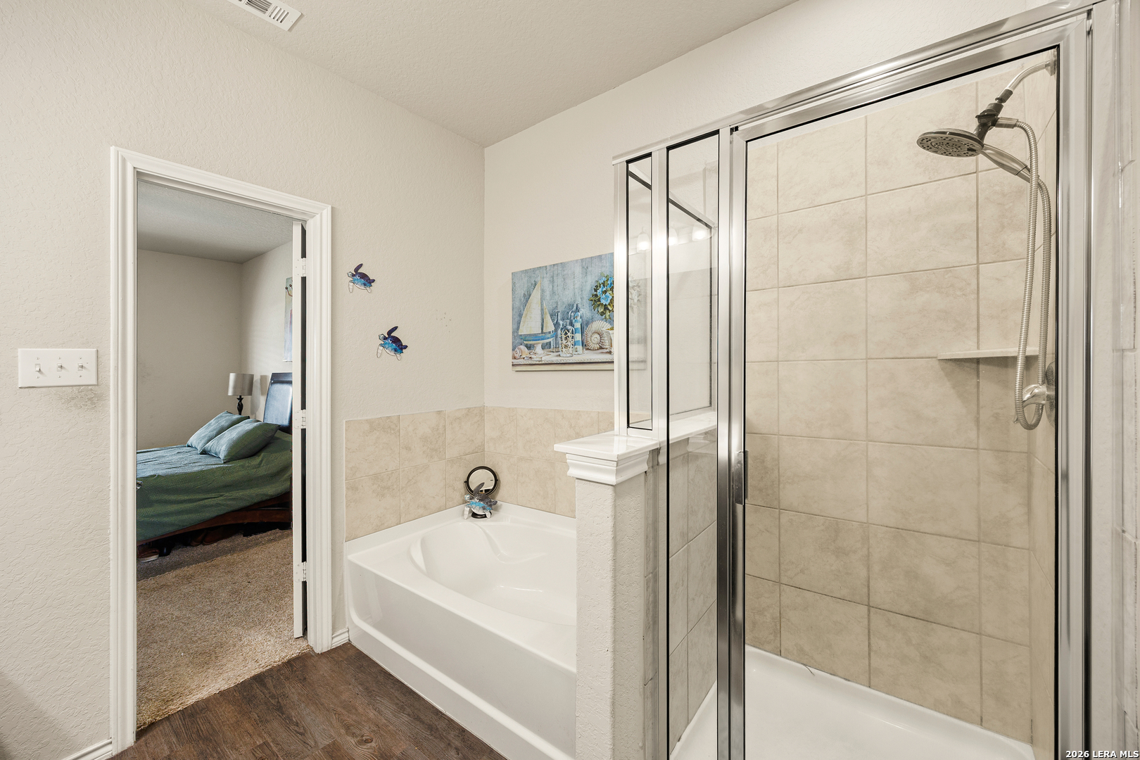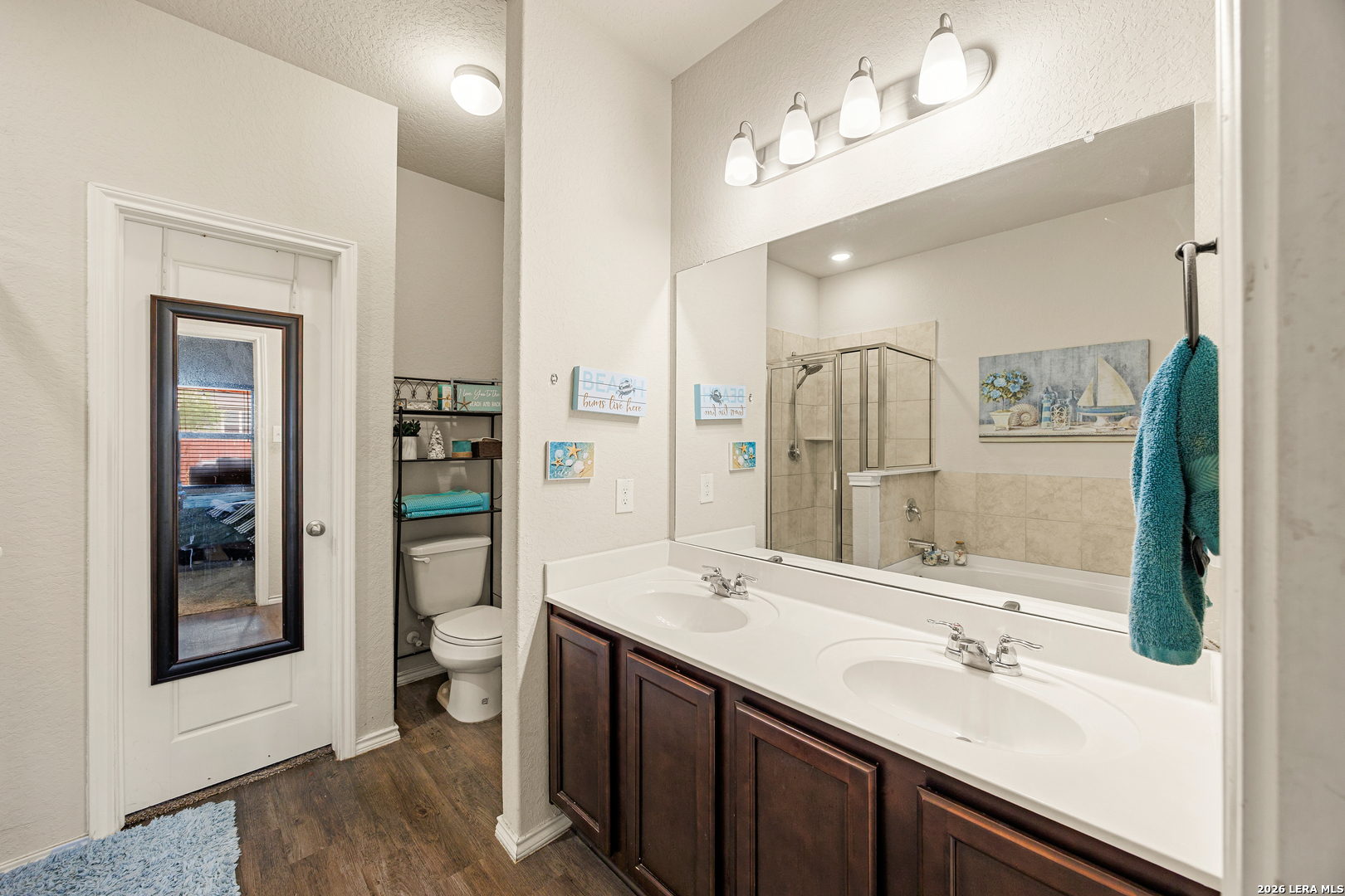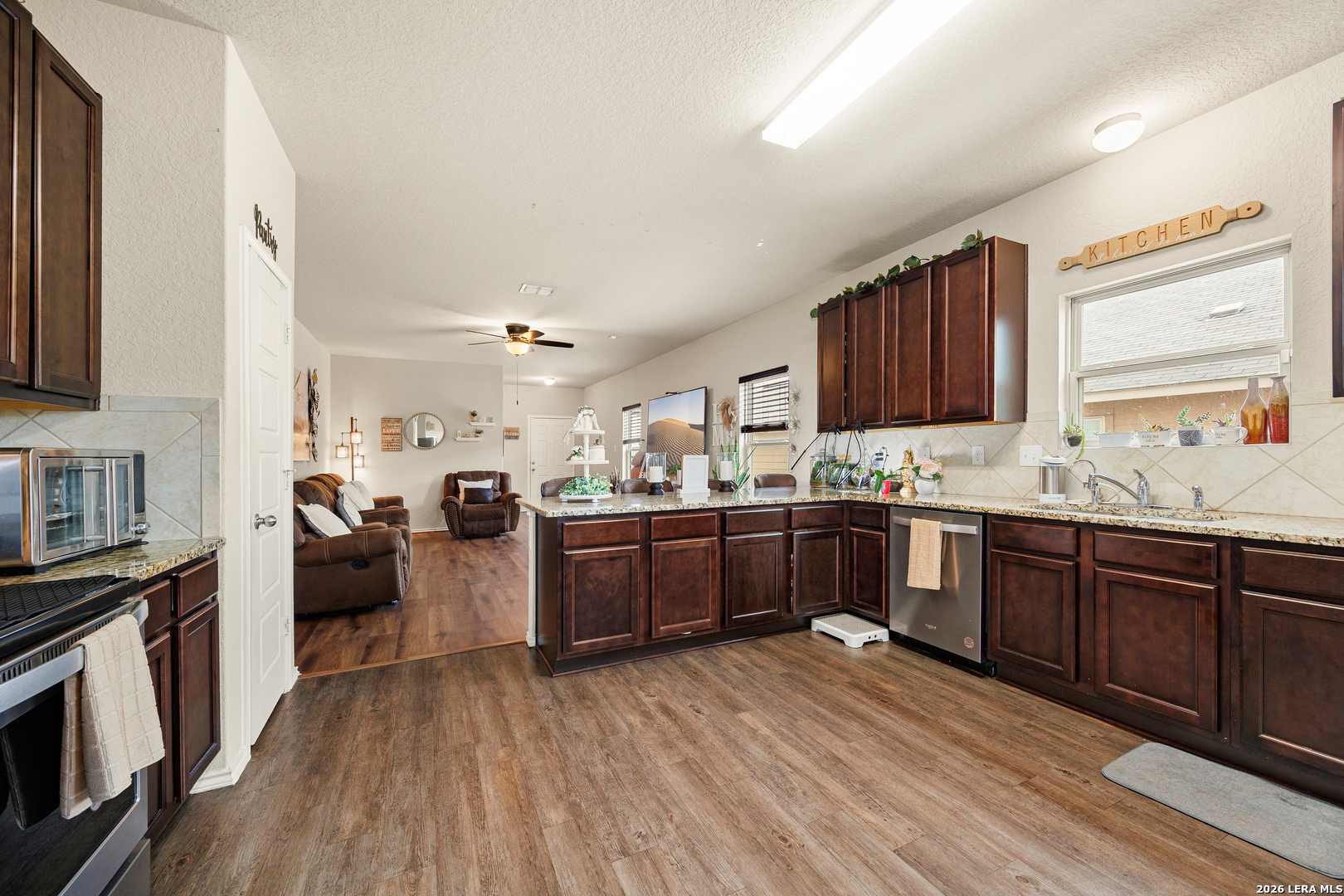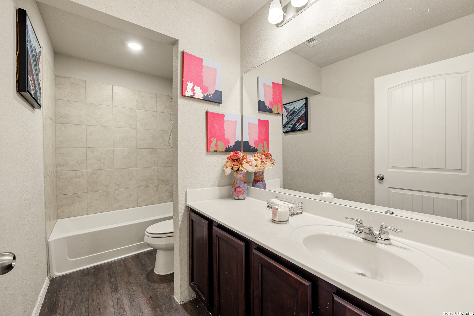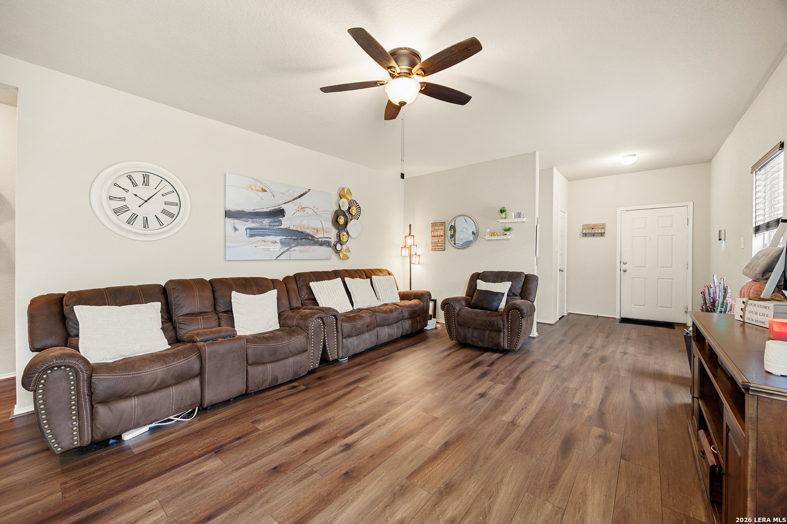 This 5-bedroom, 3.5-bath home in the desirable Millican Grove subdivision offers practical, modern living and strong value. The open floor plan creates a bright, welcoming living area that flows into a large dining space-ideal for everyday living and casual entertaining. The kitchen is generous in size, with a breakfast bar, stainless steel appliances, and plenty of cabinetry and counter space to handle meal prep and storage. The first-floor primary suite provides privacy and convenience, with ample room for a king bed and comfortable furnishings. Upstairs you'll find four well-sized secondary bedrooms and a flexible loft area that works well as a game room, home office, or media space. The backyard includes a covered patio, lawn, and privacy fence-an easy outdoor space for relaxing or play. The garage includes a mini-split unit for keeping the heat down, and the solar panel system helps reduce energy costs and supports long-term sustainability. Convenient to I-10 and Loop 1604, the home offers quick access to amenities shopping, dining, and everyday necessities. Book your tour today!