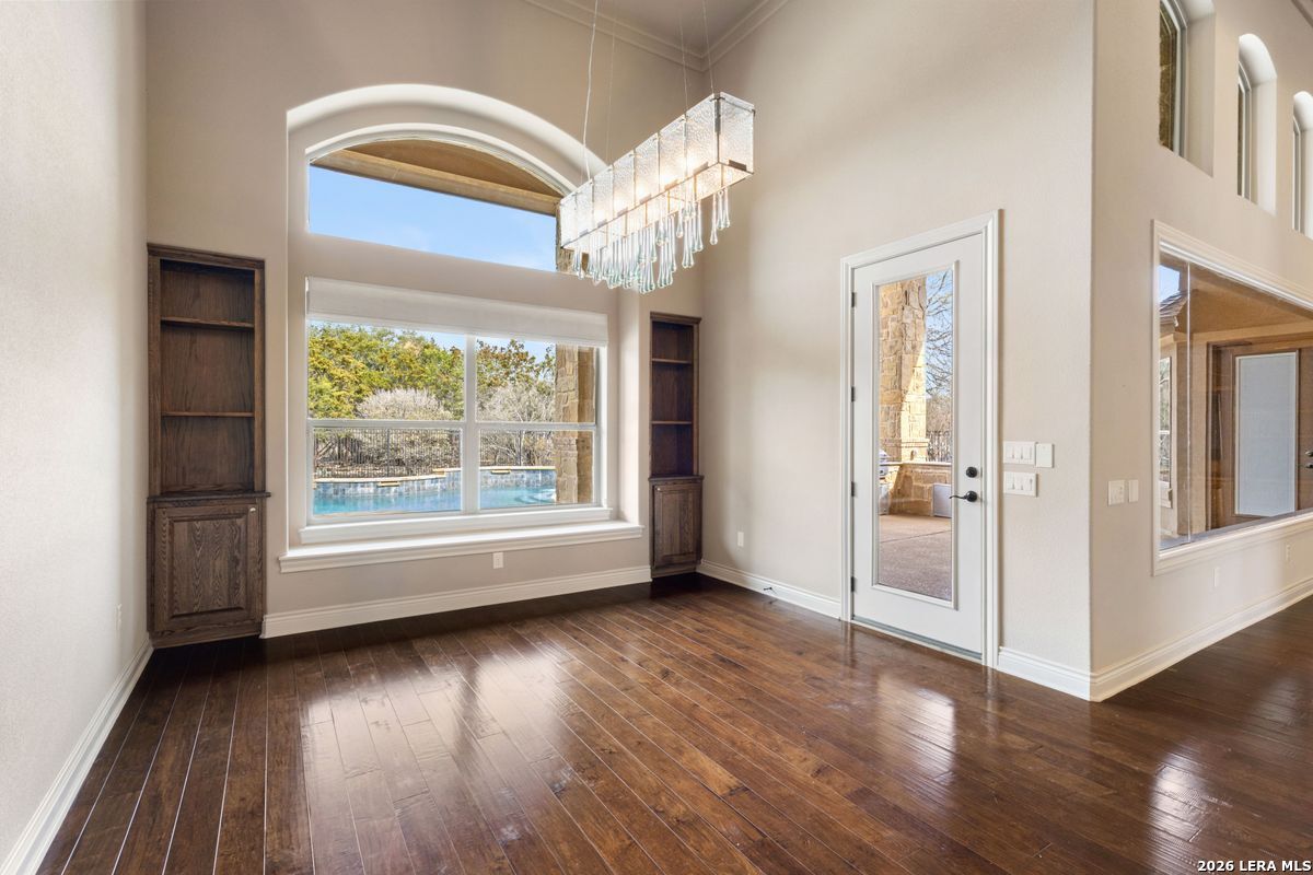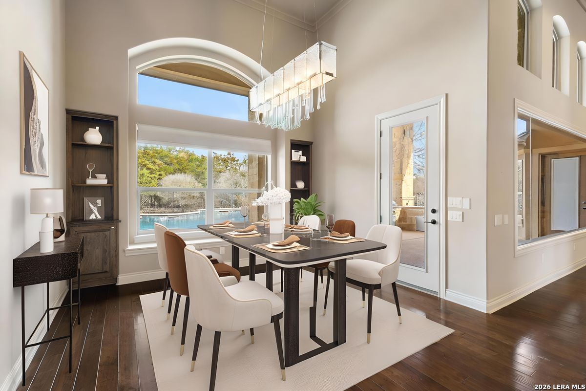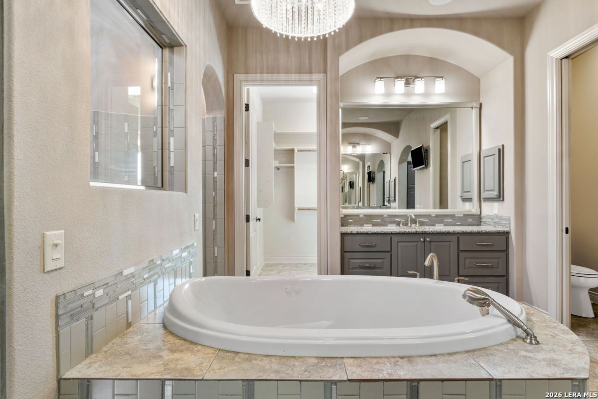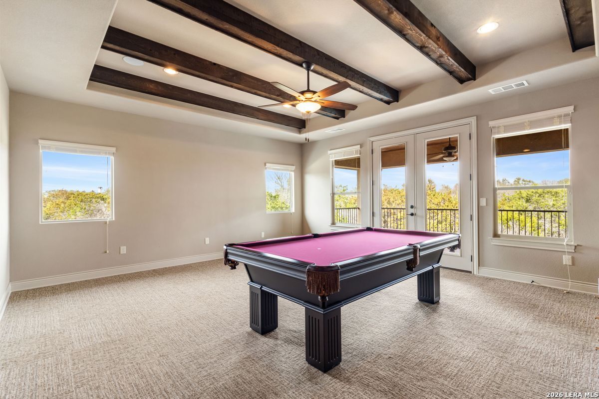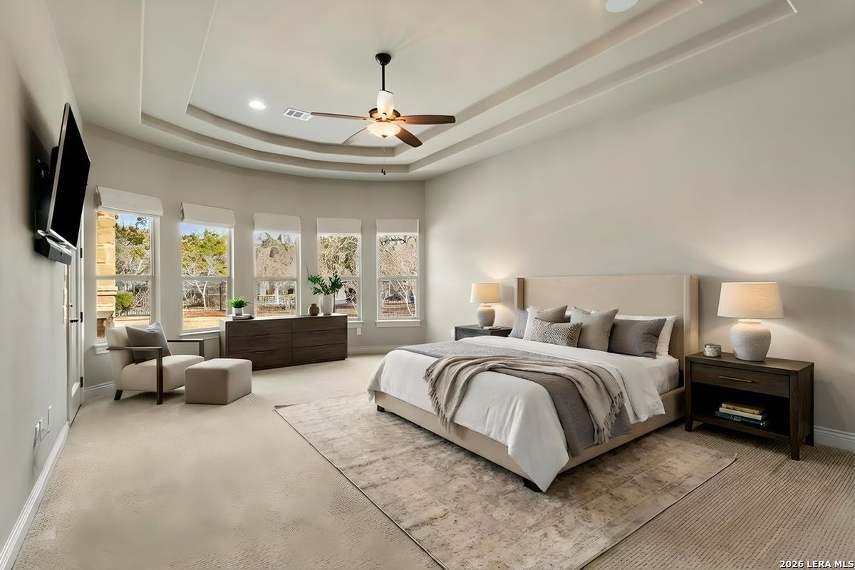 Welcome to an exceptional two-story luxury estate located in The Waters at River Cross community in Spring Branch, Texas. This stunning Hill Country style home showcases timeless stone architecture, a grand arched entry, and refined craftsmanship throughout. Inside, soaring ceilings and expansive living spaces create a light-filled, open atmosphere ideal for both entertaining and everyday living. The chef's kitchen serves as a true centerpiece, featuring custom wood cabinetry, premium appliances, an oversized curved island, and designer lighting that flows seamlessly into the main living areas. The home is thoughtfully designed with a fire place, dedicated office, game room, and private theater room, offering flexibility for work, recreation, and hosting guests. The primary suite provides an expansive tranquil retreat with a spa-inspired bathroom complete with a soaking tub, his/hers walk-in shower, dual vanities, and upscale finishes. Step outside to a resort-style backyard oasis featuring a pool, Jacuzzi, and outdoor kitchen. It's perfect for entertaining or unwinding in complete privacy. Situated on a generous lot in a quiet, upscale neighborhood, this residence offers the perfect balance of luxury, comfort, and tranquility, just minutes from Shopping, entertainment, top-rated schools, and convenient access to all major surrounding cities. This is Hill Country living at its finest.