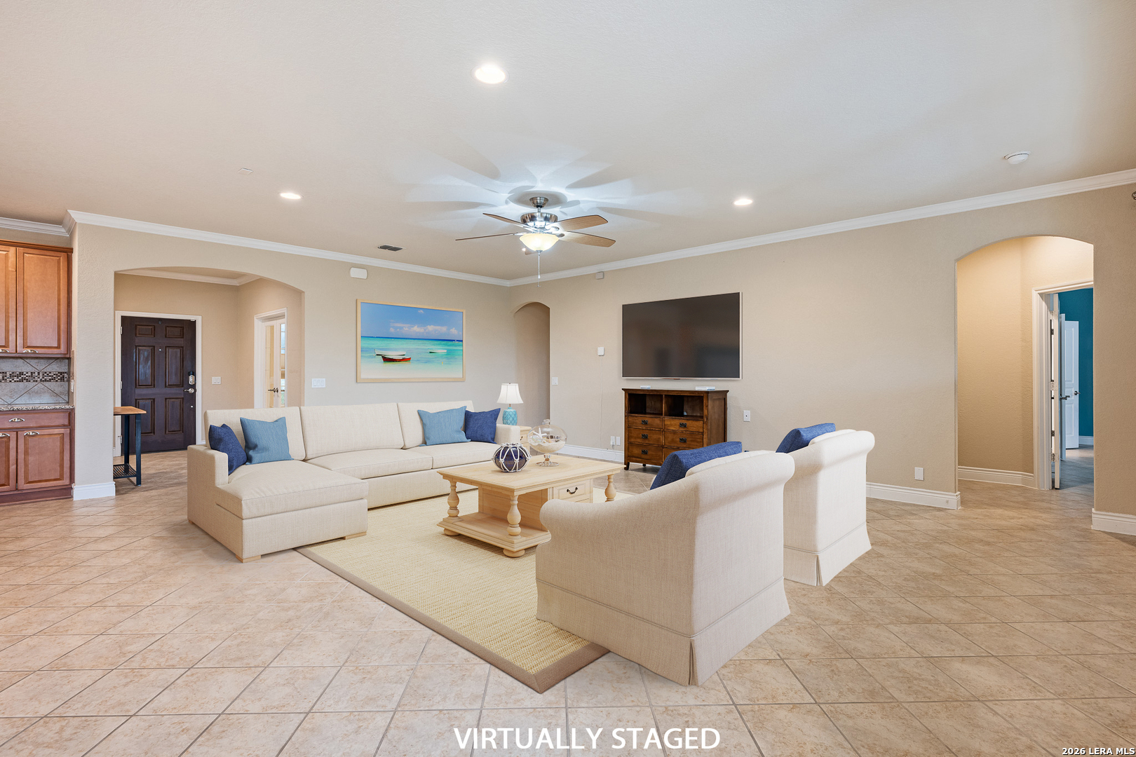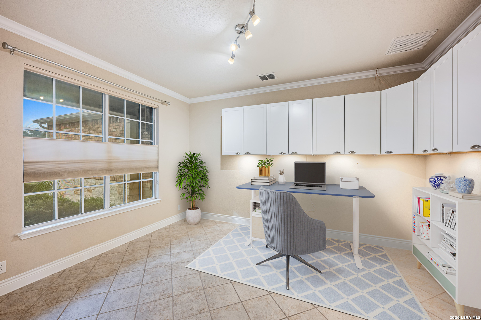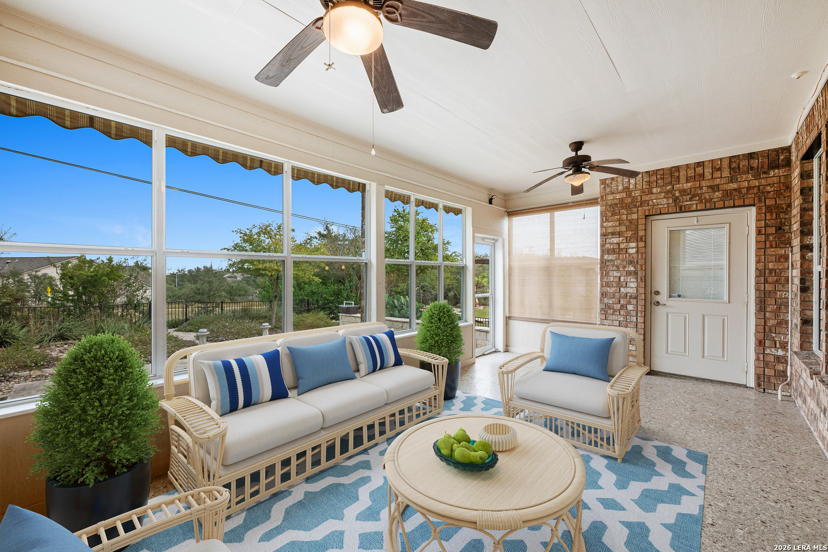 Nestled on beautiful greenbelt lot that is totally landscaped with low maintenance plants, flagstone patio areas, and backs to nature walking trail. This beautiful home has French doors leading to study/office complete with all custom upper cabinets. Large Sunroom in the back and recent HVAC large enough to accommodate. The tandum 3rd car area of garage has been enclosed for a workshop or hobby roon. **SOLAR PANELS** for low electric bills. **RECENT HEAVY TAB ROOF** Open floorplan with huge island separating kitchen from living area. En'suite has built-in Murphy bed with "sleep number" mattress, has an adjoining full bath. Tons of closet and storage space. Community resort with multiple pools (indoor and outdoor), clubs, activities, and miles of nature trails make this community a must see for those 55+ looking for resort style living.*A FULL LIST OF FEATURES ATTACHED*