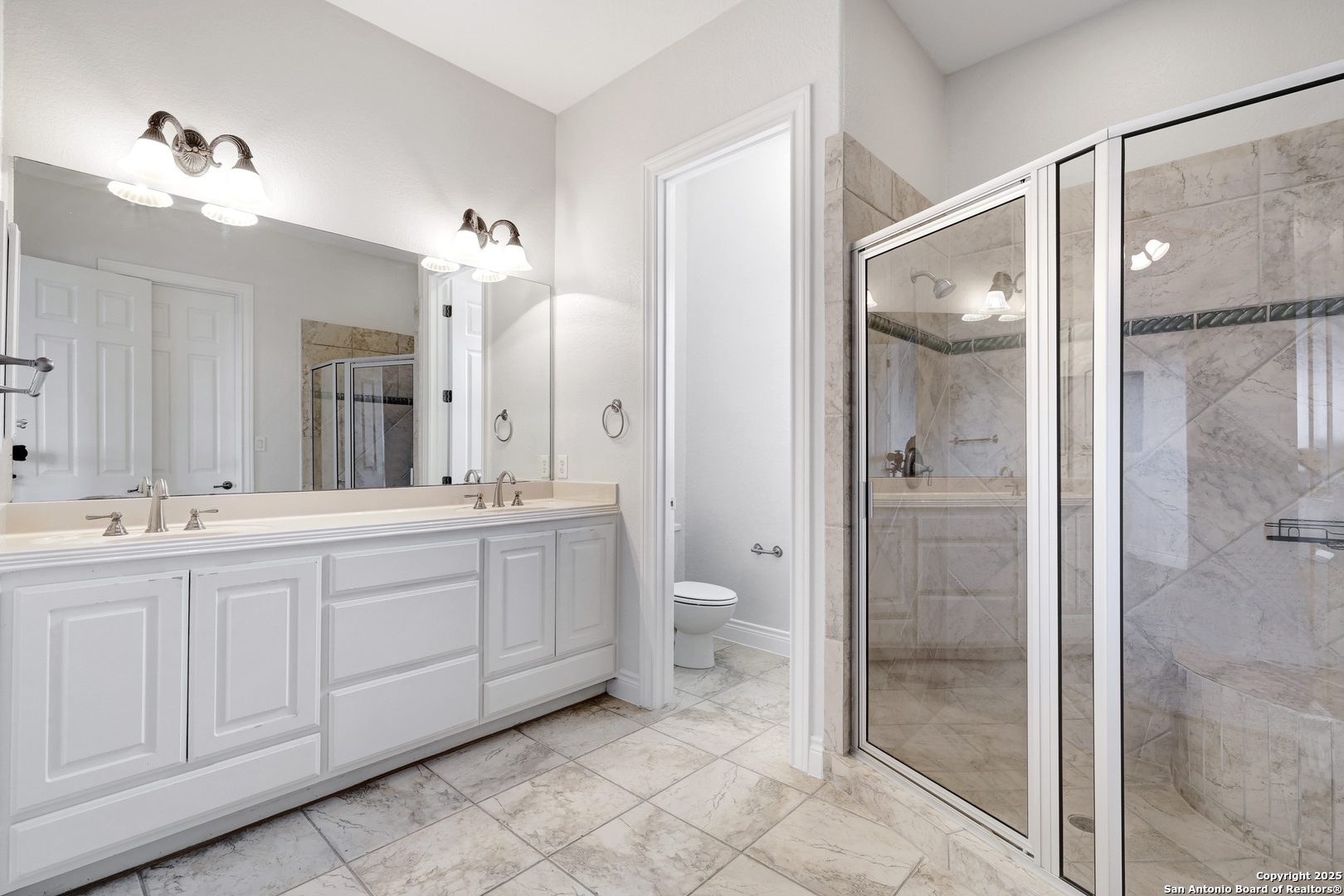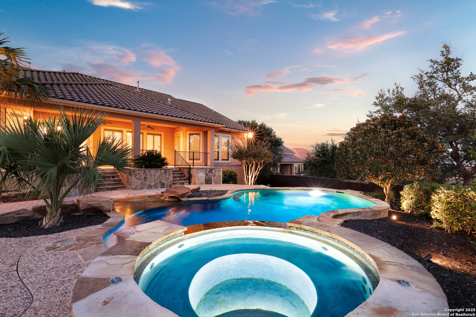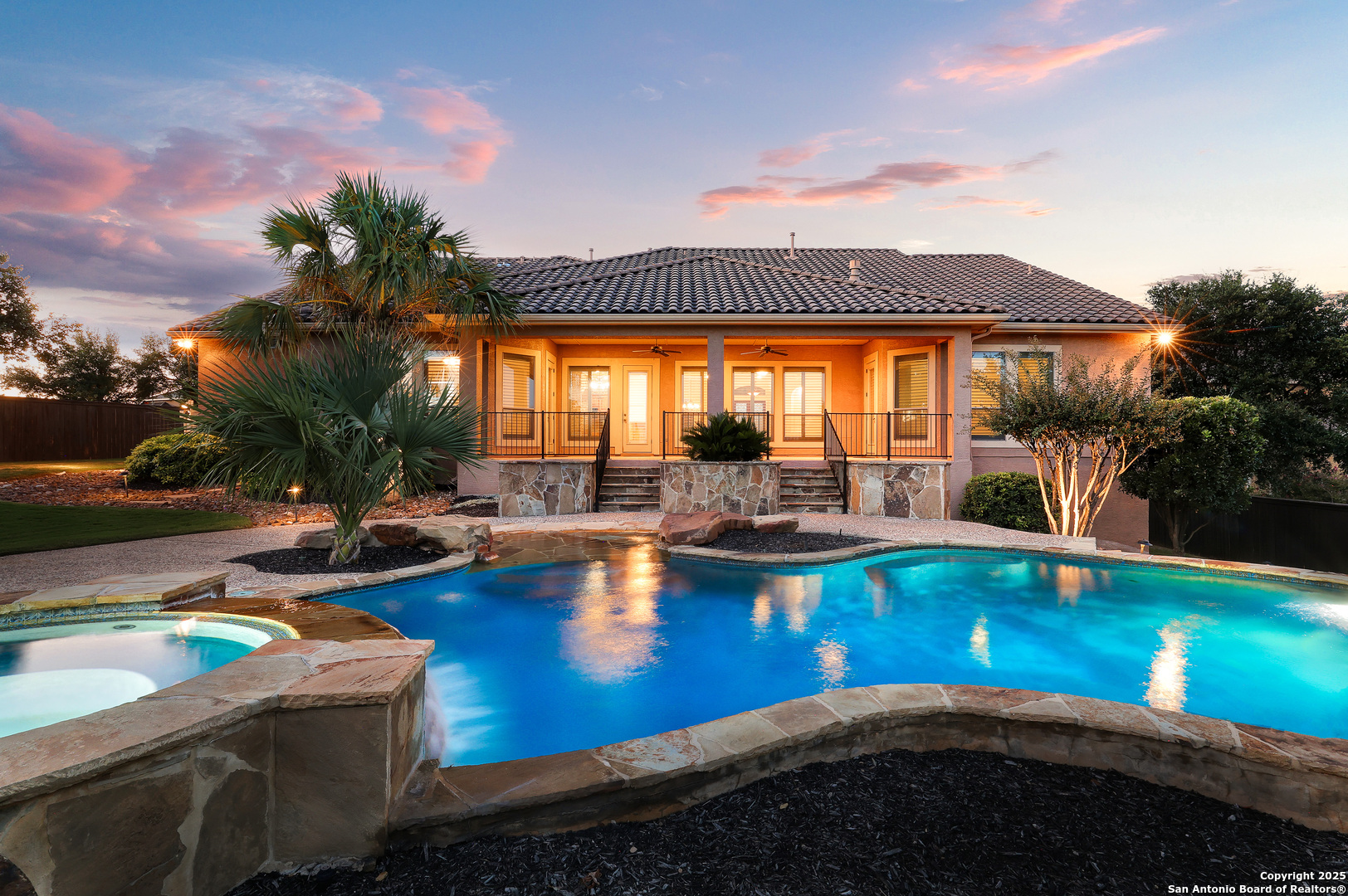OPEN HOUSE this Sunday 8/31 (2:00-4:00) Live in your dream home with a "MILLION DOLLAR VIEW" and the most "STUNNING" back yard oasis in all of Sonoma Ranch! This luxurious 4 bedroom, 4 bath retreat on nearly an acre is also nestled on a private cul-de-sac. Experience pure elegance with an open floor plan, soaring high ceilings, timeless tile flooring, and a stunning gourmet kitchen designed for both style and functionality. This beautifully updated home has fresh paint and new carpeting throughout. A rare gem that has 3 bedrooms downstairs including 2 master suites. The main master suite is large enough to add a lounging or reading area. It has a spa like bathroom with the walk-in closet of your dreams. Upstairs, discover a mother in law suite with its own bathroom and walk in closet, along with a spacious media/game room ideal for entertaining or relaxing. This home has an abundance of storage space including a walk in attic ...several linen closets and built in cabinets in a 3 car garage. Step outside to an incredible covered patio showcasing breathtaking city views, a sparkling pool, and a beautifully manicured yard. This outdoor paradise is designed for relaxation and entertaining alike." Zoned for some of the highest rated schools in the city. Only minutes away from La Cantera and Rim shopping centers.
