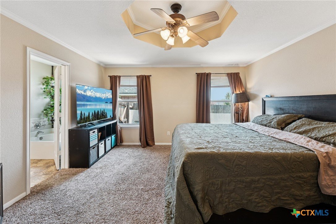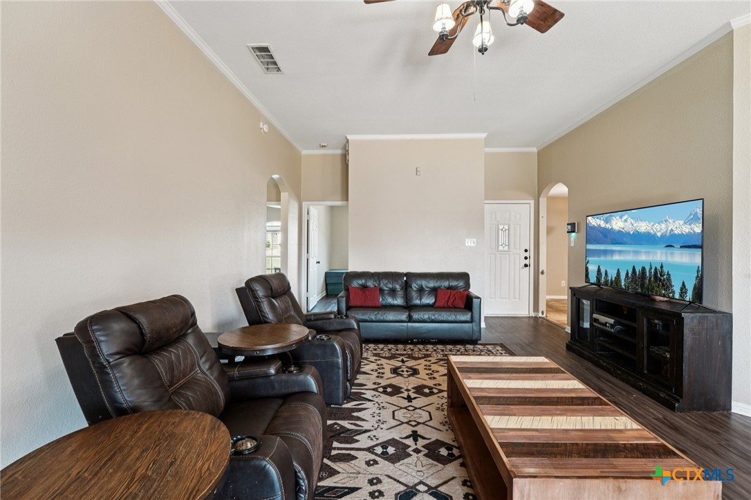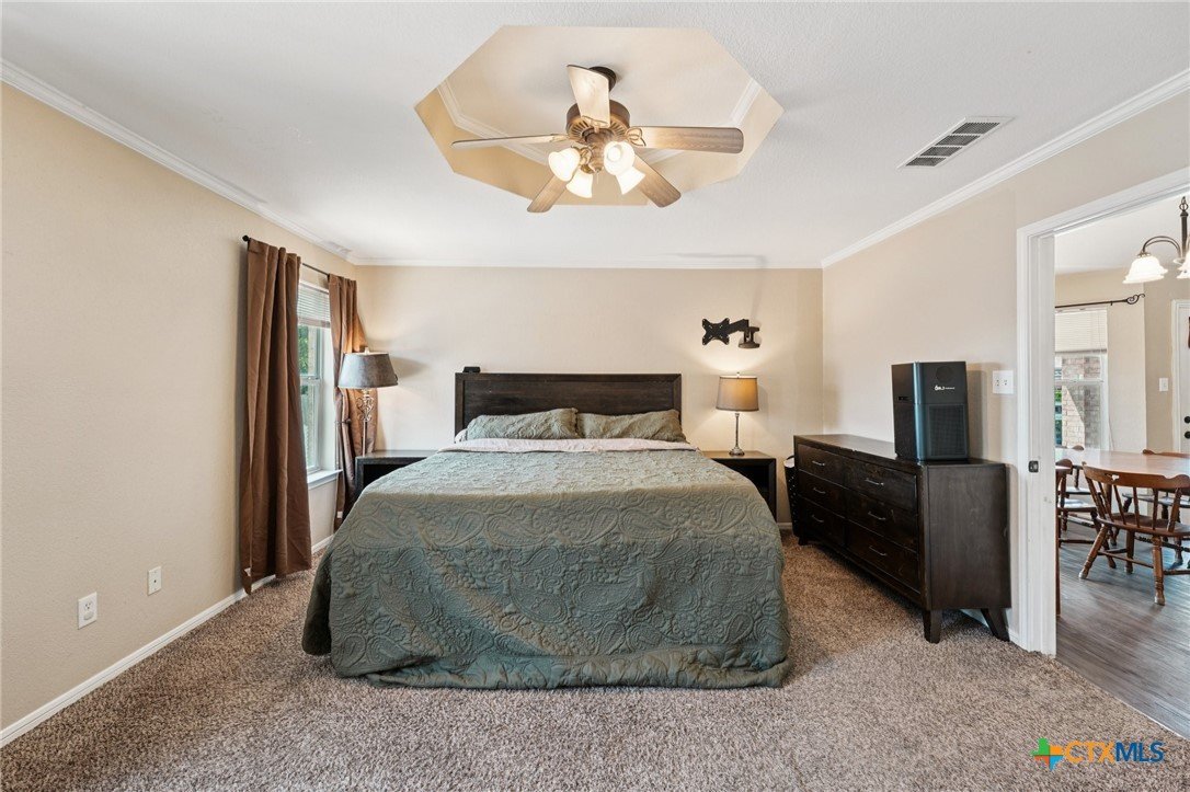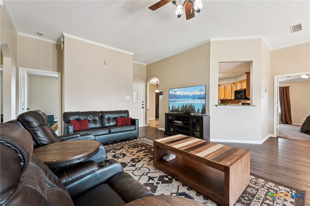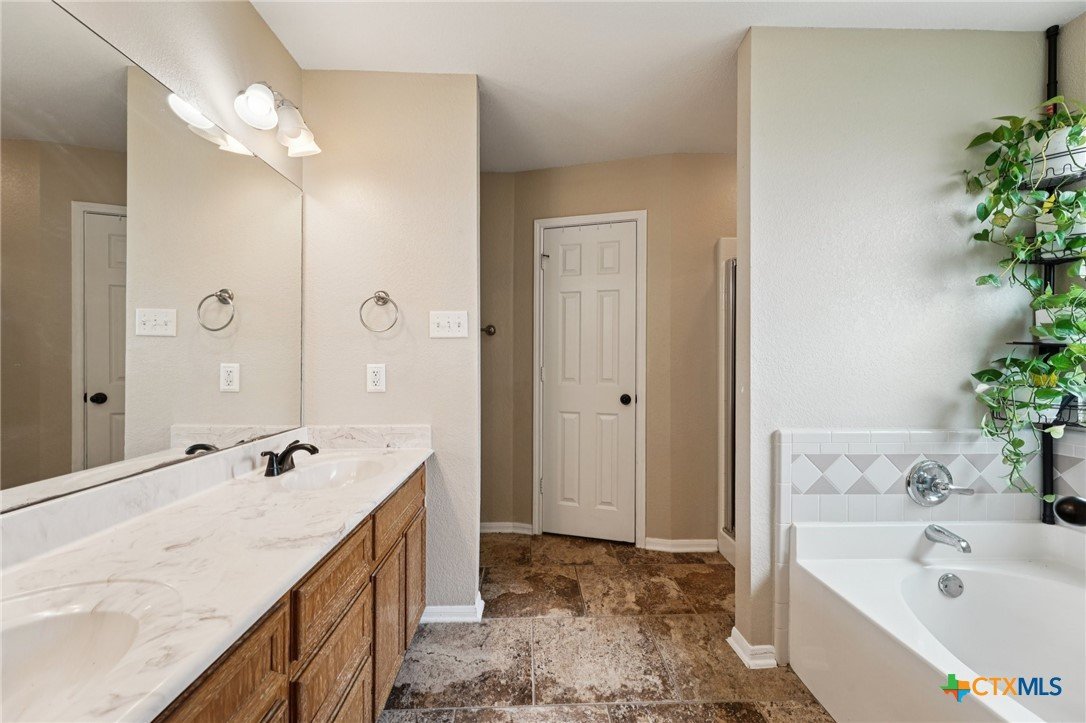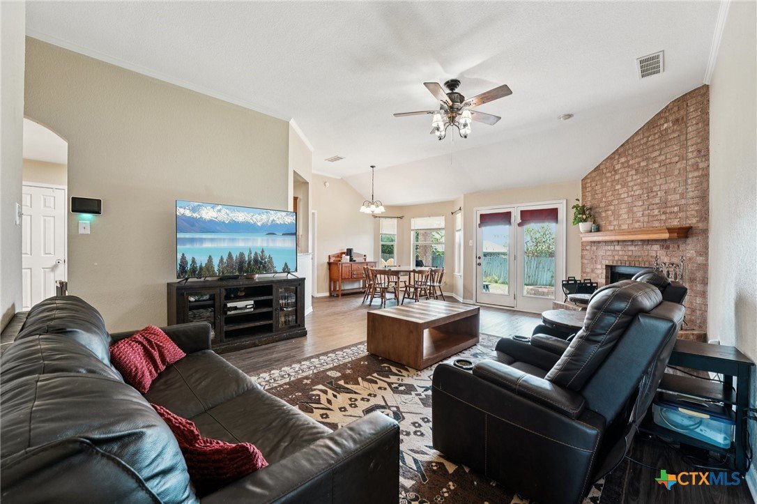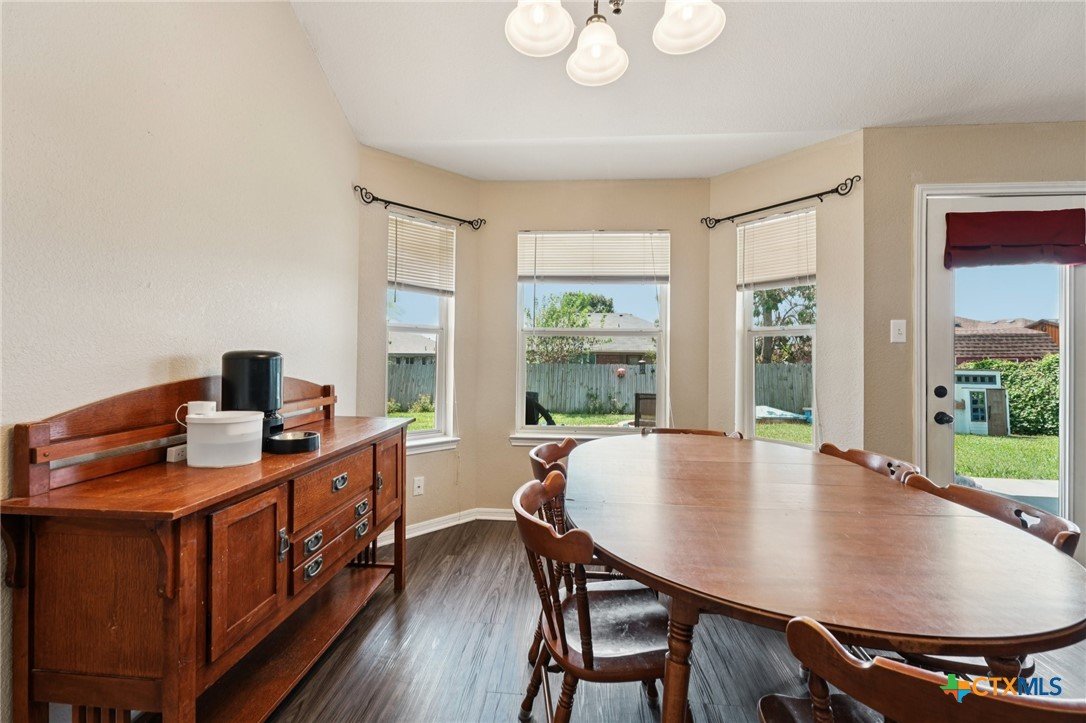 Spacious 4 bedroom, 2 bathroom home in Killeen with paid-off solar panels; current electric bill averages just $3 per month! Step inside to a warm and inviting living room featuring a stunning floor-to-ceiling brick wood-burning fireplace. The layout offers both a formal dining room and a bright eat-in kitchen with granite countertops, matching black appliances, and ample space for cooking and gathering. Durable vinyl flooring flows through the common areas, while the bathrooms are finished with easy-care tile flooring. The primary suite is a true retreat with a spacious en-suite featuring a double vanity, soaking tub, and walk-in shower. A separate laundry room adds extra convenience. Out back, relax under the covered patio with ceiling fan and extended concrete pad, perfect for entertaining. Enjoy evenings by the fire pit, with plenty of space for outdoor activities and room for pets to run and play. Close to schools, restaurants, and shopping! Just minutes from Fort Hood and a short drive to the Hill Country. Schedule your showing today!
