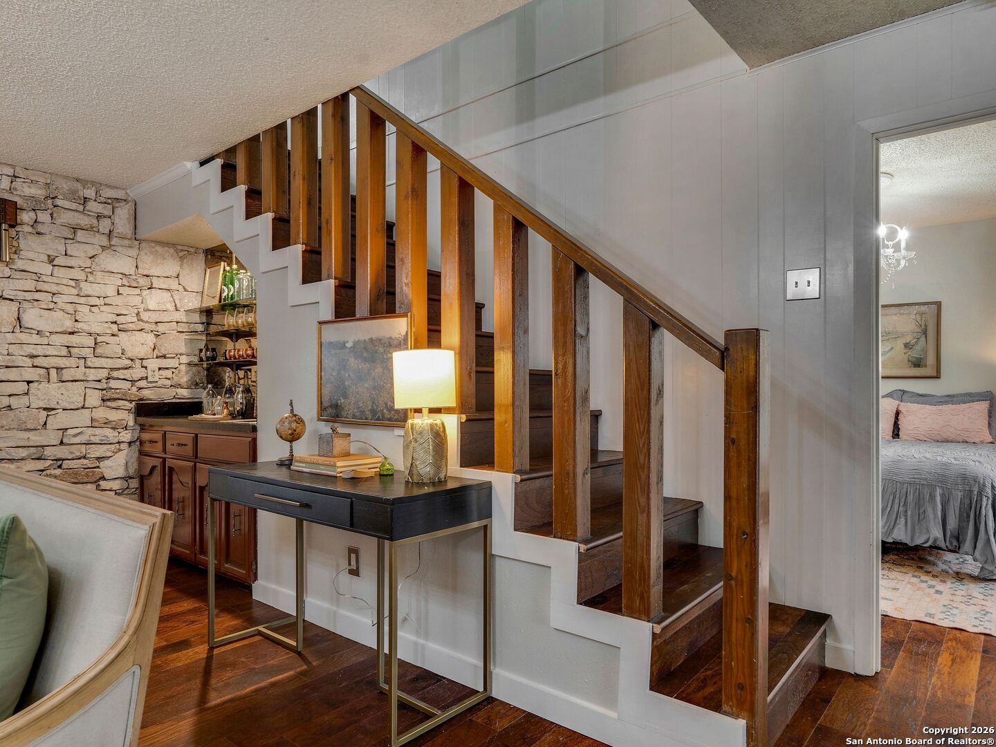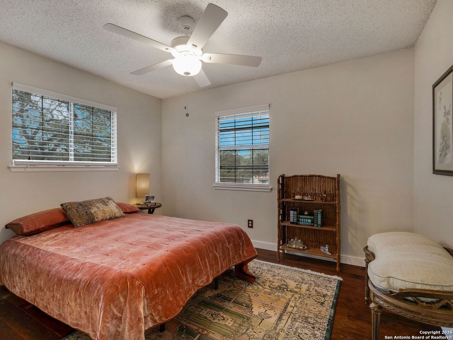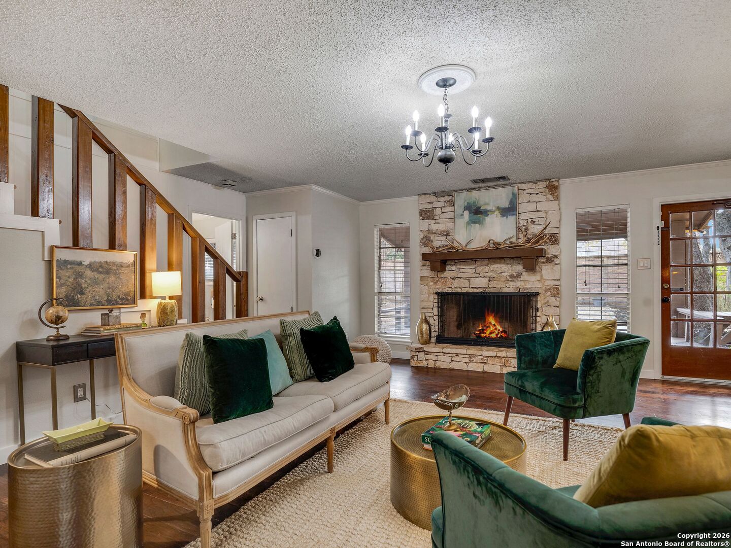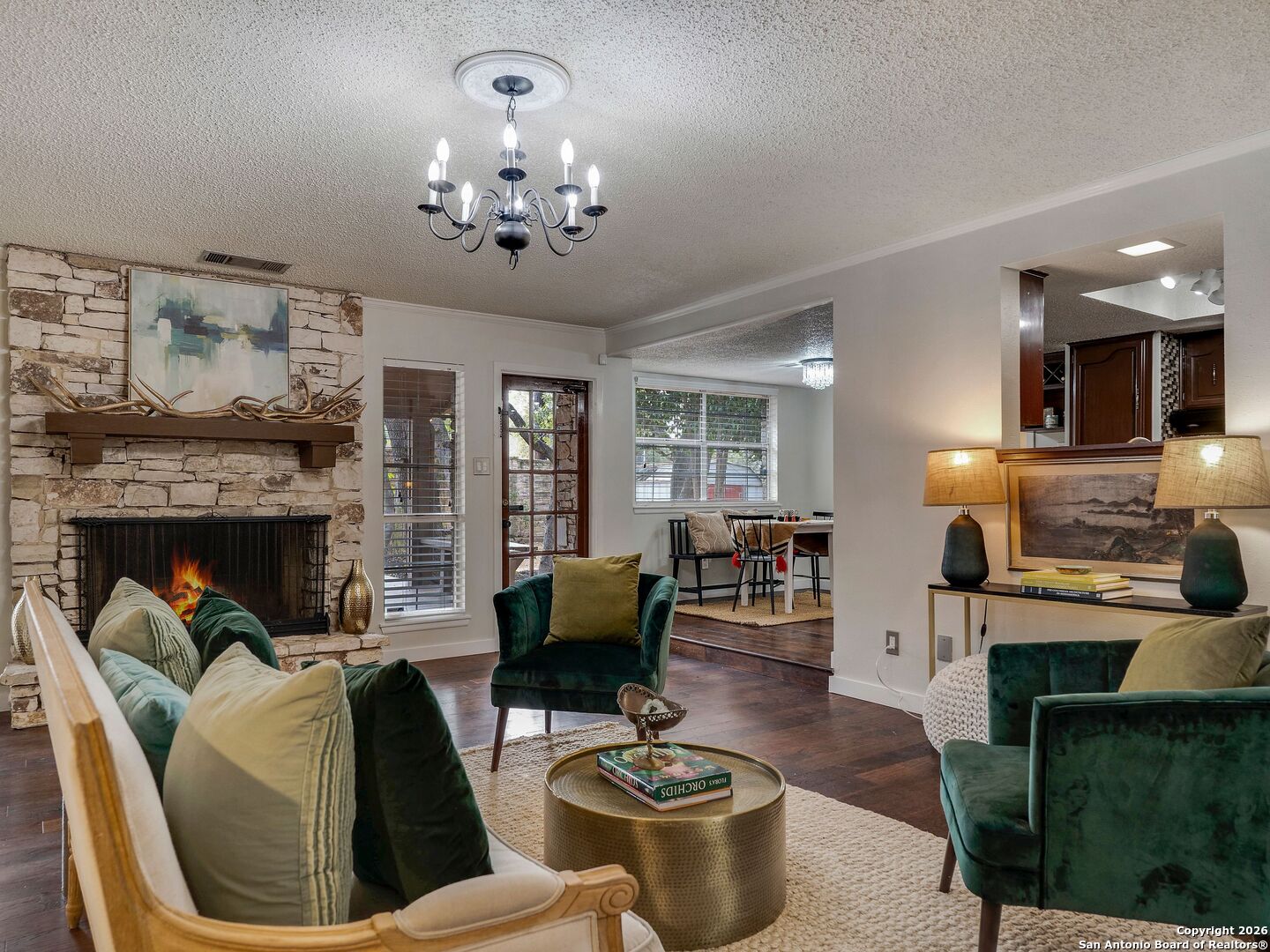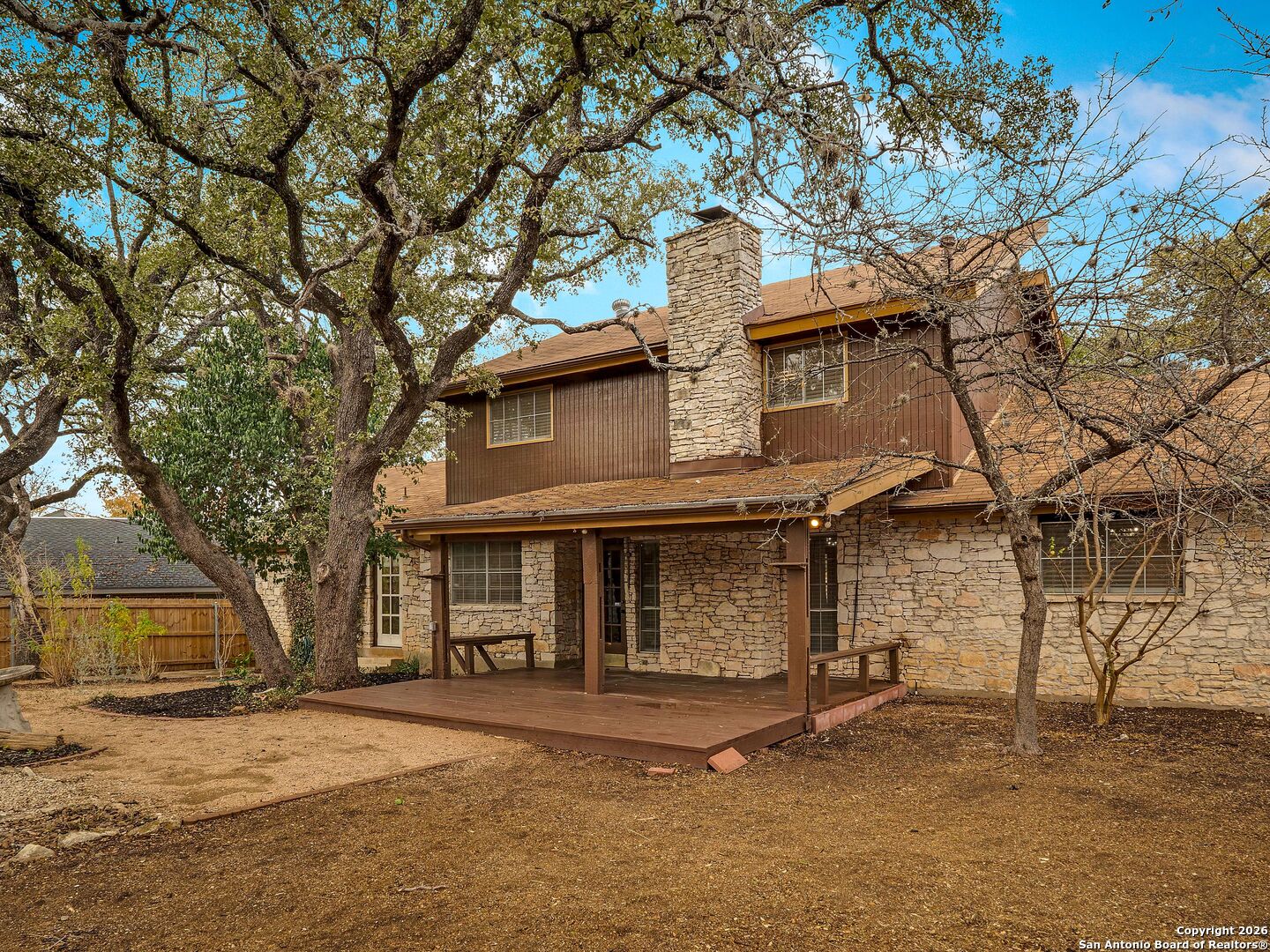 Tucked into the desirable Woods of Shavano, this warm and welcoming 4-bedroom, 2.5-bath home with a 2-car garage offers timeless character and comfortable living in a beautifully treed setting. You're greeted by a gracious foyer that opens into the living room, where a striking rock fireplace anchors the space, complemented by accent stone walls, open shelving, and a wet bar perfect for entertaining or cozy evenings at home. Hardwood floors flow throughout the entire home, adding continuity and warmth. The galley-style kitchen offers abundant cabinetry and counter space and opens to a charming breakfast room filled with natural light. Just beyond, the formal dining room features classic chair railing and a newer chandelier, making it ideal for both everyday meals and special gatherings. The primary suite is located downstairs, providing privacy and ease of living, and includes a walk-in closet, dual vanities with two sinks, and a tub/shower combination. Upstairs, a spacious landing creates the perfect spot for a reading nook or small office. Three additional bedrooms feature wood floors and ceiling fans, with at least two offering walk-in closets. The upstairs hall bath is generously sized with a large vanity, dual sinks, and a tub/shower combo. Out back, enjoy a covered patio shaded by mature trees, offering a peaceful outdoor retreat. This is a sweet, well-loved home in a sought-after neighborhood. Come see it and make it yours.