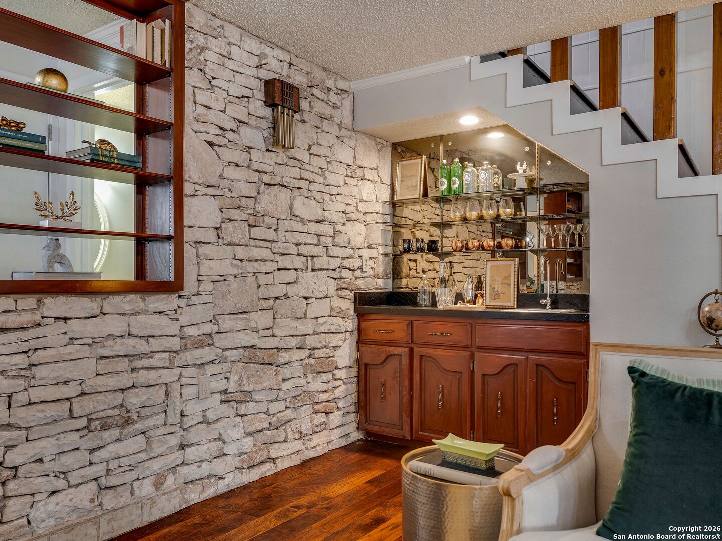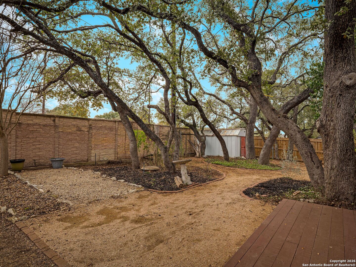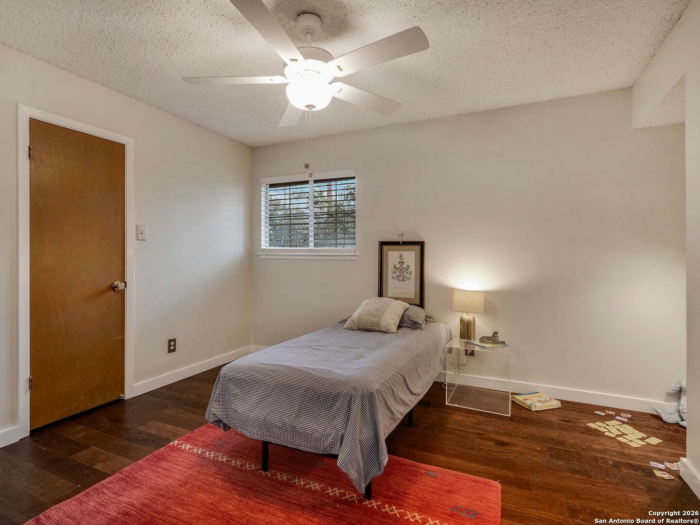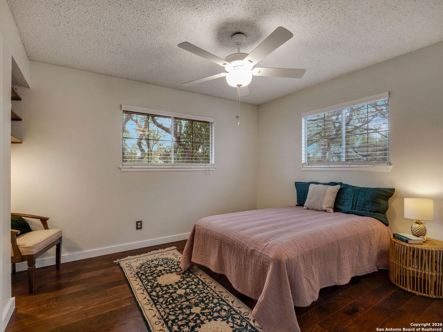 Tucked into the desirable Woods of Shavano, this warm and welcoming 4-bedroom, 2.5-bath home with a 2-car garage offers timeless character and comfortable living in a beautifully treed setting. You're greeted by a gracious foyer that opens into the living room, where a striking rock fireplace anchors the space, complemented by accent stone walls, open shelving, and a wet bar perfect for entertaining or cozy evenings at home. Hardwood floors flow throughout the entire home, adding continuity and warmth. The galley-style kitchen offers abundant cabinetry and counter space and opens to a charming breakfast room filled with natural light. Just beyond, the formal dining room features classic chair railing and a newer chandelier, making it ideal for both everyday meals and special gatherings. The primary suite is located downstairs, providing privacy and ease of living, and includes a walk-in closet, dual vanities with two sinks, and a tub/shower combination. Upstairs, a spacious landing creates the perfect spot for a reading nook or small office. Three additional bedrooms feature wood floors and ceiling fans, with at least two offering walk-in closets. The upstairs hall bath is generously sized with a large vanity, dual sinks, and a tub/shower combo. Out back, enjoy a covered patio shaded by mature trees, offering a peaceful outdoor retreat. This is a sweet, well-loved home in a sought-after neighborhood. Come see it and make it yours.