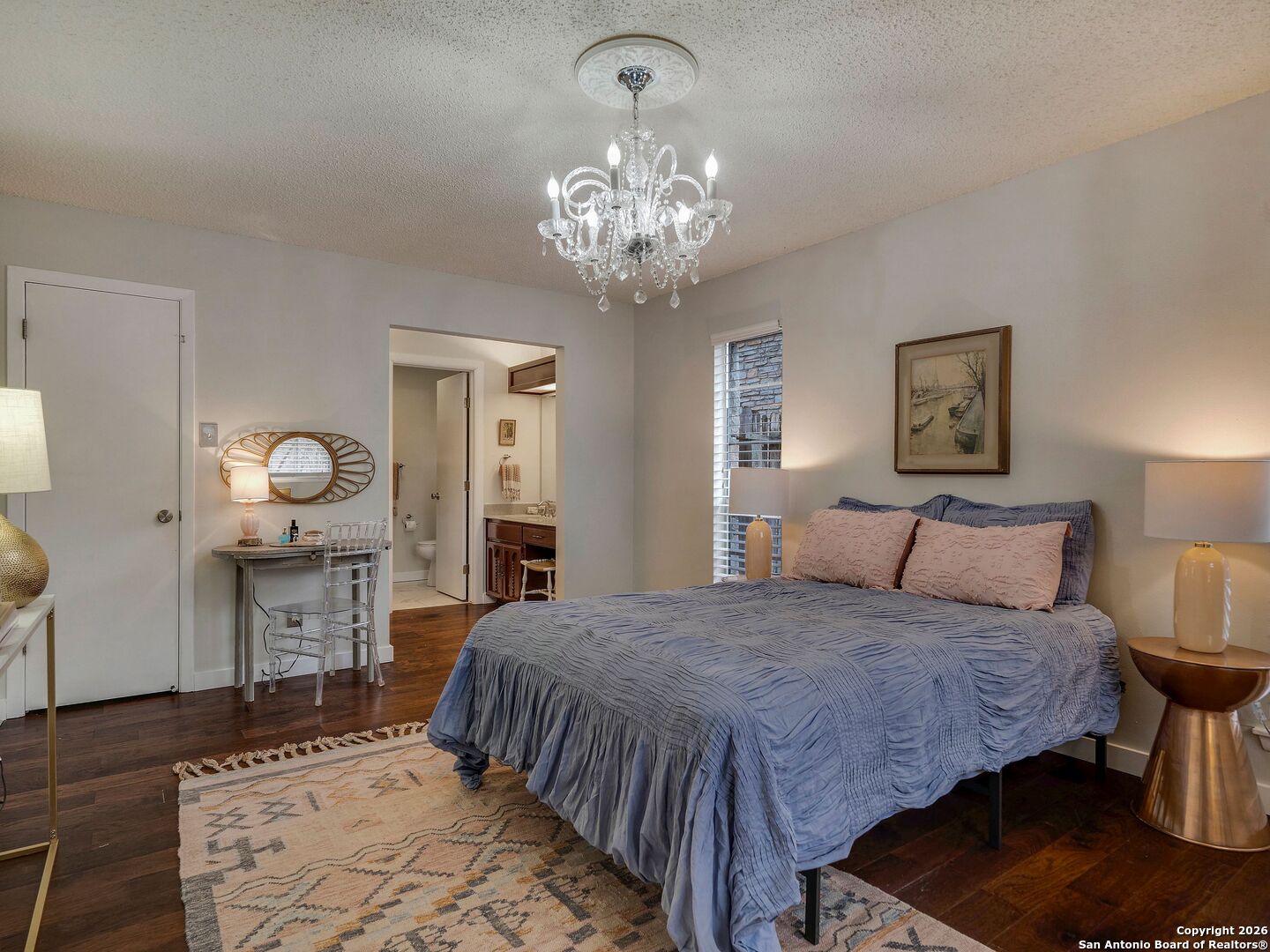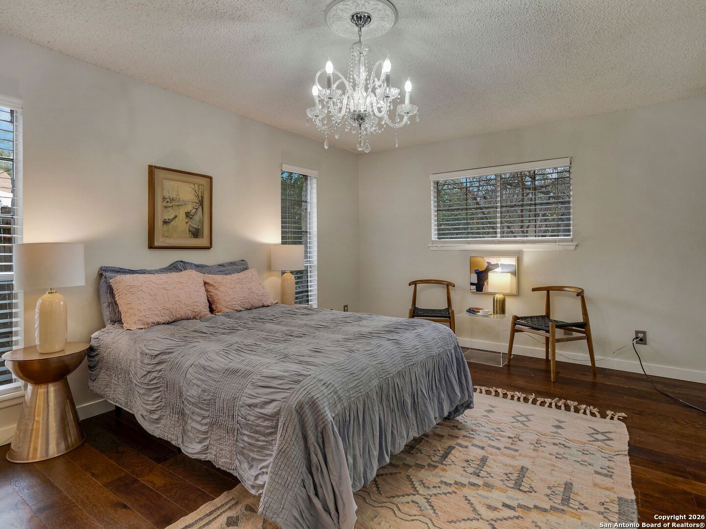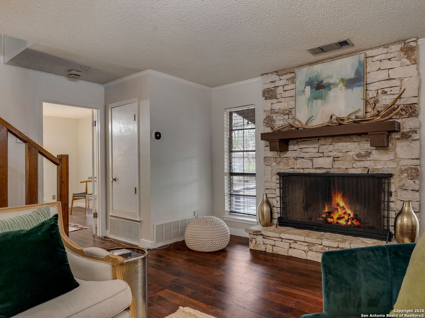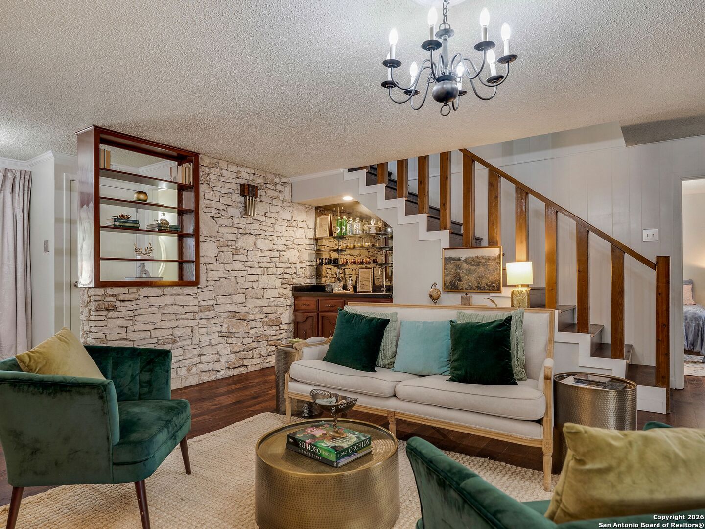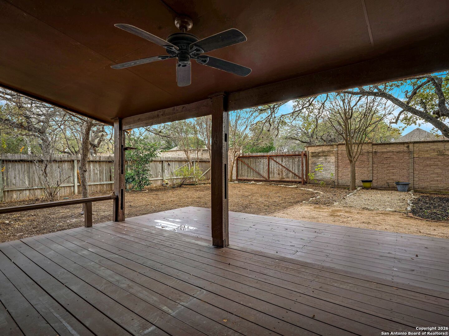 Tucked into the desirable Woods of Shavano, this warm and welcoming 4-bedroom, 2.5-bath home with a 2-car garage offers timeless character and comfortable living in a beautifully treed setting. You're greeted by a gracious foyer that opens into the living room, where a striking rock fireplace anchors the space, complemented by accent stone walls, open shelving, and a wet bar perfect for entertaining or cozy evenings at home. Hardwood floors flow throughout the entire home, adding continuity and warmth. The galley-style kitchen offers abundant cabinetry and counter space and opens to a charming breakfast room filled with natural light. Just beyond, the formal dining room features classic chair railing and a newer chandelier, making it ideal for both everyday meals and special gatherings. The primary suite is located downstairs, providing privacy and ease of living, and includes a walk-in closet, dual vanities with two sinks, and a tub/shower combination. Upstairs, a spacious landing creates the perfect spot for a reading nook or small office. Three additional bedrooms feature wood floors and ceiling fans, with at least two offering walk-in closets. The upstairs hall bath is generously sized with a large vanity, dual sinks, and a tub/shower combo. Out back, enjoy a covered patio shaded by mature trees, offering a peaceful outdoor retreat. This is a sweet, well-loved home in a sought-after neighborhood. Come see it and make it yours.
