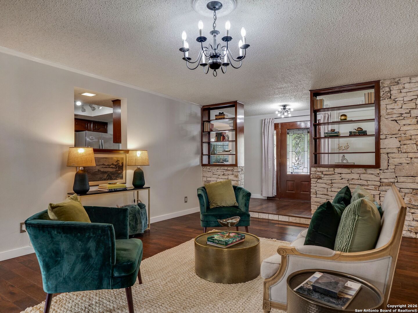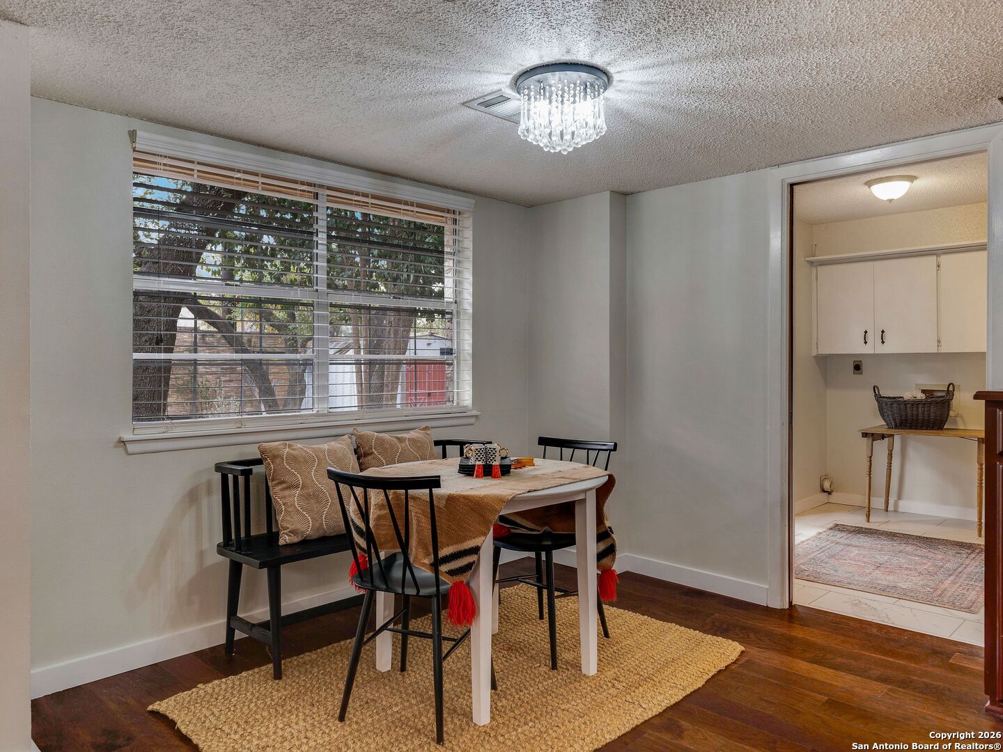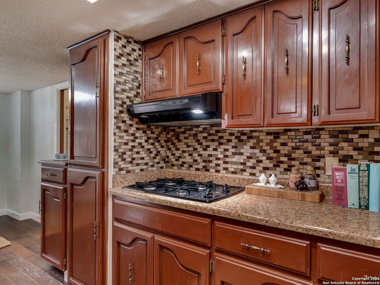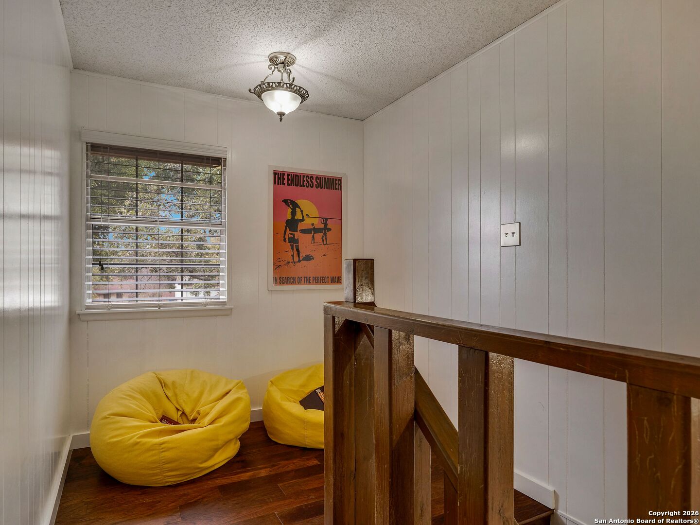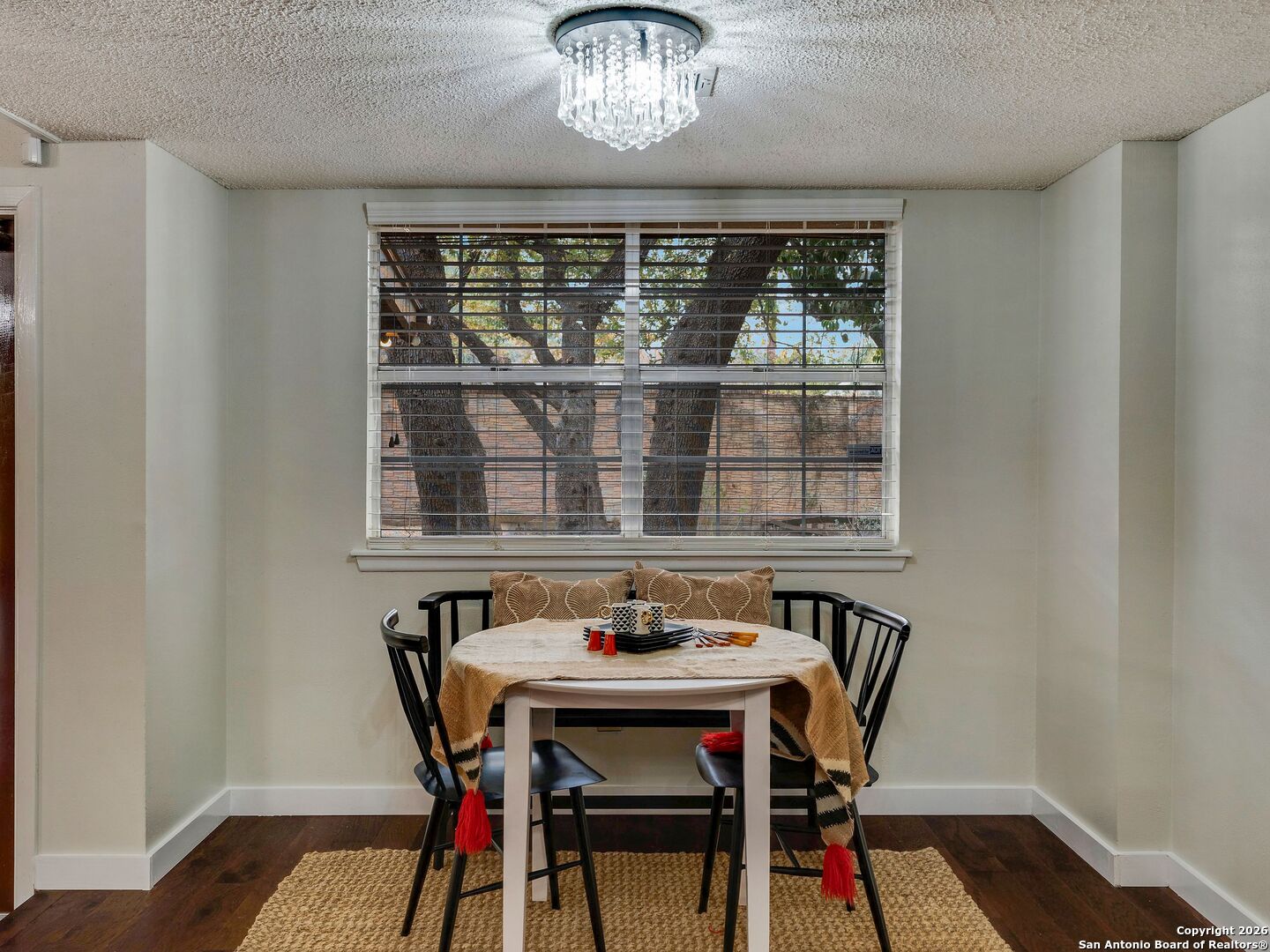 Tucked into the desirable Woods of Shavano, this warm and welcoming 4-bedroom, 2.5-bath home with a 2-car garage offers timeless character and comfortable living in a beautifully treed setting. You're greeted by a gracious foyer that opens into the living room, where a striking rock fireplace anchors the space, complemented by accent stone walls, open shelving, and a wet bar perfect for entertaining or cozy evenings at home. Hardwood floors flow throughout the entire home, adding continuity and warmth. The galley-style kitchen offers abundant cabinetry and counter space and opens to a charming breakfast room filled with natural light. Just beyond, the formal dining room features classic chair railing and a newer chandelier, making it ideal for both everyday meals and special gatherings. The primary suite is located downstairs, providing privacy and ease of living, and includes a walk-in closet, dual vanities with two sinks, and a tub/shower combination. Upstairs, a spacious landing creates the perfect spot for a reading nook or small office. Three additional bedrooms feature wood floors and ceiling fans, with at least two offering walk-in closets. The upstairs hall bath is generously sized with a large vanity, dual sinks, and a tub/shower combo. Out back, enjoy a covered patio shaded by mature trees, offering a peaceful outdoor retreat. This is a sweet, well-loved home in a sought-after neighborhood. Come see it and make it yours.