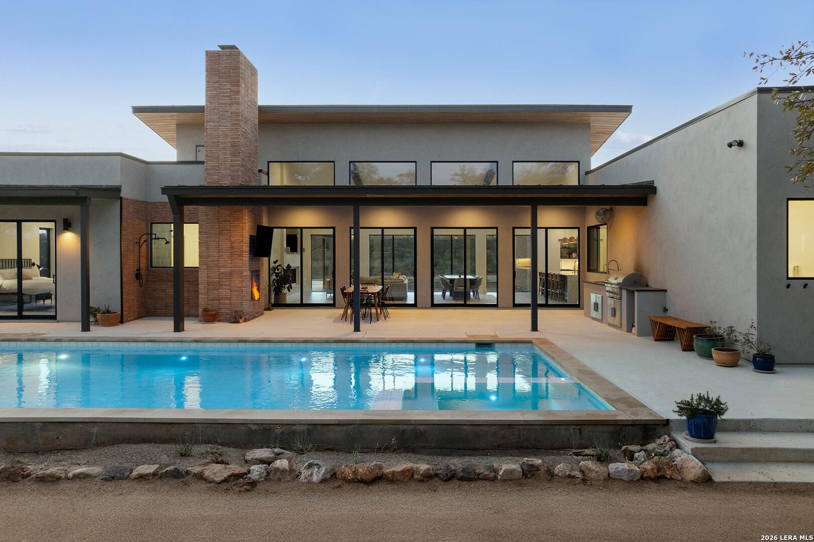 Welcome to an extraordinary private retreat in the heart of Texas Wine Country, where modern architecture meets the timeless beauty of the Hill Country-just one hour from Austin. With coveted Pedernales River access, this exceptional estate offers a rare balance of refined seclusion, boundless outdoor adventure, and income potential. Completed in 2023, the 3,100+/- sq.ft. contemporary residence is thoughtfully designed in a timeless double-wing floor plan, featuring 4 bedrooms, 3.5 baths, and remarkable indoor-outdoor living. Walls of windows throughout the great room infuse the home in natural light while framing sweeping vistas of the surrounding landscape. At the heart of the home, this gourmet kitchen is a true showpiece, appointed with GE Monogram commercial-grade appliances, a striking waterfall island with seating for 6, expansive workstation sink, an oversized walk-in pantry, elegant wine refrigeration towers, and a custom pet hydration station-perfect for both everyday living and elevated entertaining. The residence offers dual primary suites for ultimate privacy and flexibility, along with a third guest suite and a fourth bedroom ideal for an executive office, studio, or playroom. The Owner's Retreat is a serene sanctuary, highlighted by a private veranda, custom walk-in closet with direct laundry room access and stunning spa-inspired bath featuring a volcanic limestone soaking tub and glass-enclosed wet area. Outdoors, the estate unfolds like a private resort. An oversized lounge pool, jetted spa, and outdoor shower invite relaxation beneath wide Texas skies, while the D'Hanis brick fireplace and outdoor television create an unforgettable setting for al fresco dining and evening gatherings. This offering is enhanced with access and ownership in a 5 acre tract of land stretching 850+/- along the Pedernales River, carved over ancient limestone shelves and canopied with mature cypress trees. Coupled with free ranging axis, whitetail, turkey, and rare exotics that commonly meander through heritage oaks, this acreage is truly an ideal setup for outdoor enthusiasts who wish to hunt, fish or simply enjoy nature at its finest. Impressive and thoughtful infrastructure include an all-weather road, underground power, 2 rainwater harvesting systems along with 2 private wells. Additionally, the property benefits from a current wildlife exemption and no oversight of an HOA. Ideally located just 20 minutes from the shops and dining of Fredericksburg's iconic Main Street, within walking distance to renowned wineries, the historic LBJ Ranch, this one-of-a-kind property offers a rare opportunity to own a modern Hill Country sanctuary where luxury, land, and lifestyle converge.