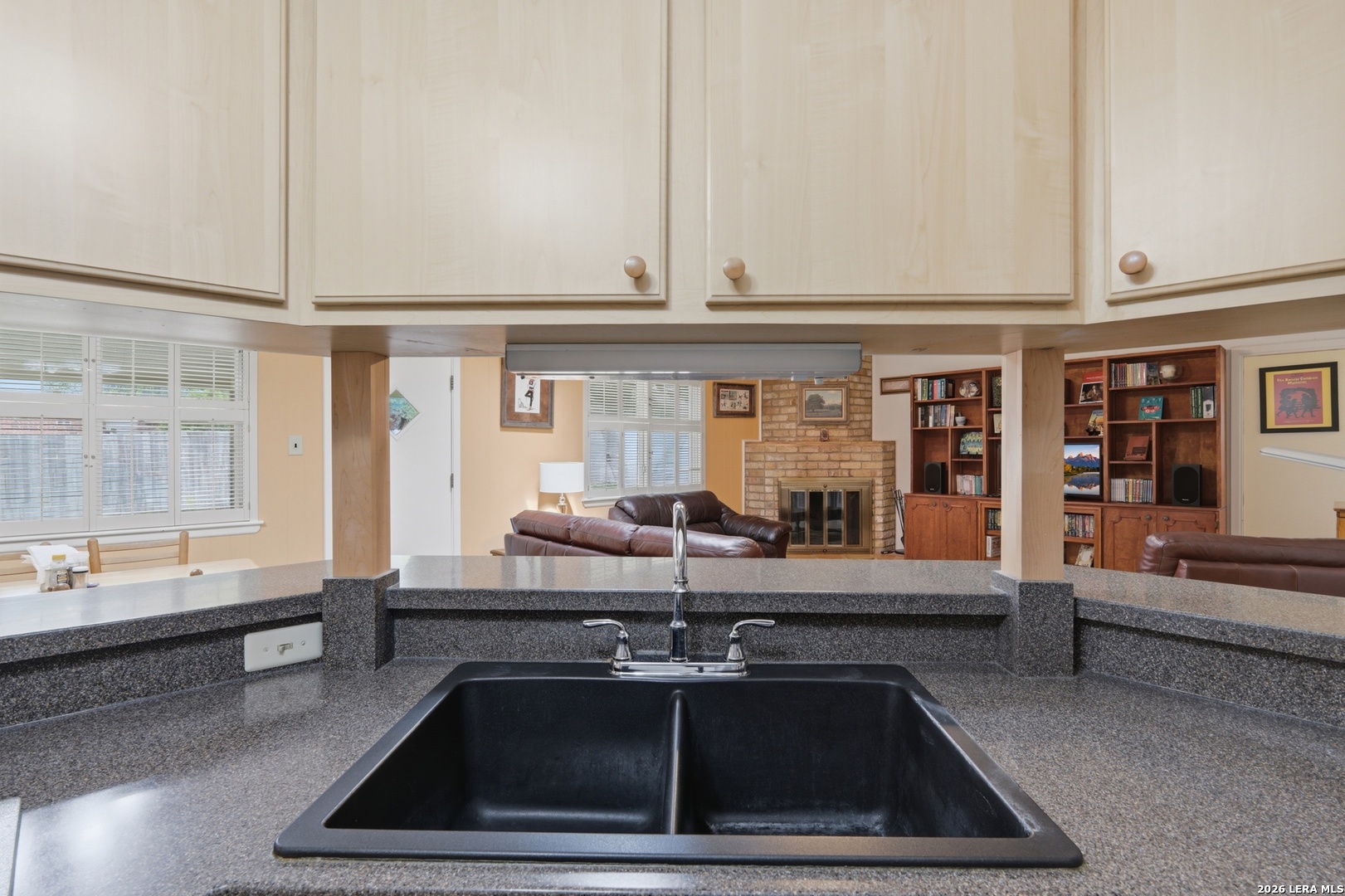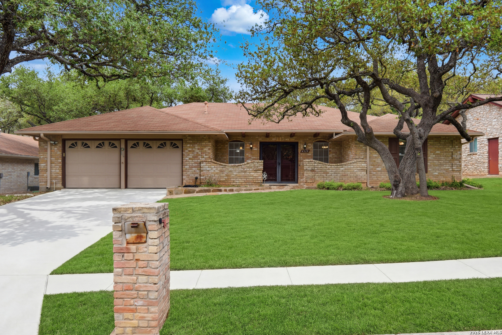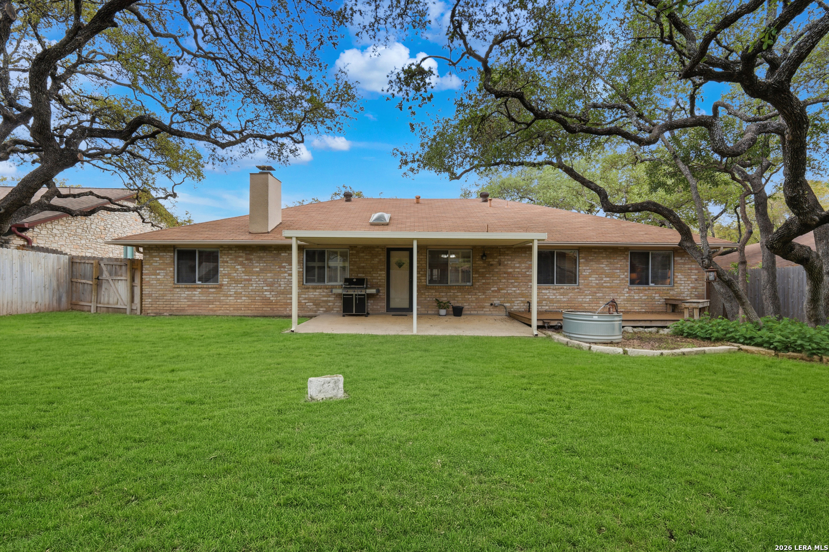 Welcome to Maybrook Woods, a four sided masonry single story in the popular Woods of Shavano on a lovely 75x120 lot with mature oak trees. Near restaurants, shopping, schools, USAA, Medical Center, Valero and UTSA. To top that off there is a neighborhood pool, park, playground and tennis court with a voluntary HOA. Take a peek inside and you will find a unique custom built Smith home. The spacious family room greets you with a vaulted ceiling, exposed wood beams, a fireplace and skylight. The huge master bedroom has a lovely brick wall feature and room for a sitting area. Lots of privacy for all as this floor plan has a split-bedroom arrangement. Enjoy your backyard oasis , BBQ and sit and watch the birds visit the recirculating water feature and flower garden. There is plenty of room to spread out with the oversized deck, covered patio (2016) and a large grill with a natural gas connection. Life is easy with the wood privacy fence (2024), full sprinkler system and the lovely flagstone walkway (2016).This home is move in ready while also offering a great opportunity for buyers to personalize and make it their own; the home has been very well maintained by the owners, roof replaced (2016), garage floor (2016) and trees trimmed (2025).