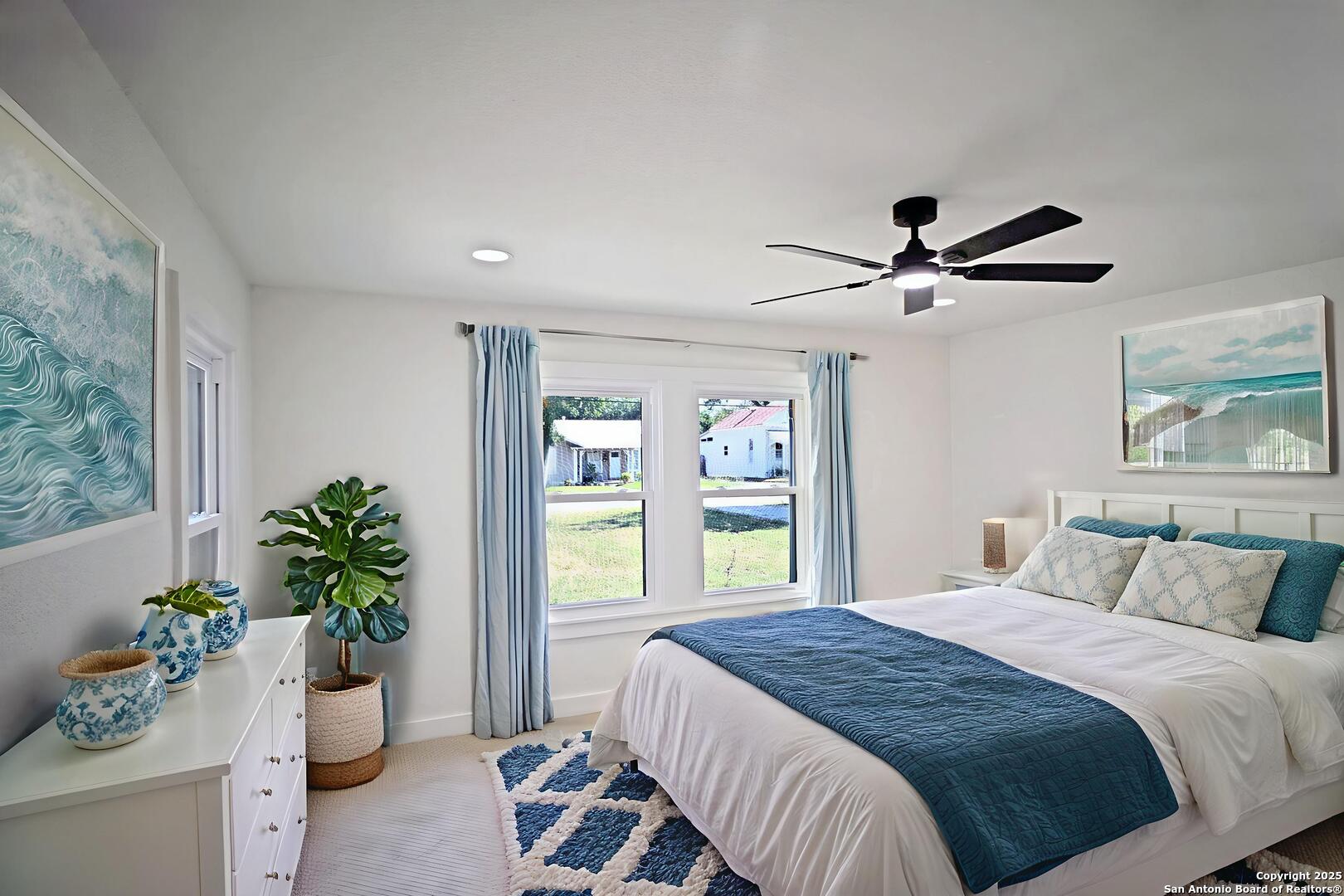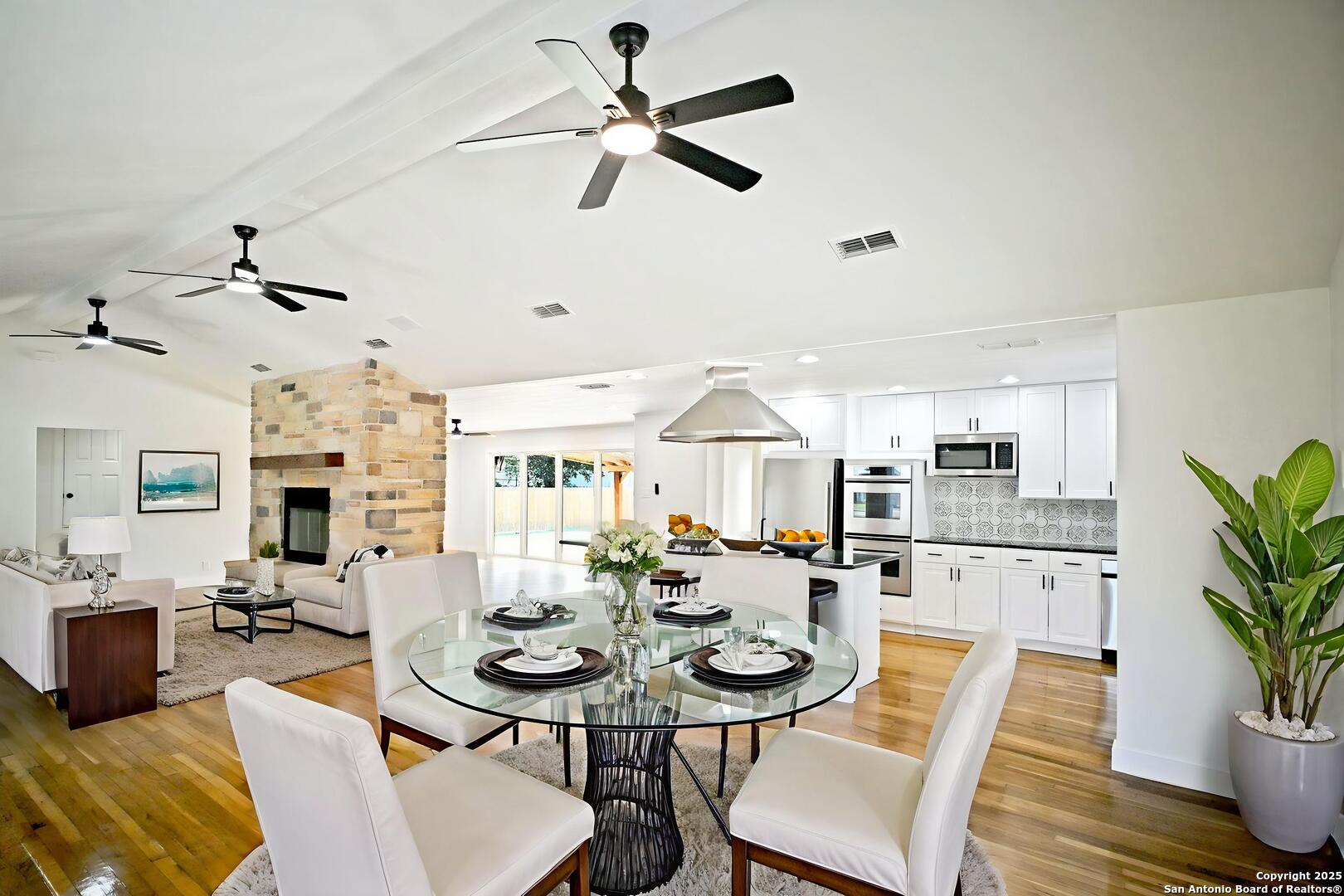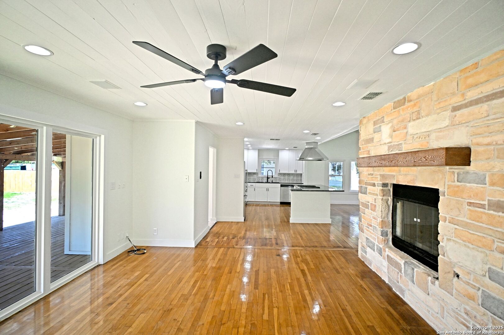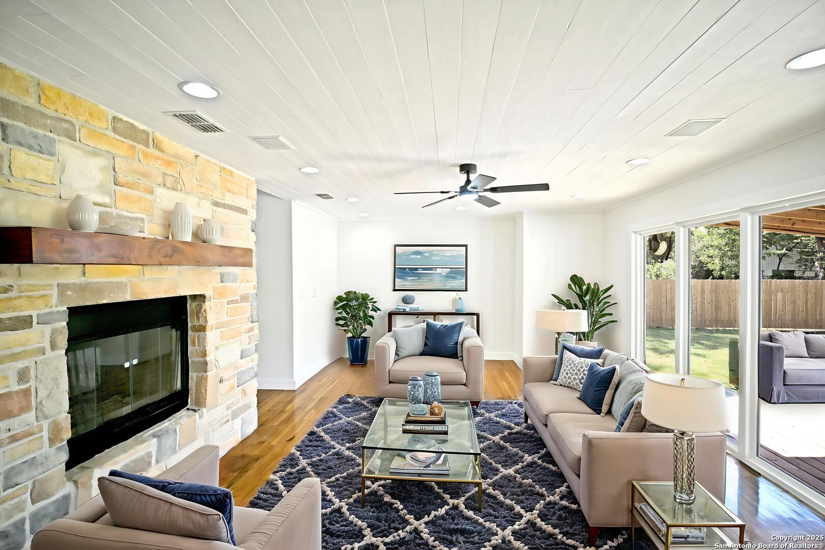 Walk on up along the paved path to this beautifully updated 2 bed/2 bath mid-century home with front covered porch. Be at awe at the marvelously polished hardwood flooring that cascades throughout the living space floor plan. Cozy up to the wood burning double sided masonry fireplace maximizing indoor space comfort. The stylish island kitchen features gas range cooktop, overhead vent hood, stainless steel appliances, and decorative tile backsplash. 1 of the 2 bedrooms comes with carpeting and down the hall from those bedrooms is a full bath with scalloped designed tile in the shower/tub combo. Enter into the primary bedroom suite with luxurious bathroom, tiled walk-in shower, and walk-in closet with built-in shelving. Relax outside in the spacious backyard and enjoy the views from the wooden covered back porch. This property is within minutes of the bustling Downtown New Braunfels and many local amenities. Some photos are virtually staged.