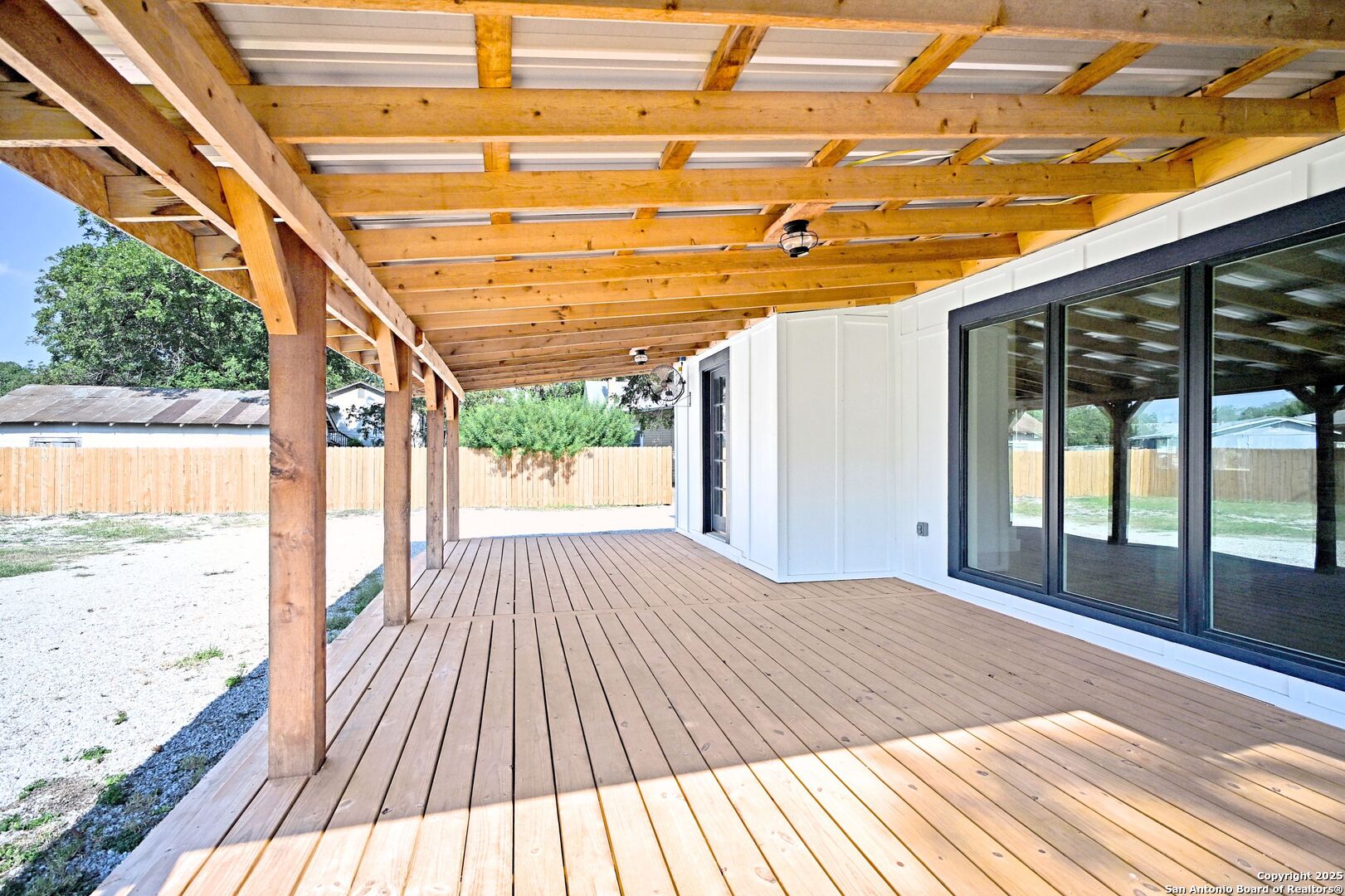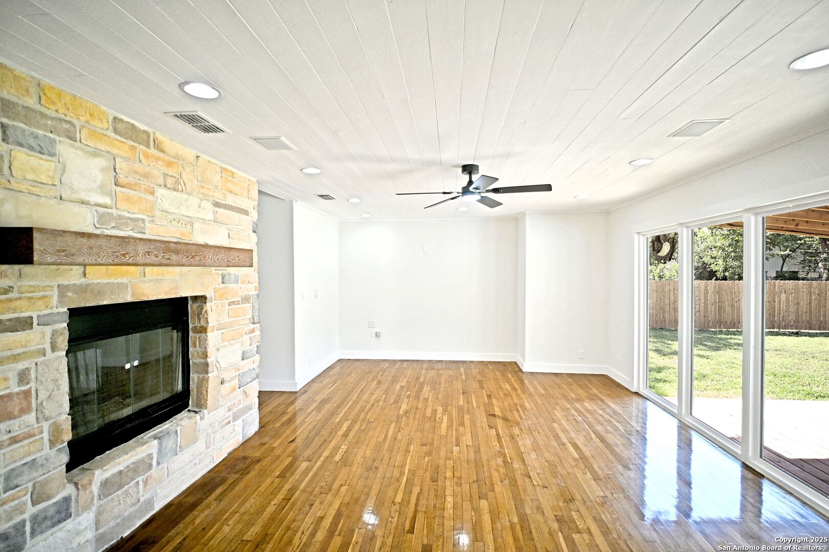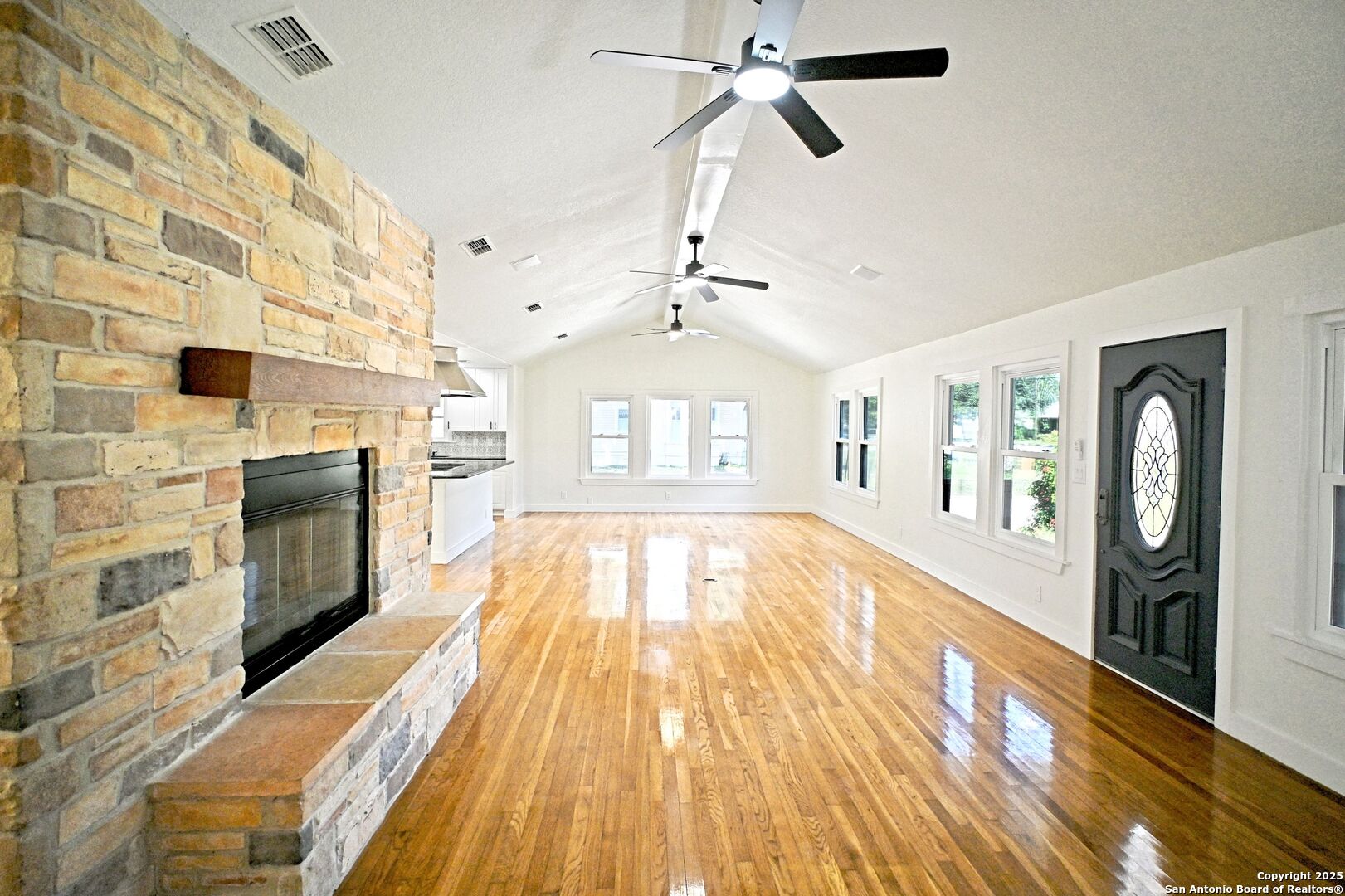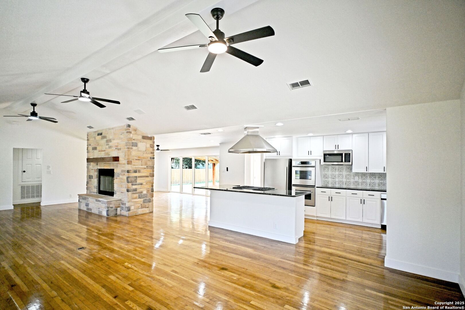 Walk on up along the paved path to this beautifully updated 2 bed/2 bath mid-century home with front covered porch. Be at awe at the marvelously polished hardwood flooring that cascades throughout the living space floor plan. Cozy up to the wood burning double sided masonry fireplace maximizing indoor space comfort. The stylish island kitchen features gas range cooktop, overhead vent hood, stainless steel appliances, and decorative tile backsplash. 1 of the 2 bedrooms comes with carpeting and down the hall from those bedrooms is a full bath with scalloped designed tile in the shower/tub combo. Enter into the primary bedroom suite with luxurious bathroom, tiled walk-in shower, and walk-in closet with built-in shelving. Relax outside in the spacious backyard and enjoy the views from the wooden covered back porch. This property is within minutes of the bustling Downtown New Braunfels and many local amenities. Some photos are virtually staged.